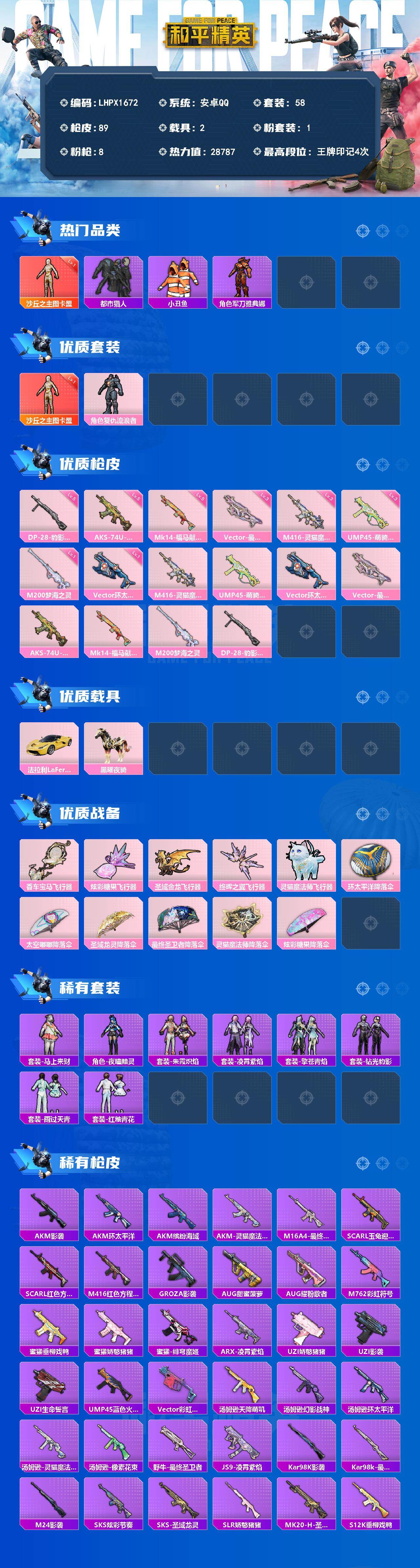 [17767436]【特价出售/店主推荐】安卓 手Q-1神装-1粉装-8特效枪-2载具-6粉色飞行器-28787热力值-4王牌印记-58套装-89枪皮 【红色神装等级】:沙丘之主-图卡盟(一级) 【红色角色神装】:沙丘之主-图卡盟 【热门品类】:套装-都市猎人,套装-小丑鱼,角色-军刀雅典娜 【粉色套装】:角色-复仇流浪者 【粉色枪皮等级】:M416-灵猫魔法师(三级),UMP45-萌骑冒险(三级),Vector-环太平洋(一级),Vector-最终圣卫者(三级),AKS-74U-森灵之息(五级),Mk14-福马献瑞(五级),M200-梦海之灵(一级),DP-28-豹影疾电(五级) 【粉色载具】:法拉利LaFerrari(摩德纳黄),黑曜夜骑 【粉色枪皮】:M416-灵猫魔法师,UMP45-萌骑冒险,Vector-环太平洋,Vector-最终圣卫者,AKS-74U-森灵之息,Mk14-福马献瑞,M200-梦海之灵,DP-28-豹影疾电 【粉色飞行器】:香车宝马飞行器,炫彩糖果飞行器,圣域金龙飞行器,终晖之翼飞行器,灵猫魔法师飞行器 【粉色降落伞】:环太平洋降落伞,太空嘟嘟降落伞,圣域龙灵降落伞,最终圣卫者降落伞,灵猫魔法师降落伞,炫彩糖果降落伞 【稀有套装】:套装-马上来财,角色-夜瞳黯灵,套装-朱霞炽焰,套装-凌霄紫焰,套装-擎苍青焰,套装-钻光豹影,套装-雨过天青,套装-红釉青花 【稀有枪皮】:AKM-影袭,AKM-环太平洋,AKM-缤纷海域,AKM-灵猫魔法师,M16A4-最终圣卫者,SCAR-L-玉兔迎春,SCAR-L-红色方程式,M416-红色方程式,GROZA-影袭,AUG-甜蜜菠萝,AUG-耀粉歌者,M762-彩虹符号,蜜獾-垂柳戏鸭,蜜獾-娇憨猪猪,蜜獾-绯穹魔姬,ARX-凌霄紫焰,UZI-娇憨猪猪,UZI-影袭,UZI-生命誓言,UMP45-蓝色火焰,Vector-彩虹符号,汤姆逊-天降萌叽,汤姆逊-幻影战神,汤姆逊-环太平洋,汤姆逊-灵猫魔法师,汤姆逊-像素花束,野牛-最终圣卫者,JS9-凌霄紫焰,Kar98K-影袭,Kar98k-最终圣卫者,M24-影袭,SKS-炫彩节奏,SKS-圣域龙灵,SLR-娇憨猪猪,MK20-H-圣域龙灵,S12K-垂柳戏鸭,S12K-娇憨猪猪,DBS-第五大道,M249-沙丘之主,M249-破晓战魂,MG-36-凌霄紫焰,P92-凌霄