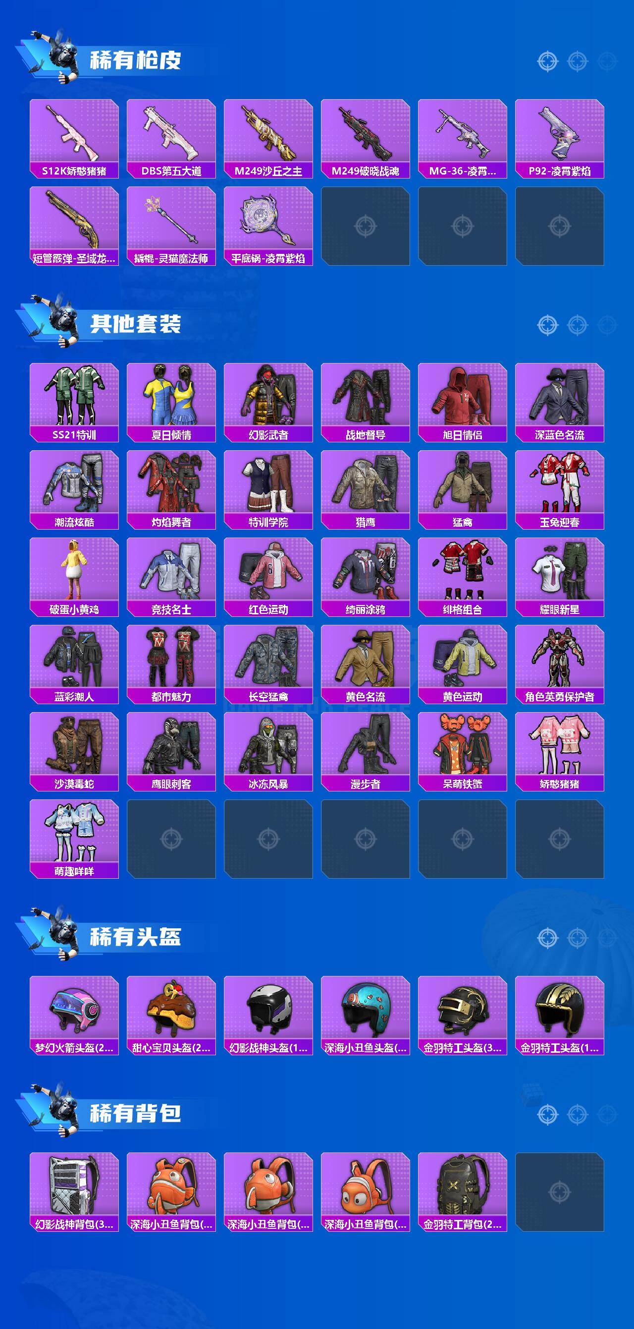 【稀有枪皮】:AKM-影袭,AKM-环太平洋,AKM-缤纷海域,AKM-灵猫魔法师,M16A4-最终圣卫者,SCAR-L-玉兔迎春,SCAR-L-红色方程式,M416-红色方程式,GROZA-影袭,AUG-甜蜜菠萝,AUG-耀粉歌者,M762-彩虹符号,蜜獾-垂柳戏鸭,蜜獾-娇憨猪猪,蜜獾-绯穹魔姬,ARX-凌霄紫焰,UZI-娇憨猪猪,UZI-影袭,UZI-生命誓言,UMP45-蓝色火焰,Vector-彩虹符号,汤姆逊-天降萌叽,汤姆逊-幻影战神,汤姆逊-环太平洋,汤姆逊-灵猫魔法师,汤姆逊-像素花束,野牛-最终圣卫者,JS9-凌霄紫焰,Kar98K-影袭,Kar98k-最终圣卫者,M24-影袭,SKS-炫彩节奏,SKS-圣域龙灵,SLR-娇憨猪猪,MK20-H-圣域龙灵,S12K-垂柳戏鸭,S12K-娇憨猪猪,DBS-第五大道,M249-沙丘之主,M249-破晓战魂,MG-36-凌霄紫焰,P92-凌霄