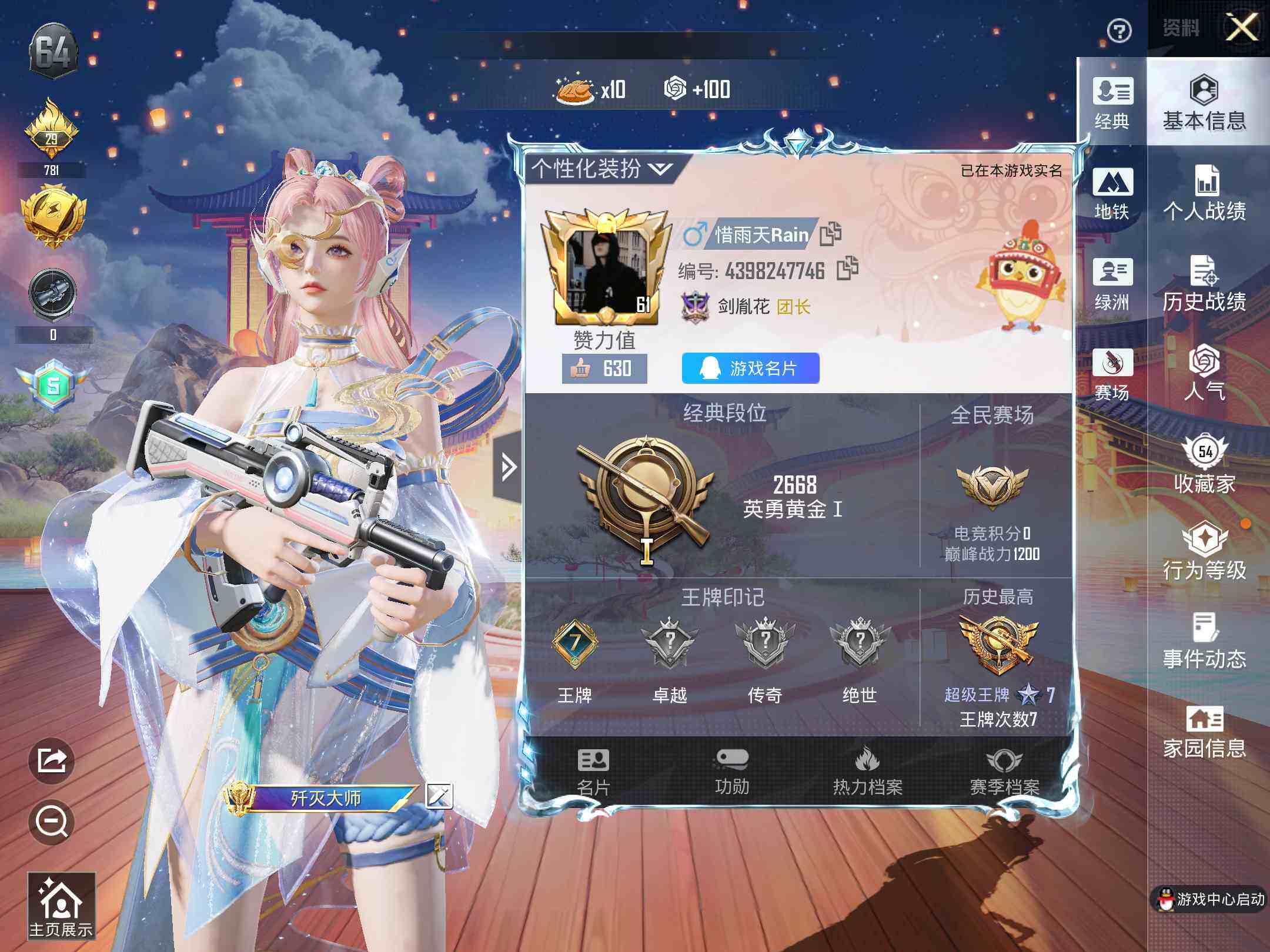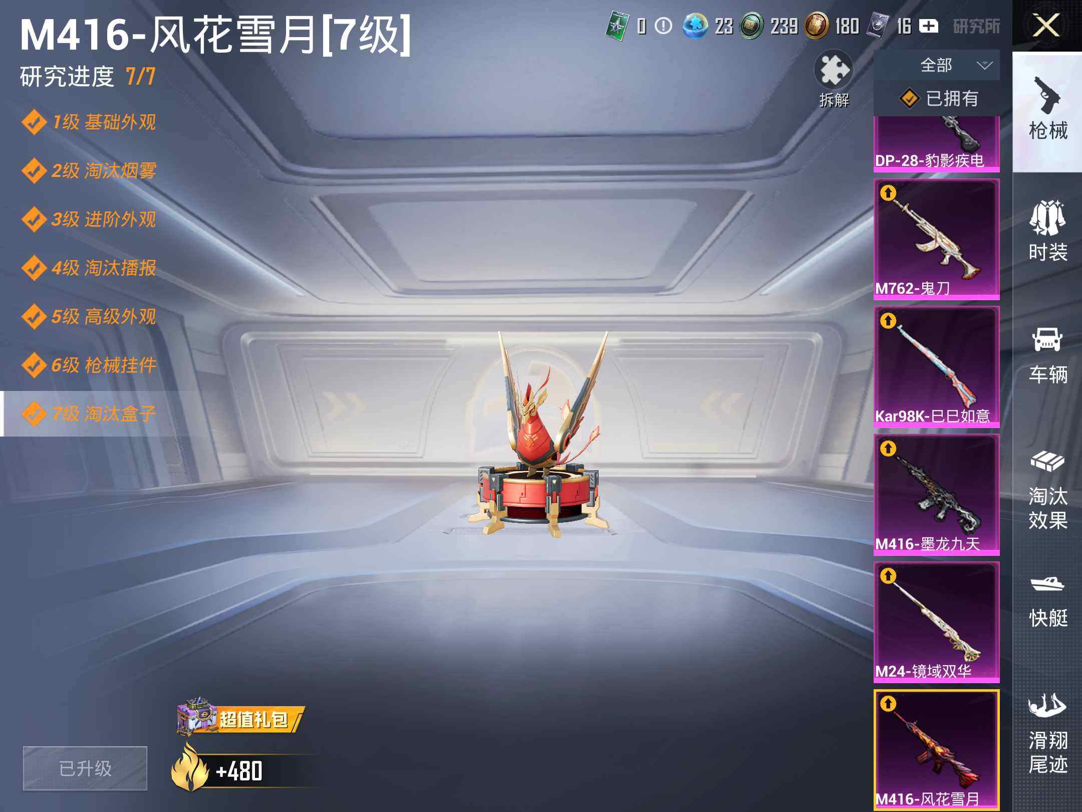 【粉色枪皮等级】:M416-风花雪月(七级),M416-墨龙九天(三级),M762-鬼刀(五级),Kar98K-巳巳如意(五级),M24-镜域双华(三级),DP-28-豹影疾电(五级)
