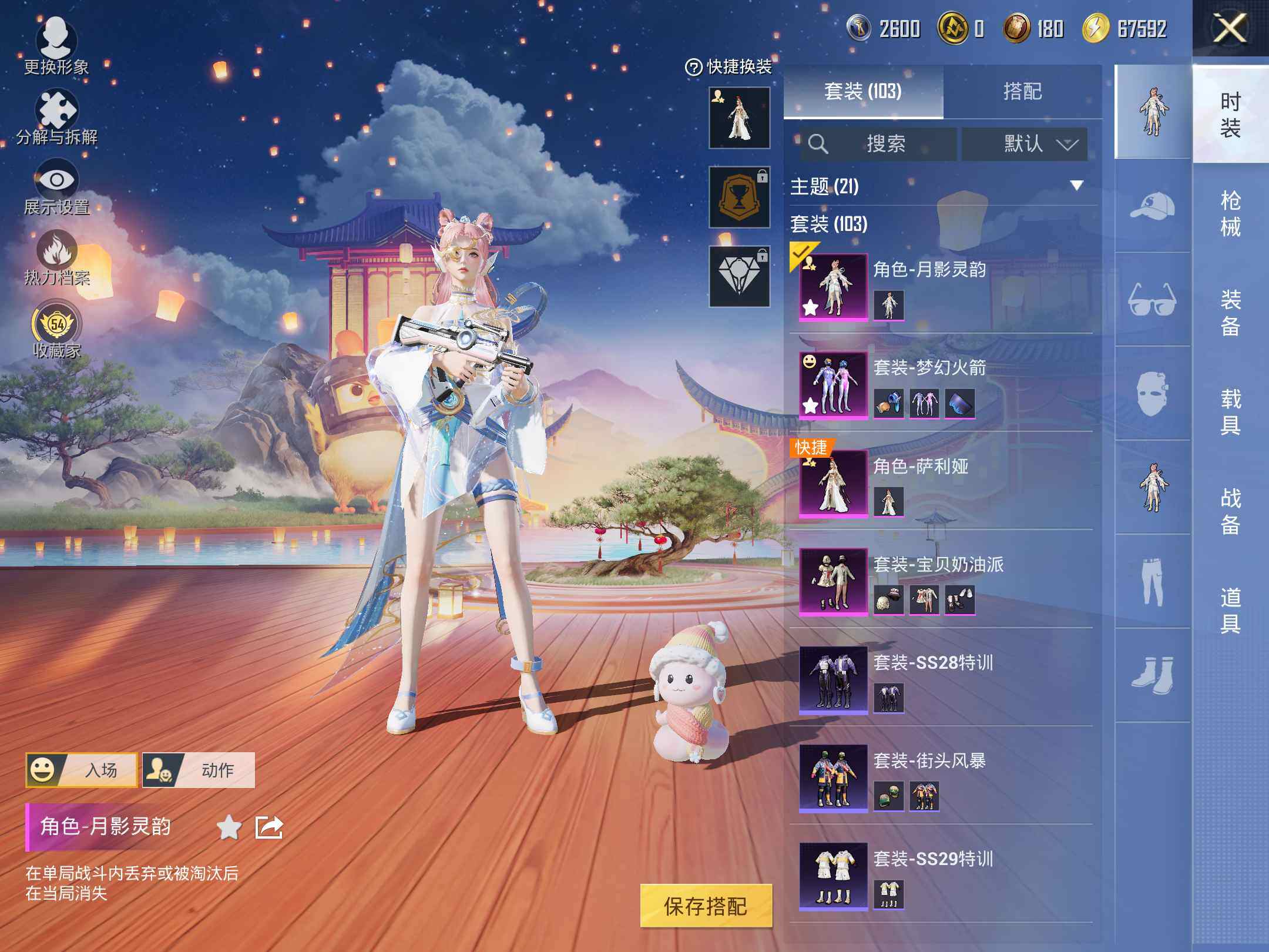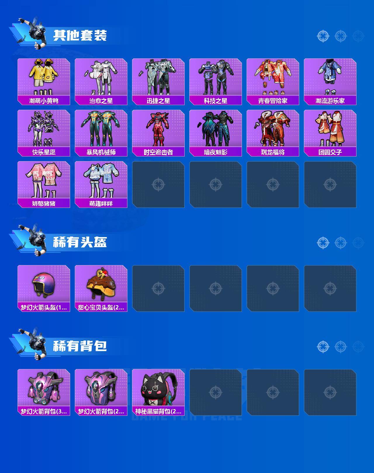 套装-梦幻火箭,套装-潮萌小黄鸭,套装-宝贝奶油派,角色-月影灵韵,角色-萨利娅,套装-鹰眼刺客,套装-迅捷狂鲨