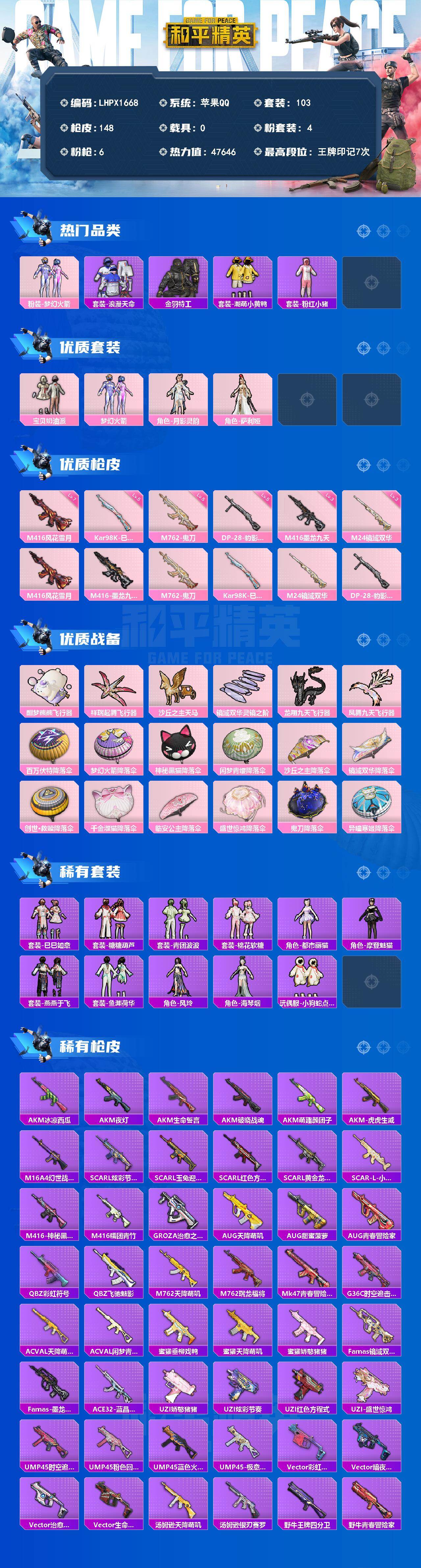 [17767487]【特价出售/店主推荐】苹果 手Q-4粉装-6特效枪-0载具-6粉色飞行器-47646热力值-7王牌印记-103套装-148枪皮 【热门品类】:粉装-梦幻火箭,套装-浪漫天命,套装-金羽特工,套装-潮萌小黄鸭,套装-粉红小猪 【粉色套装】:粉装-宝贝奶油派,粉装-梦幻火箭,角色-月影灵韵,角色-萨利娅 【粉色枪皮等级】:M416-风花雪月(七级),M416-墨龙九天(三级),M762-鬼刀(五级),Kar98K-巳巳如意(五级),M24-镜域双华(三级),DP-28-豹影疾电(五级) 【粉色枪皮】:M416-风花雪月,M416-墨龙九天,M762-鬼刀,Kar98K-巳巳如意,M24-镜域双华,DP-28-豹影疾电 【粉色飞行器】:酣梦熊熊飞行器,祥瑞起舞飞行器,沙丘之主天马,镜域双华-灵镜之阶,龙翔九天飞行器,凤舞九天飞行器 【粉色降落伞】:百万伏特降落伞,梦幻火箭降落伞,神秘黑猫降落伞,闲梦青缨降落伞,沙丘之主降落伞,镜域双华降落伞,创世·救赎降落伞,千金淑猫降落伞,临安公主降落伞,盛世惊鸿降落伞,鬼刀降落伞,异瞳寒姬降落伞 【稀有套装】:套装-巳巳如意,套装-糖糖葫芦,套装-青团波波,套装-棉花软糖,角色-都市丽猫,角色-摩登魅猫,套装-燕燕于飞,套装-鱼渊荷华,角色-风玲,角色-海琴烟,玩偶服-小狗蛇点点 【稀有枪皮】:AKM-冰凉西瓜,AKM-夜灯,AKM-生命誓言,AKM-破晓战魂,AKM-萌趣颜团子,AKM-虎虎生威,M16A4-幻世战舞者,SCAR-L-炫彩节奏,SCAR-L-玉兔迎春,SCAR-L-红色方程式,SCAR-L-黄金龙骨,SCAR-L-小狗蛇点点,M416-神秘黑猫,M416-糯团青竹,GROZA-治愈之星,AUG-天降萌叽,AUG-甜蜜菠萝,AUG-青春冒险家,QBZ-彩虹符号,QBZ-飞驰魅影,M762-天降萌叽,M762-瑞龙福将,Mk47-青春冒险家,G36C-时空追击者,AC-VAL-天降萌叽,AC-VAL-闲梦青缨,蜜獾-垂柳戏鸭,蜜獾-天降萌叽,蜜獾-娇憨猪猪,Famas-镜域双华,Famas-墨龙九天,ACE32-蓝晶绮麟,UZI-娇憨猪猪,UZI-炫彩节奏,UZI-红色方程式,UZI-盛世惊鸿,UMP45-时空追击者,UMP45-粉色回忆,UMP45-蓝色火焰,UMP45-极意拳锋,Vector-彩虹符号,Vector