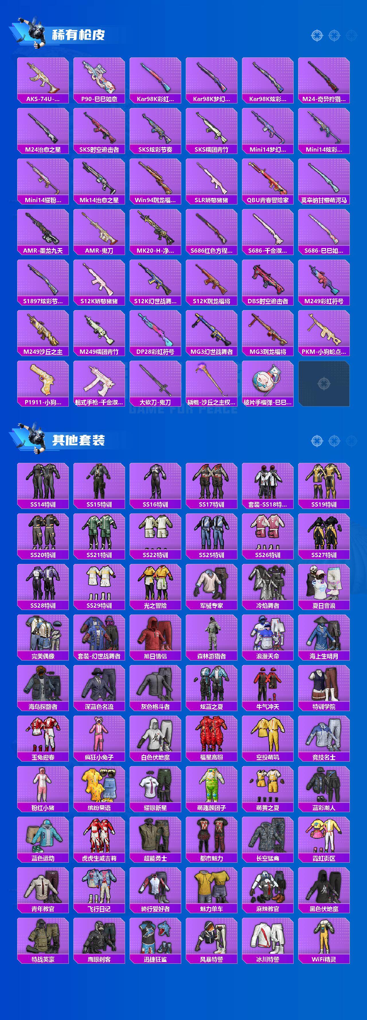 【稀有枪皮】:AKM-冰凉西瓜,AKM-夜灯,AKM-生命誓言,AKM-破晓战魂,AKM-萌趣颜团子,AKM-虎虎生威,M16A4-幻世战舞者,SCAR-L-炫彩节奏,SCAR-L-玉兔迎春,SCAR-L-红色方程式,SCAR-L-黄金龙骨,SCAR-L-小狗蛇点点,M416-神秘黑猫,M416-糯团青竹,GROZA-治愈之星,AUG-天降萌叽,AUG-甜蜜菠萝,AUG-青春冒险家,QBZ-彩虹符号,QBZ-飞驰魅影,M762-天降萌叽,M762-瑞龙福将,Mk47-青春冒险家,G36C-时空追击者,AC-VAL-天降萌叽,AC-VAL-闲梦青缨,蜜獾-垂柳戏鸭,蜜獾-天降萌叽,蜜獾-娇憨猪猪,Famas-镜域双华,Famas-墨龙九天,ACE32-蓝晶绮麟,UZI-娇憨猪猪,UZI-炫彩节奏,UZI-红色方程式,UZI-盛世惊鸿,UMP45-时空追击者,UMP45-粉色回忆,UMP45-蓝色火焰,UMP45-极意拳锋,Vector-彩虹符号,Vector