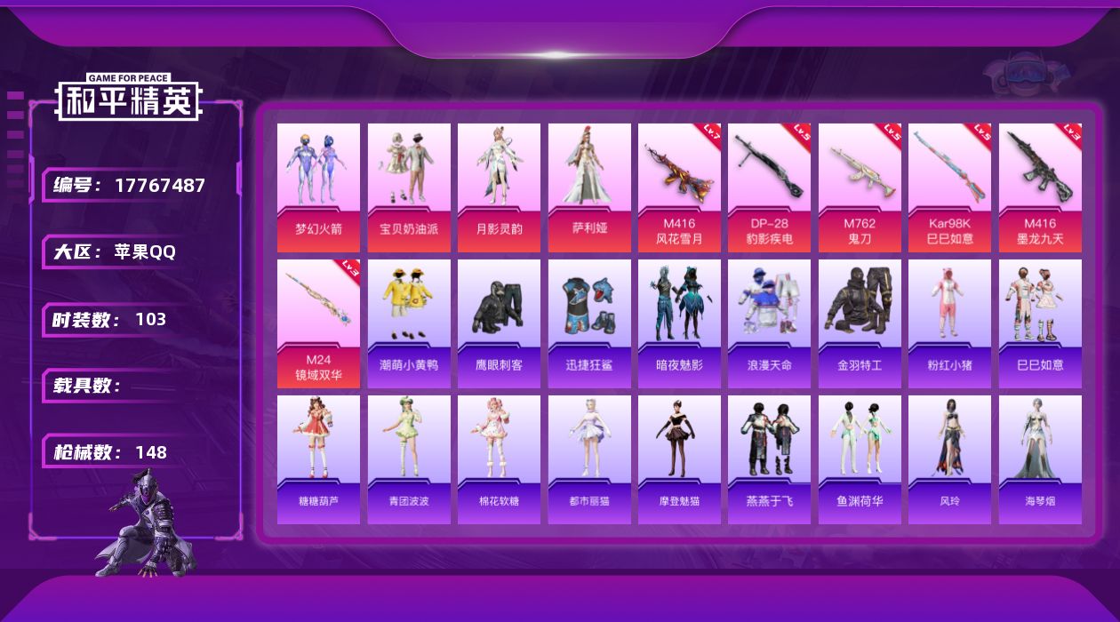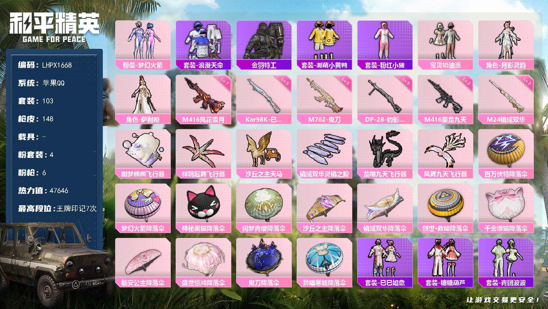 [17767487]【特价出售/店主推荐】苹果 手Q-4粉装-6特效枪-0载具-6粉色飞行器-47646热力值-7王牌印记-103套装-148枪皮