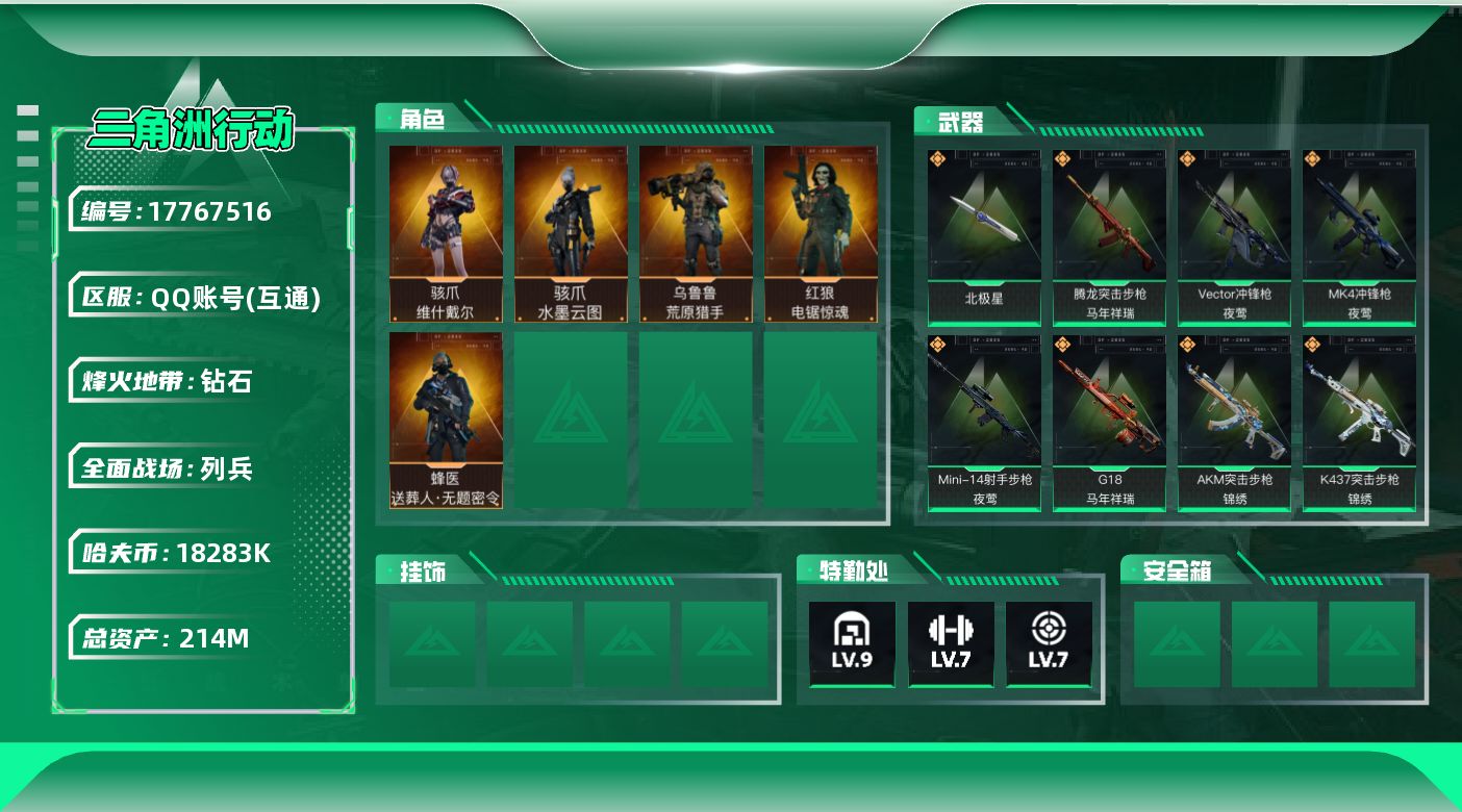 [17767516]可二次【特价出售/店主推荐】214m总资产-18283k哈夫币-60烽火等级-钻石-14战场等级-列兵 【干员外观】:骇爪-水墨云图,骇爪-维什戴尔,蜂医-送葬人·无题密令,红狼-电锯惊魂,乌鲁鲁-荒原猎手 【近战皮肤】:近战-北极星,近战-黑鹰 【传说外观】:M4A1突击步枪-阿米娅,AKM突击步枪-锦绣,ASh-12战斗步枪-鹅鸭杀,SG552突击步枪-运动员,SG552突击步枪-点翠,AK-12突击步枪-特斯拉线圈,SCAR-H战斗步枪-水墨云图,SCAR-H战斗步枪-启航,G3战斗步枪-骑士,CAR-15突击步枪-阿米娅,腾龙突击步枪-捞点薯条,腾龙突击步枪-马年祥瑞,K437突击步枪-北极星,K437突击步枪-锦绣,KC17突击步枪-电锯惊魂,KC17突击步枪-点翠,Vector冲锋枪-夜莺,UZI冲锋枪-特斯拉线圈,SMG-45冲锋枪-锦绣,SR-3M紧凑突击步枪-特斯拉线圈,勇士冲锋枪-能天使-午夜邮差,QCQ171冲锋枪-北极星,QCQ171冲锋枪-鹅鸭杀,MK4冲锋枪-夜莺,725双管霰弹枪-送葬人-无题密令,QJB201轻机枪-鹅鸭杀,Mini-14射手步枪-夜莺,M14射手步枪-蛮荒,M14射手步枪-缄花,SKS射手步枪-骑士,SR-25射手步枪-缄花,PSG-1射手步枪-点翠,R93狙击步枪-维什戴尔,AWM狙击步枪-捞点薯条,.357左轮-缄花,G18-马年祥瑞,93R-捞点薯条,复合弓-黑·天际线 【史诗外观】:KC17突击步枪-碎冰行动,腾龙突击步枪-檀劫铳影,AKM突击步枪-林中猎手,QBZ95-1突击步枪-曙光,K416突击步枪-腊梅,K416突击步枪-阿萨拉特攻,M16A4突击步枪-竞赛选手,AUG突击步枪-蝮蛇,SG552突击步枪-深海恐惧,SG552突击步枪-哈夫克警备,SCAR-H战斗步枪-囚徒,G3战斗步枪-流沙送葬,AS Val突击步枪-典狱官,AS Val突击步枪-百步穿杨,腾龙突击步枪-无垢,腾龙突击步枪-猎鳄行动,K437突击步枪-丛影谍踪,MP5冲锋枪-深海恐惧,MP5冲锋枪-战术竞备,MP5冲锋枪-竞技风,P90冲锋枪-莫斯提马,P90冲锋枪-紧急戒备,Vector冲锋枪-阿萨拉文明,Vector冲锋枪-异域战争,SMG-45冲锋枪-阿萨拉特攻,SR-3M紧凑突击步枪-荒野求生,SR-3M紧凑突击步枪-战术竞
