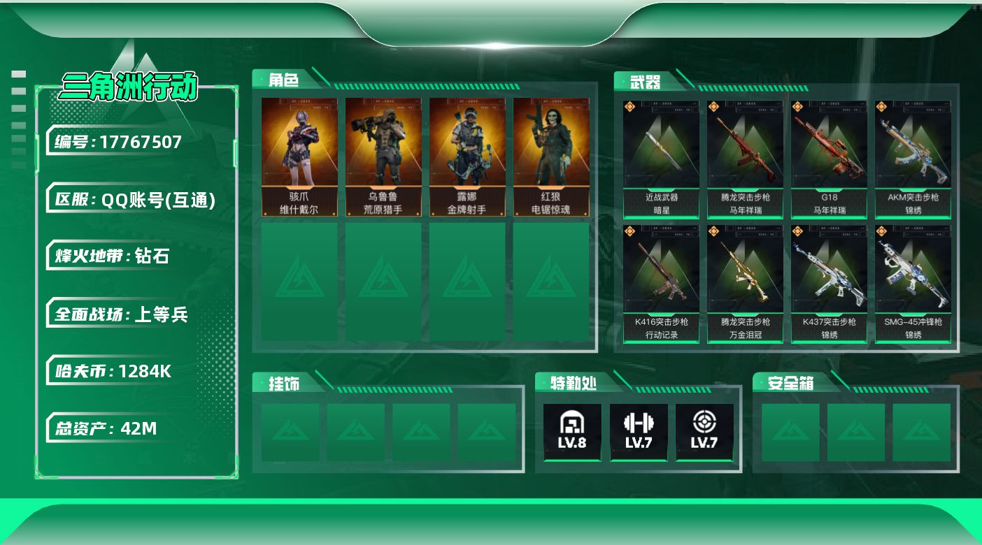[17767507]【特价出售/店主推荐】42m总资产-1284k哈夫币-60烽火等级-钻石-16战场等级-上等兵 【干员外观】:骇爪-维什戴尔,红狼-电锯惊魂,露娜-金牌射手,乌鲁鲁-荒原猎手,蛊-不羁人生 【近战皮肤】:近战-暗星,近战-处刑者3级,近战-黑鹰 【传说外观】:AKM突击步枪-锦绣,QBZ95-1突击步枪-腾驹驰春,K416突击步枪-行动记录,SG552突击步枪-运动员,SCAR-H战斗步枪-启航,腾龙突击步枪-马年祥瑞,腾龙突击步枪-万金泪冠,K437突击步枪-锦绣,KC17突击步枪-电锯惊魂,MK47突击步枪-暗星,SMG-45冲锋枪-锦绣,SMG-45冲锋枪-腾驹驰春,SR-3M紧凑突击步枪-暗星,勇士冲锋枪-万金泪冠,M14射手步枪-蛮荒,M14射手步枪-缄花,SR-25射手步枪-缄花,R93狙击步枪-维什戴尔,AWM狙击步枪-万金泪冠,.357左轮-缄花,G18-马年祥瑞 【史诗外观】:AKM突击步枪-逆战未来,K416突击步枪-腊梅,K416突击步枪-阿萨拉特攻,AUG突击步枪-蝮蛇,M7战斗步枪-百步穿杨,SCAR-H战斗步枪-囚徒,G3战斗步枪-流沙送葬,AS Val突击步枪-百步穿杨,腾龙突击步枪-猎鳄行动,K437突击步枪-丛影谍踪,MP5冲锋枪-战术竞备,Vector冲锋枪-百步穿杨,Vector冲锋枪-异域战争,SMG-45冲锋枪-阿萨拉特攻,SR-3M紧凑突击步枪-开工大吉,勇士冲锋枪-深海恐惧,勇士冲锋枪-丛影谍踪,MP7冲锋枪-六套之力,PKM通用机枪-蝮蛇,PKM通用机枪-阿萨拉特攻,M249轻机枪-丛影谍踪,QJB201轻机枪-炽焰,VSS射手步枪-丛影谍踪,SVD狙击步枪-阿萨拉工艺,M14射手步枪-工业狂潮, M14射手步枪-航天庆典,M700狙击步枪-竞技风,M700狙击步枪-百步穿杨,AWM狙击步枪-流沙送葬 【稀有外观】:AUG突击步枪-千里骏骨,M4A1突击步枪-繁盛,AKM突击步枪-肃杀,ASh-12战斗步枪-繁盛,K416突击步枪-一帆风顺,M7战斗步枪-捣蛋鬼,SG552突击步枪-2026,SG552突击步枪-马年新春,SG552突击步枪-贴花艺术, AK-12突击步枪-马年新春,SCAR-H战斗步枪-荣耀列队,G3战斗步枪-主宰,G3战斗步枪-猛禽,CAR-15突击步枪-来财,KC17突击步枪-来财,MP5冲锋枪