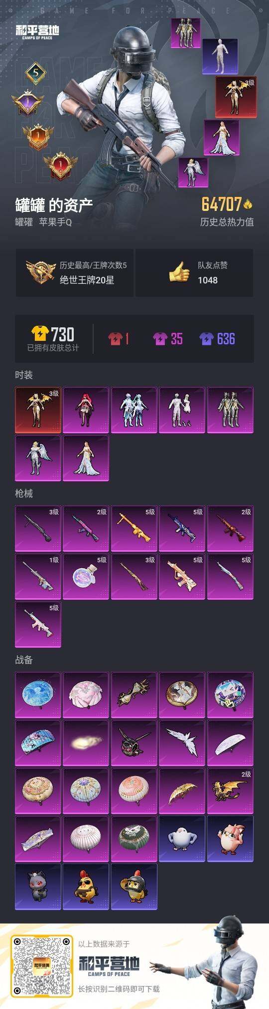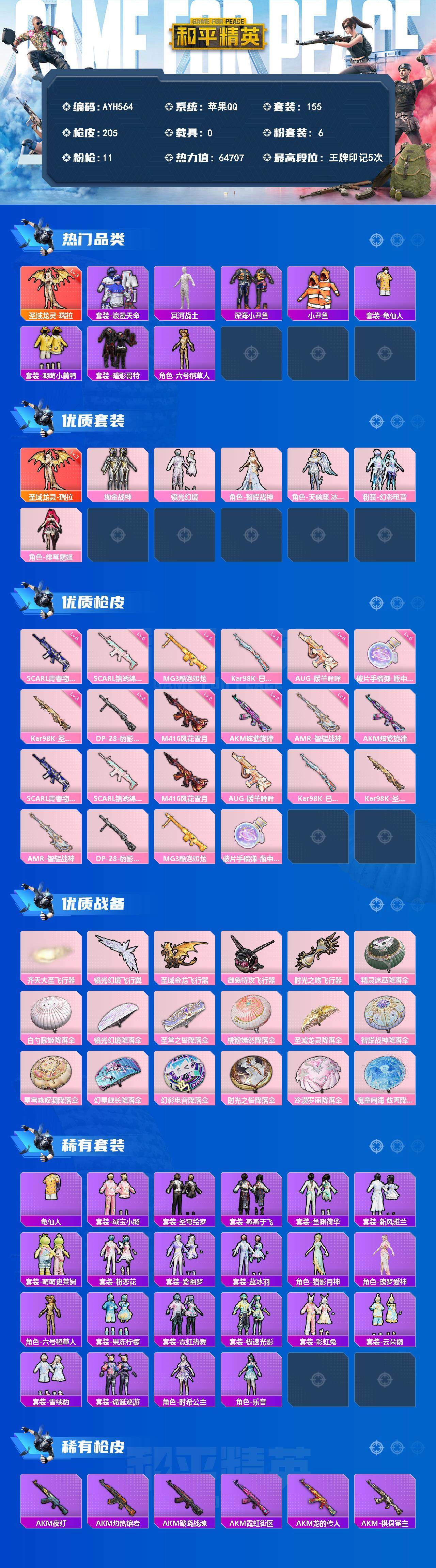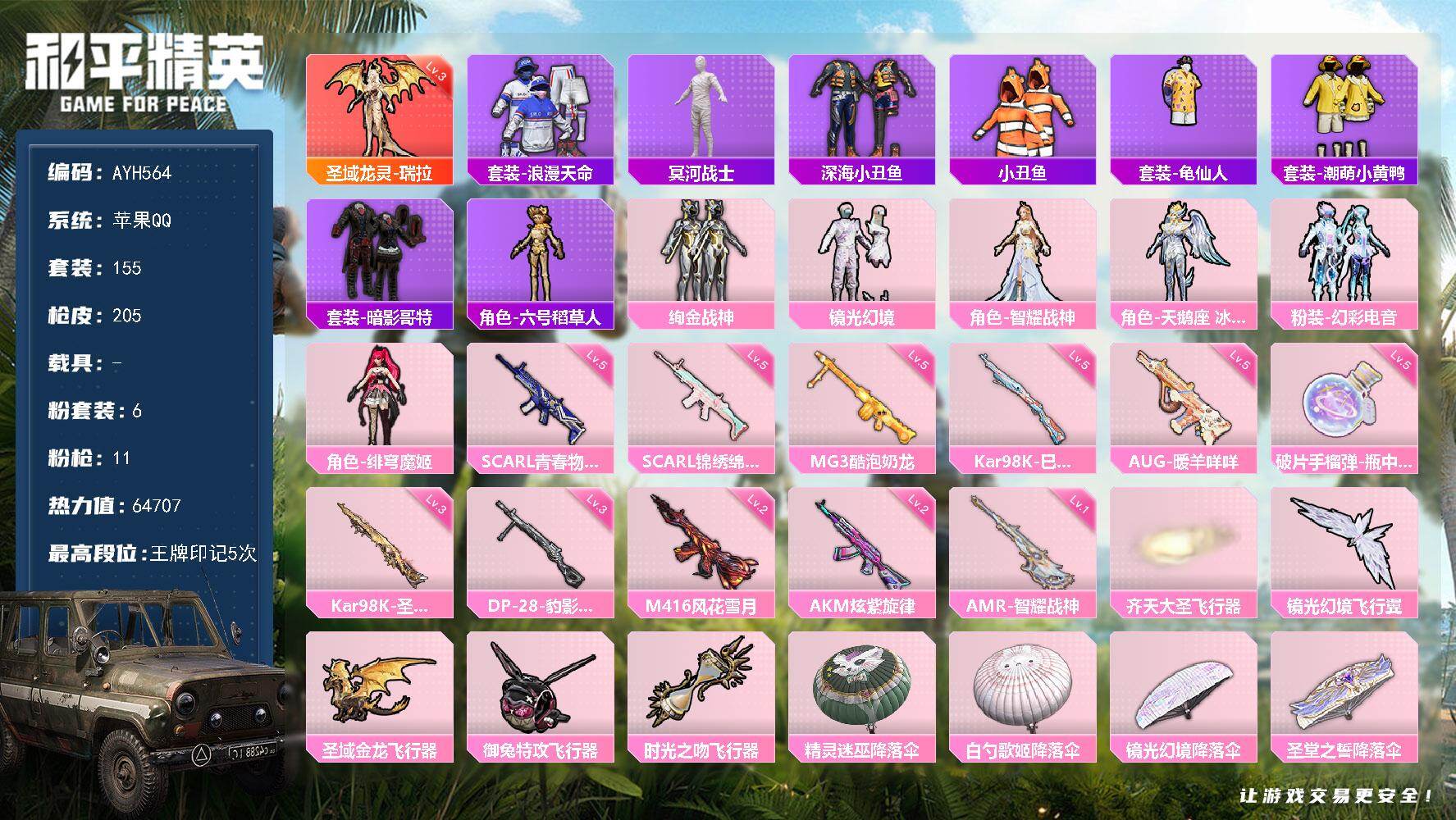 [17767275]苹果 手Q-1神装-6粉装-11特效枪-0载具-5粉色飞行器-64707热力值-5王牌印记-155套装-205枪皮