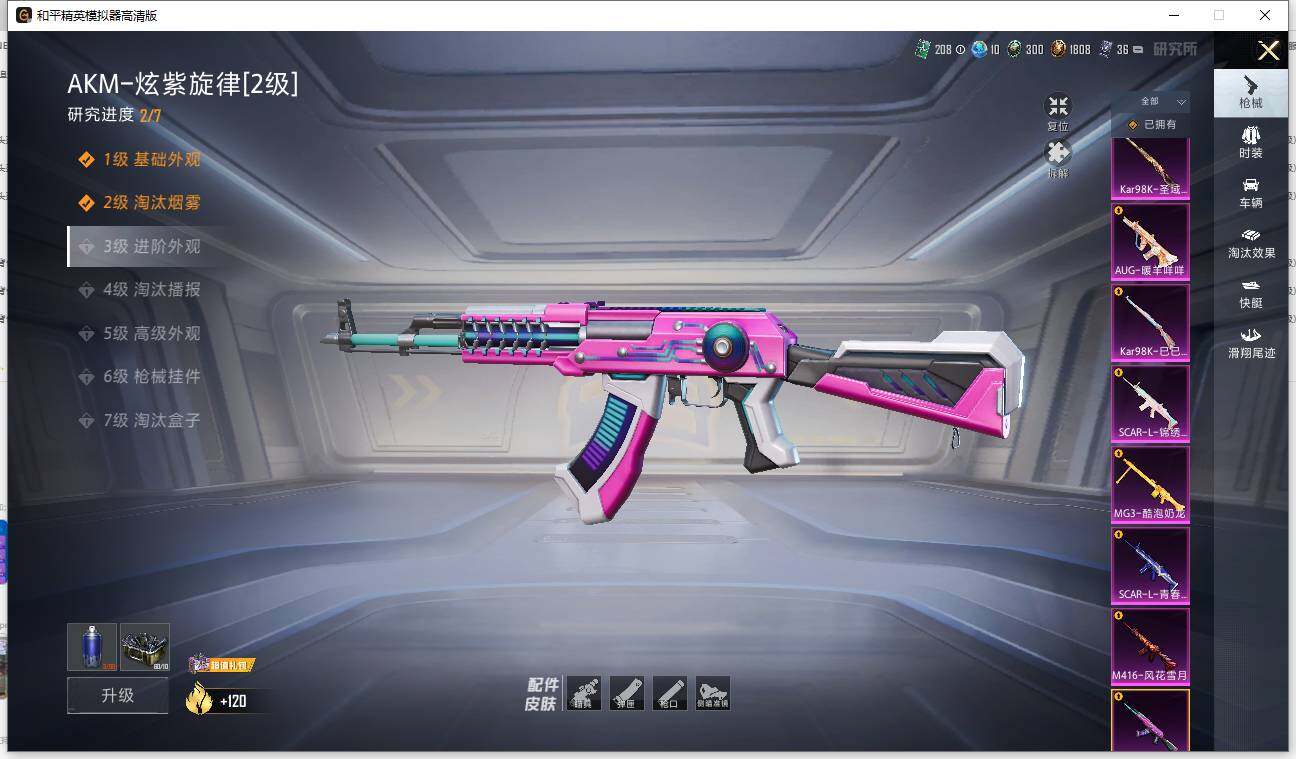 【粉色枪皮等级】:AKM-炫紫旋律(二级),SCAR-L-青春物语(五级),SCAR-L-锦绣绵绵(五级),M416-风花雪月(二级),AUG-暖羊咩咩(五级),Kar98K-巳巳如意(五级),Kar98K-圣域龙灵(三级),AMR-智耀战神(一级),DP-28-豹影疾电(三级),MG3-酷泡奶龙(五级),破片手榴弹-瓶中星球(五级)
