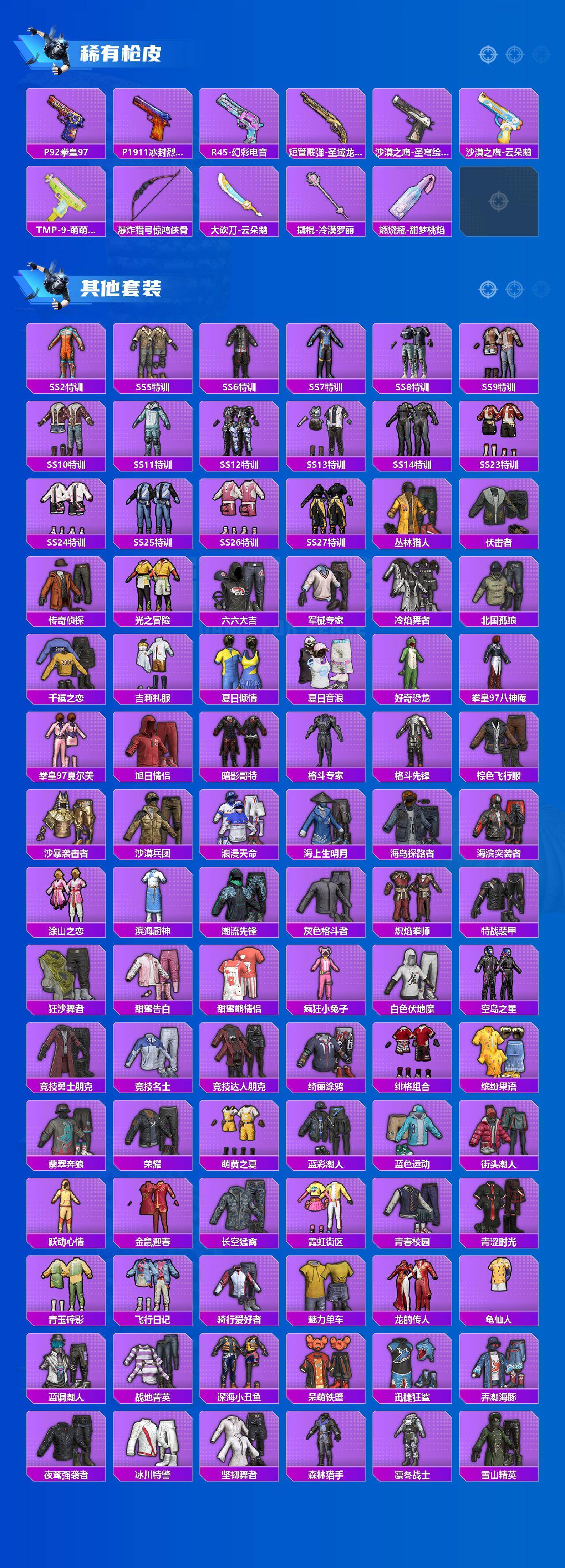 【稀有枪皮】:AKM-夜灯,AKM-灼热熔岩,AKM-破晓战魂,AKM-霓虹街区,AKM-龙的传人,AKM-棋盘冕主,M16A4-冥河战士,M16A4-幻世战舞者,M16A4-红色方程式,M16A4-蓝色火焰,SCAR-L-红色方程式,SCAR-L-冷漠罗丽,M416-夜灯,M416