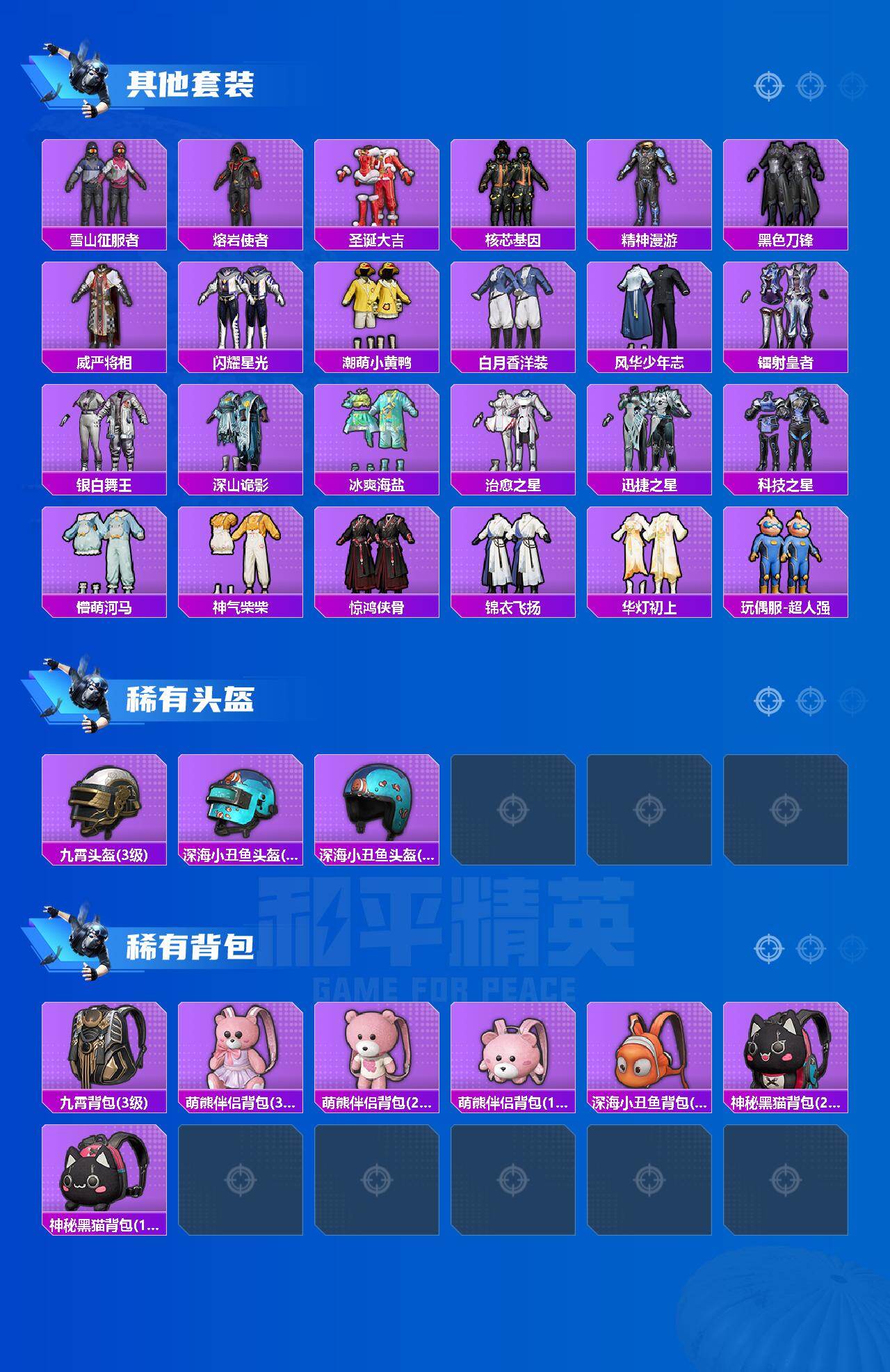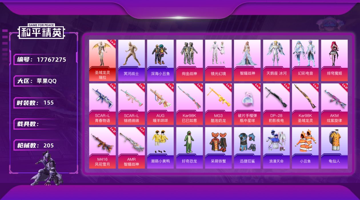 [17767275]苹果 手Q-1神装-6粉装-11特效枪-0载具-5粉色飞行器-64707热力值-5王牌印记-155套装-205枪皮 【红色神装等级】:圣域龙灵-瑞拉(三级) 【红色角色神装】:圣域龙灵-瑞拉 【热门品类】:套装-浪漫天命,套装-冥河战士,套装-深海小丑鱼,套装-小丑鱼,套装-龟仙人,套装-潮萌小黄鸭,套装-暗影哥特,角色-六号稻草人 【粉色套装】:粉装-绚金战神,粉装-镜光幻境,角色-智耀战神,角色-天鹅座 冰河,粉装-幻彩电音,角色-绯穹魔姬 【粉色枪皮等级】:AKM-炫紫旋律(二级),SCAR-L-青春物语(五级),SCAR-L-锦绣绵绵(五级),M416-风花雪月(二级),AUG-暖羊咩咩(五级),Kar98K-巳巳如意(五级),Kar98K-圣域龙灵(三级),AMR-智耀战神(一级),DP-28-豹影疾电(三级),MG3-酷泡奶龙(五级),破片手榴弹-瓶中星球(五级) 【粉色枪皮】:AKM-炫紫旋律,SCAR-L-青春物语,SCAR-L-锦绣绵绵,M416-风花雪月,AUG-暖羊咩咩,Kar98K-巳巳如意,Kar98K-圣域龙灵,AMR-智耀战神,DP-28-豹影疾电,MG3-酷泡奶龙,破片手榴弹-瓶中星球 【粉色飞行器】:齐天大圣飞行器,镜光幻境飞行翼,圣域金龙飞行器,御兔特攻飞行器,时光之吻飞行器 【粉色降落伞】:精灵迷巫降落伞,白勺歌姬降落伞,镜光幻境降落伞,圣堂之誓降落伞,桃粉嫣然降落伞,圣域龙灵降落伞,智耀战神降落伞,星穹咏叹调降落伞,幻星舰长降落伞,幻彩电音降落伞,时光之誓降落伞,冷漠罗丽降落伞,魔童闹海 敖丙降落伞 【稀有套装】:套装-龟仙人,套装-绒宝小鹅,套装-圣穹绘梦,套装-燕燕于飞,套装-鱼渊荷华,套装-新风雅兰,套装-萌萌史莱姆,套装-粉恋花,套装-紫幽梦,套装-蓝冰羽,角色-猎影月神,角色-瑰梦爱神,角色-六号稻草人,套装-果冻柠檬,套装-霓虹热舞,套装-极速光影,套装-彩虹兔,套装-云朵鹅,套装-雪绒豹,套装-诡诞巡游,角色-时希公主,角色-乐音 【稀有枪皮】:AKM-夜灯,AKM-灼热熔岩,AKM-破晓战魂,AKM-霓虹街区,AKM-龙的传人,AKM-棋盘冕主,M16A4-冥河战士,M16A4-幻世战舞者,M16A4-红色方程式,M16A4-蓝色火焰,SCAR-L-红色方程式,SCAR-L-冷漠罗丽,M416-夜灯,M416