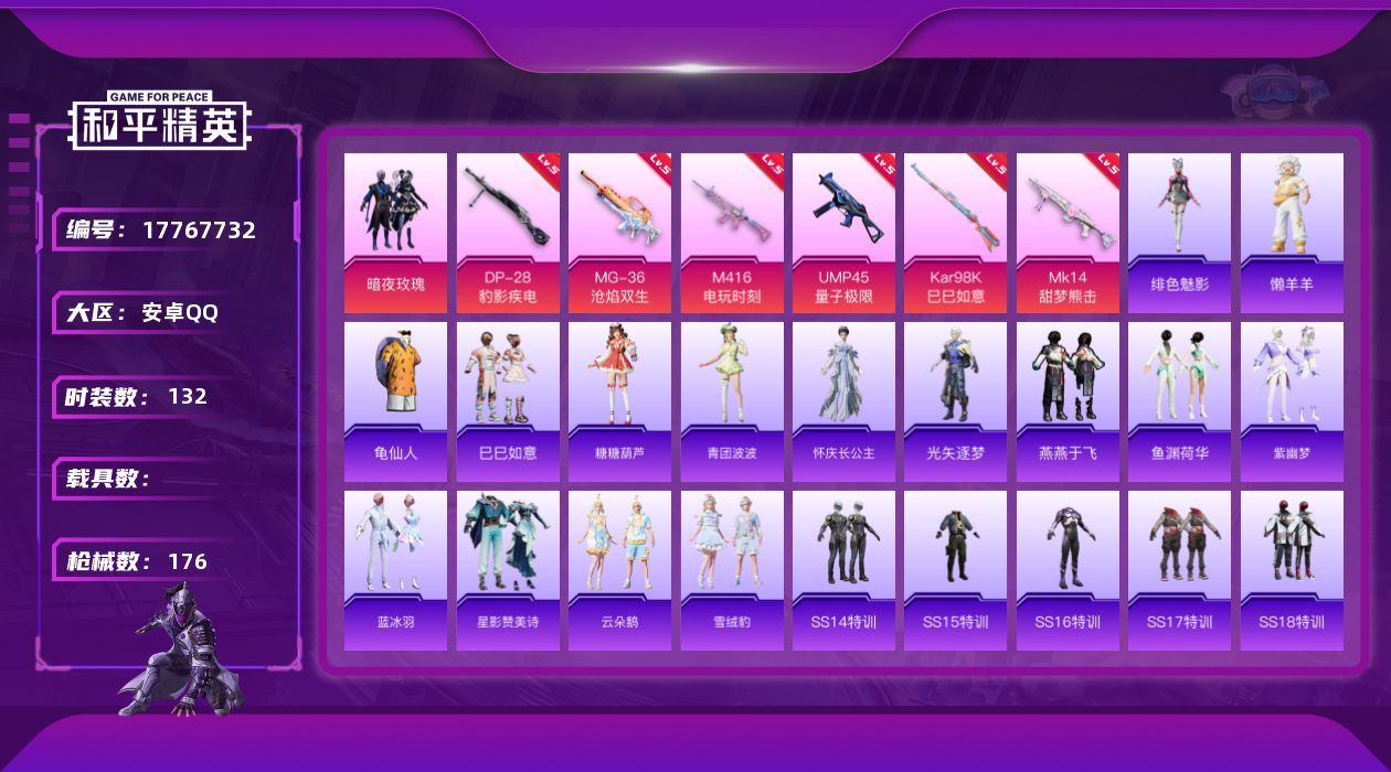 - [15144546]可二次【店主推荐捡漏号!可直接换绑】安卓 手Q-3粉装-4特效枪-2载具-1粉色飞行器-54266热力值-10王牌印记-152套装-184枪皮【热门品类】:套装-深海小丑鱼,套装-龟仙人【粉色套装】:粉装-智能音符,粉装-放客神游,角色-荧海星豚【粉色枪皮等级】:M416-电玩时刻(五级),AUG-暖羊咩咩(五级),Kar98K-巳巳如意(五级),DP-28-豹影疾电(五级)【粉色载具】:幻影随行,海龙奔腾【粉色枪皮】:M416-电玩时刻,AUG-暖羊咩咩,Kar98K-巳巳如意,DP-28-豹影疾电