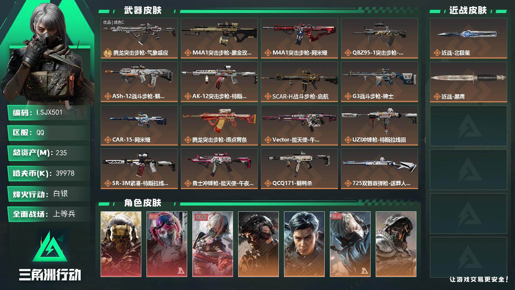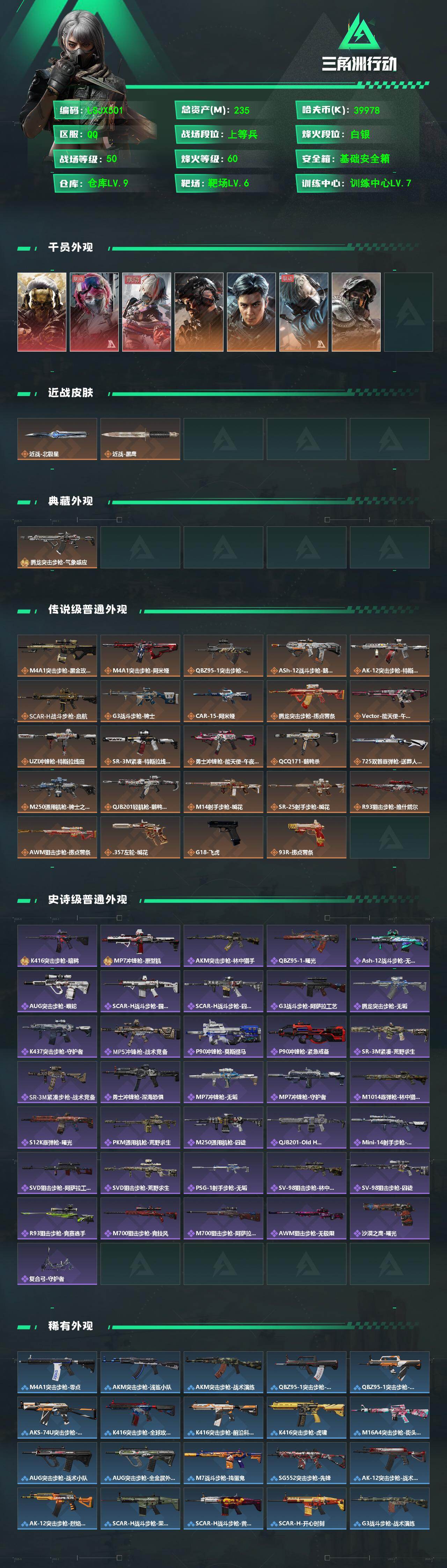 [17767543]可二次【特价出售/店主推荐】235m总资产-39978k哈夫币-60烽火等级-白银-50战场等级-上等兵 【干员外观】:红狼-蚀金玫瑰,蛊-能天使午夜邮差,骇爪-维什戴尔,威龙-铁面判官,威龙-飞虎,蜂医-送葬人·无题密令,深蓝-不破誓约 【近战皮肤】:近战-北极星,近战-黑鹰 【典藏外观】:腾龙突击步枪-气象感应 【典藏外观成色】:腾龙突击步枪-气象感应(优品C) 【传说外观】:M4A1突击步枪-蚀金玫瑰,M4A1突击步枪-阿米娅,QBZ95-1突击步枪-破军,ASh-12战斗步枪-鹅鸭杀,AK-12突击步枪-特斯拉线圈,SCAR-H战斗步枪-启航,G3战斗步枪-骑士,CAR-15突击步枪-阿米娅,腾龙突击步枪-捞点薯条,Vector冲锋枪-能天使-午夜邮差,UZI冲锋枪-特斯拉线圈,SR-3M紧凑突击步枪-特斯拉线圈,勇士冲锋枪-能天使-午夜邮差,QCQ171冲锋枪-鹅鸭杀,725双管霰弹枪-送葬人-无题密令,M250通用机枪-骑士之心,QJB201轻机枪-鹅鸭杀,M14射手步枪-缄花,SR-25射手步枪-缄花,R93狙击步枪-维什戴尔,AWM狙击步枪-捞点薯条,.357左轮-缄花,G18-飞虎,93R-捞点薯条 【史诗外观】:K416突击步枪-暗鸦,MP7冲锋枪-原型机,AKM突击步枪-林中猎手,QBZ95-1突击步枪-曙光,ASh-12战斗步枪-无极限,AUG突击步枪-蝮蛇,SCAR-H战斗步枪-国风,SCAR-H战斗步枪-囚徒,G3战斗步枪-阿萨拉工艺,腾龙突击步枪-无垢,K437突击步枪-守护者,MP5冲锋枪-战术竞备,P90冲锋枪-莫斯提马,P90冲锋枪-紧急戒备,SR-3M紧凑突击步枪-荒野求生,SR-3M紧凑突击步枪-战术竞备,勇士冲锋枪-深海恐惧,MP7冲锋枪-无垢,MP7冲锋枪-守护者,M1014霰弹枪-林中猎手,S12K霰弹枪-曙光,PKM通用机枪-荒野求生,M250通用机枪-囚徒,QJB201轻机枪-Old Habits,Mini-14射手步枪-守护者,SVD狙击步枪-阿萨拉工艺,SVD狙击步枪-荒野求生,PSG-1射手步枪-无垢,SV-98狙击步枪-林中猎手,SV-98狙击步枪-囚徒,R93狙击步枪-竞赛选手,M700狙击步枪-竞技风,M700狙击步枪-阿萨拉工艺,AWM狙击步枪-无极限,沙漠之鹰-曙光,复合弓-守护者 【稀有外观】:M
