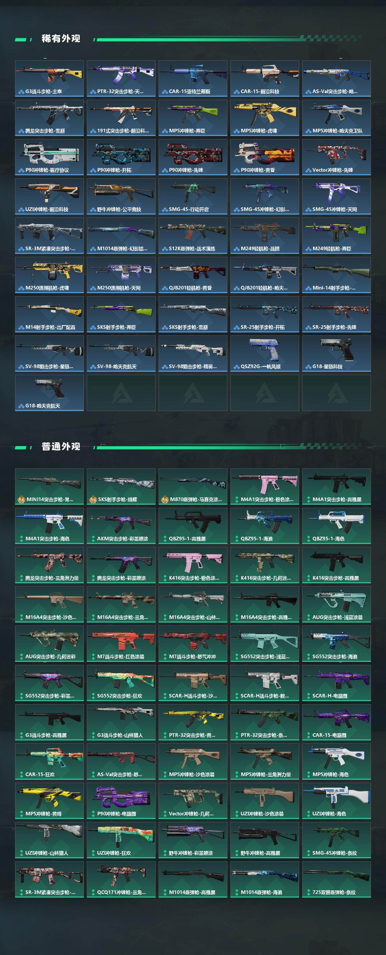 【传说外观】:M4A1突击步枪-蚀金玫瑰,M4A1突击步枪-阿米娅,QBZ95-1突击步枪-破军,ASh-12战斗步枪-鹅鸭杀,AK-12突击步枪-特斯拉线圈,SCAR-H战斗步枪-启航,G3战斗步枪-骑士,CAR-15突击步枪-阿米娅,腾龙突击步枪-捞点薯条,Vector冲锋枪-能天使-午夜邮差,UZI冲锋枪-特斯拉线圈,SR-3M紧凑突击步枪-特斯拉线圈,勇士冲锋枪-能天使-午夜邮差,QCQ171冲锋枪-鹅鸭杀,725双管霰弹枪-送葬人-无题密令,M250通用机枪-骑士之心,QJB201轻机枪-鹅鸭杀,M14射手步枪-缄花,SR-25射手步枪-缄花,R93狙击步枪-维什戴尔,AWM狙击步枪-捞点薯条,.357左轮-缄花,G18-飞虎,93R-捞点薯条
