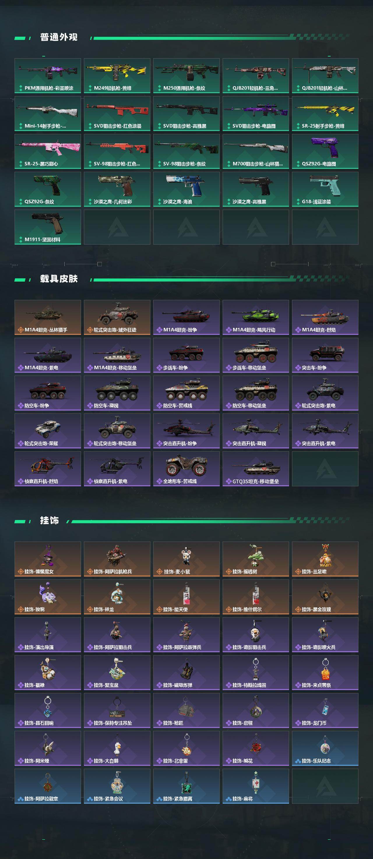 【史诗外观】:K416突击步枪-暗鸦,MP7冲锋枪-原型机,AKM突击步枪-林中猎手,QBZ95-1突击步枪-曙光,ASh-12战斗步枪-无极限,AUG突击步枪-蝮蛇,SCAR-H战斗步枪-国风,SCAR-H战斗步枪-囚徒,G3战斗步枪-阿萨拉工艺,腾龙突击步枪-无垢,K437突击步枪-守护者,MP5冲锋枪-战术竞备,P90冲锋枪-莫斯提马,P90冲锋枪-紧急戒备,SR-3M紧凑突击步枪-荒野求生,SR-3M紧凑突击步枪-战术竞备,勇士冲锋枪-深海恐惧,MP7冲锋枪-无垢,MP7冲锋枪-守护者,M1014霰弹枪-林中猎手,S12K霰弹枪-曙光,PKM通用机枪-荒野求生,M250通用机枪-囚徒,QJB201轻机枪-Old Habits,Mini-14射手步枪-守护者,SVD狙击步枪-阿萨拉工艺,SVD狙击步枪-荒野求生,PSG-1射手步枪-无垢,SV-98狙击步枪-林中猎手,SV-98狙击步枪-囚徒,R93狙击步枪-竞赛选手,M700狙击步枪-竞技风,M700狙击步枪-阿萨拉工艺,AWM狙击步枪-无极限,沙漠之鹰-曙光,复合弓-守护者