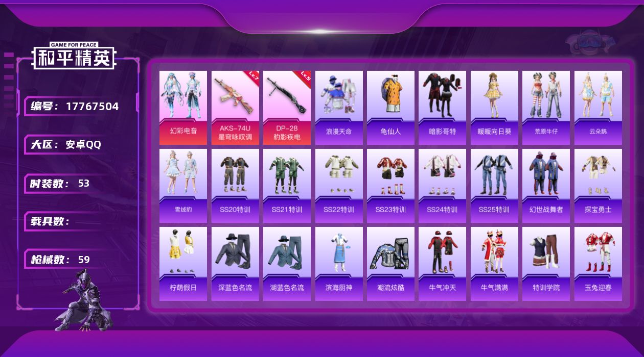 [17767504]【特价出售/店主推荐】安卓 手Q-1粉装-4特效枪-0载具-0粉色飞行器-18050热力值-2王牌印记-53套装-59枪皮 【热门品类】:套装-浪漫天命,套装-龟仙人,套装-暗影哥特 【粉色套装】:粉装-幻彩电音 【粉色枪皮等级】:ACE32-萌骑漫游(二级),AKS-74U-星穹咏叹调(七级),Mk14-福马献瑞(五级),DP-28-豹影疾电(五级) 【粉色枪皮】:ACE32-萌骑漫游,AKS-74U-星穹咏叹调,Mk14-福马献瑞,DP-28-豹影疾电 【粉色降落伞】:旋转彩虹降落伞,冷漠罗丽降落伞,鸢尾珑雾降落伞 【稀有套装】:套装-龟仙人,套装-暖暖向日葵,套装-荒原牛仔,套装-马上来财,套装-云朵鹅,套装-雪绒豹 【稀有枪皮】:AKM-彩虹符号,AKM-灼热熔岩,SCAR-L-炫彩节奏,SCAR-L-玉兔迎春,SCAR-L-冷漠罗丽,M416-糯团青竹,M416-红色方程式,M416-蓝色火焰,AUG-耀粉歌者,M762-天降萌叽,M762-云朵鹅,Mk47-虹云熊熊,AC-VAL-天降萌叽,蜜獾-天降萌叽,UZI-影袭,UMP45-生命誓言,Vector-生命誓言,汤姆逊-奇异狩猎者,汤姆逊-耀粉歌者,汤姆逊-像素花束,Kar98K-彩虹符号,M24-炫彩节奏,SKS-炫彩节奏,SVD-云朵鹅,S12K-幻世战舞者,DBS-第五大道,SPAS-12-云朵鹅,M249-糯团青竹,DP-28-彩虹符号,MG3-幻世战舞者,沙漠之鹰-云朵鹅,大砍刀-云朵鹅 【其他套装】:套装-SS20特训,套装-SS21特训,套装-SS22特训,套装-SS23特训,套装-SS24特训,套装-SS25特训,套装-幻世战舞者,套装-探宝勇士,套装-暗影哥特,套装-柠萌假日,套装-浪漫天命,套装-深蓝色名流,套装-湖蓝色名流,套装-滨海厨神,套装-潮流炫酷,套装-牛气冲天,套装-牛气满满,套装-特训学院,套装-玉兔迎春,套装-王牌教练,套装-甜蜜告白,套装-甜蜜熊情侣,套装-疯狂小兔子,套装-白熊同盟,套装-破蛋小黄鸡,套装-竞技名士,套装-萌黄之夏,套装-长空猛禽,套装-魅力单车,套装-鹤鸣,套装-麻辣教官,套装-龙的传人,套装-龙腾端午,套装-龟仙人,套装-冰冻风暴,套装-蓝调潮人,套装-精密机核 【营地ID】:925328742