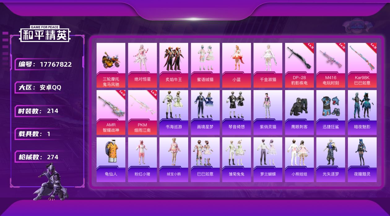 [17767822]可二次【特价出售/店主推荐】安卓 手Q-6粉装-6特效枪-1载具-2粉色飞行器-85957热力值-11王牌印记-214套装-274枪皮【热门品类】:旭日初心兜帽大衣,套装-龟仙人,套装-粉红小猪【粉色套装】:角色-绝对恒星,粉装-炙焰牛王,粉装-蜜语绒猫,角色-小蓝,角色-千金淑猫,角色-虎痴许褚【粉色枪皮等级】:M416-电玩时刻(五级),Kar98K-巳巳如意(五级),Mk14-福马献瑞(四级),AMR-智耀战神(五级),DP-28-豹影疾电(五级),PKM-江南烟雨(四级)【粉色载具】:鬼马风驰【粉色枪皮】:M416-电玩时刻,Kar98K-巳巳如意,Mk14-福马献瑞,AMR-智耀战神,DP-28-豹影疾电,PKM-江南烟雨【粉色飞行器】:炫彩糖果飞行器,霓虹漫游飞行器