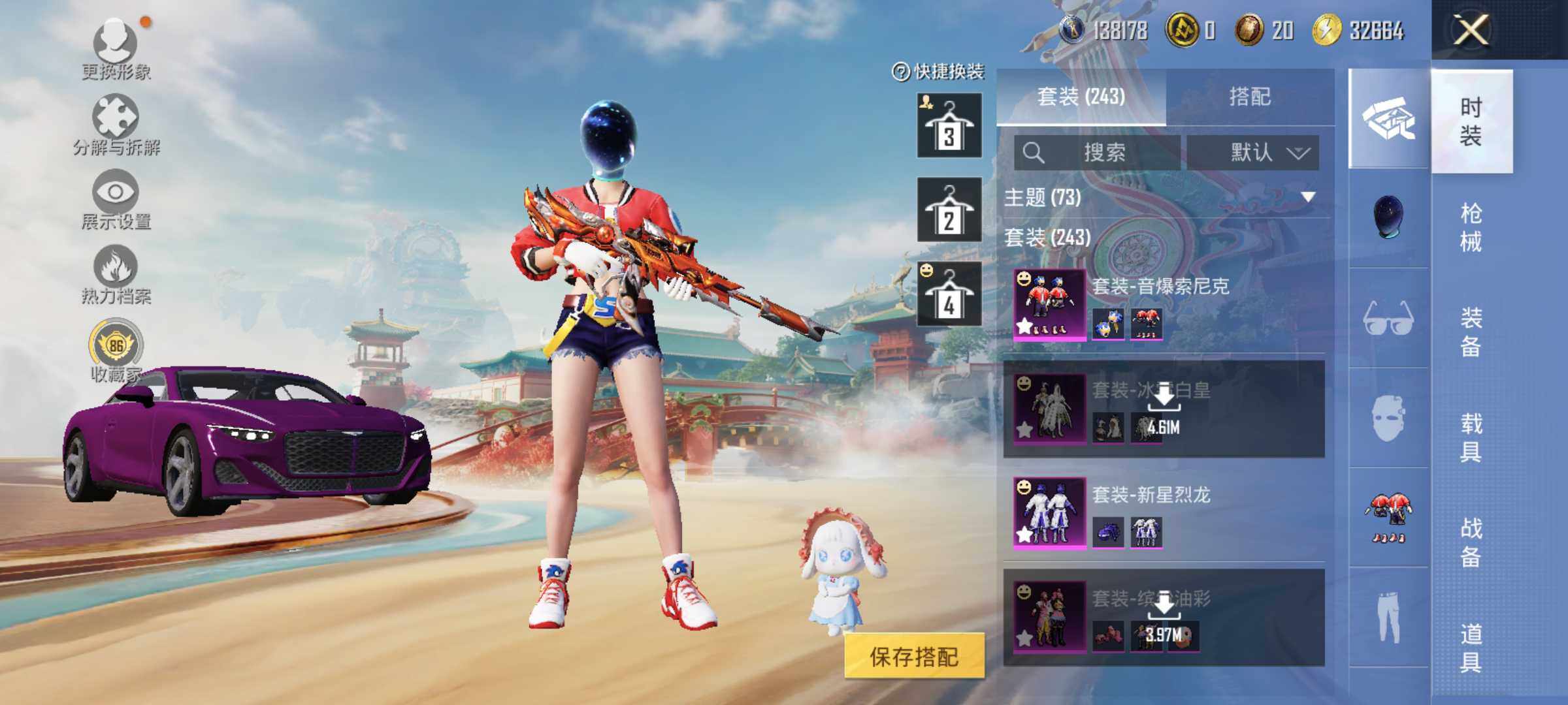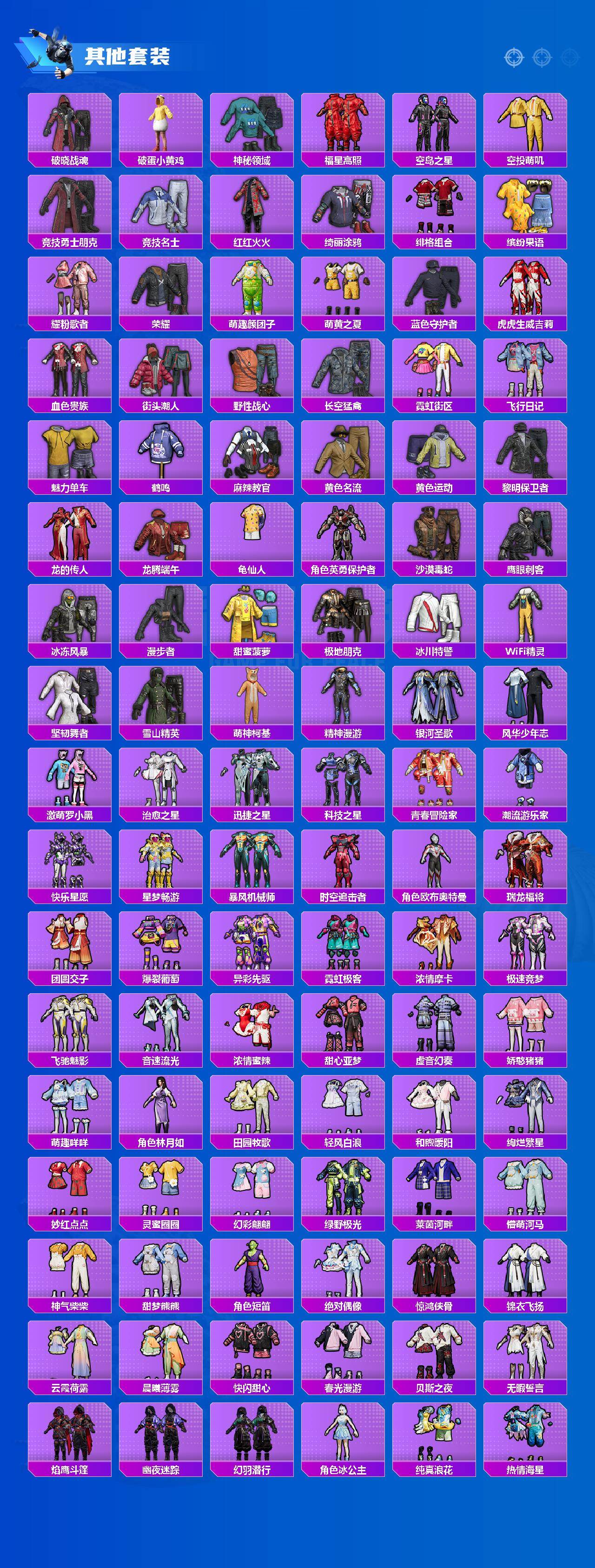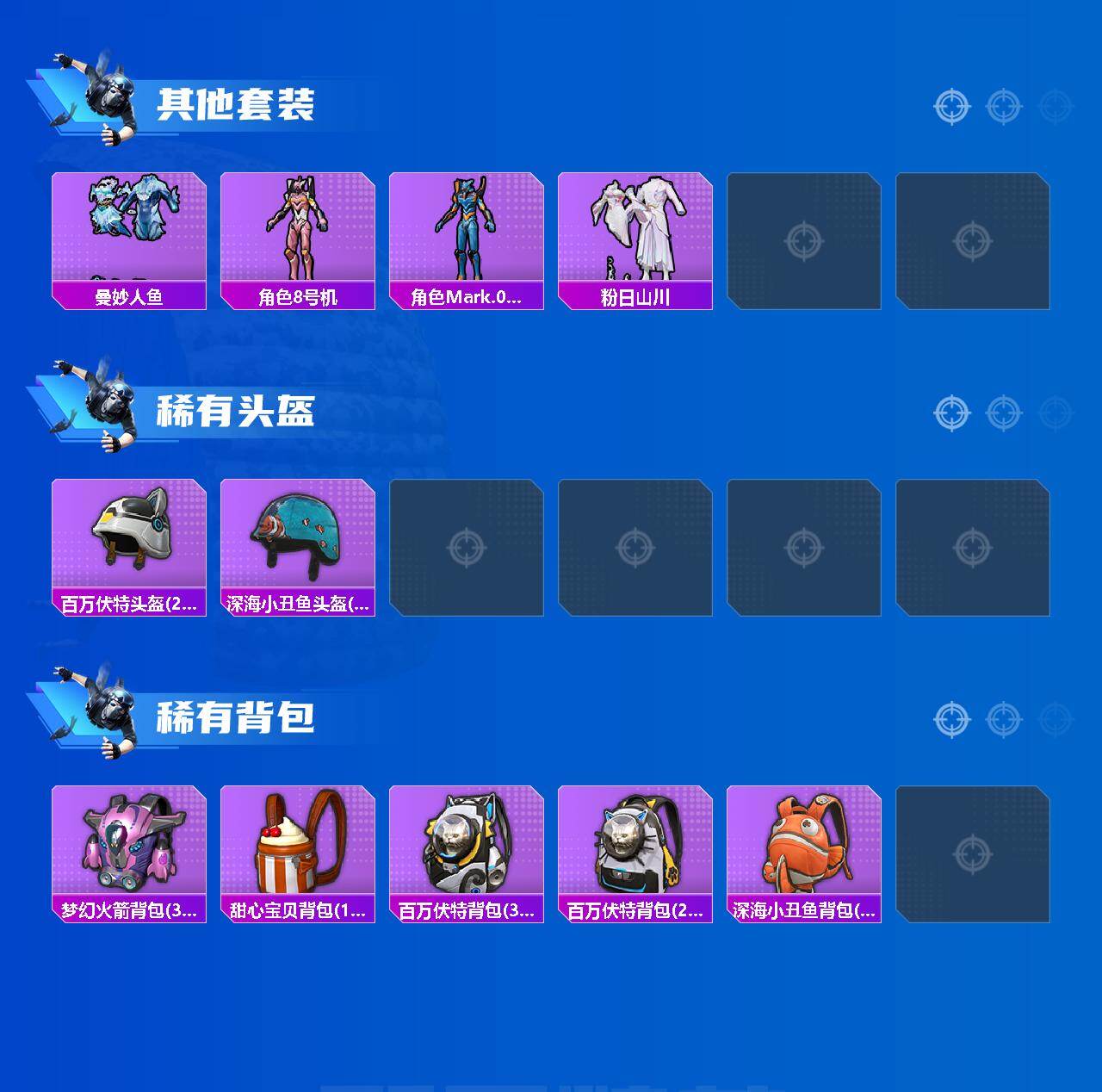 套装-梦幻火箭,套装-音爆索尼克,套装-缤纷油彩,套装-都市猎人,套装-胖达圆圆,套装-星之信仰,套装-新星烈龙,套装-苍蓝魅影,套装-炙焰红王,套装-千面幻镜,套装-未来歌姬,角色-冰炎战车,角色-美雪,角色-觉醒初号机,角色-风幻水境,套装-金丰海韵,套装-鹰眼刺客,套装-萌神柯基