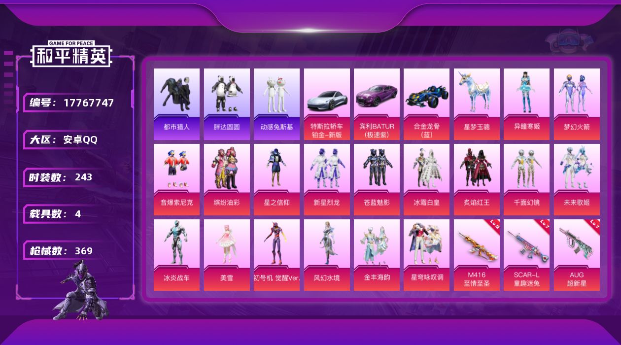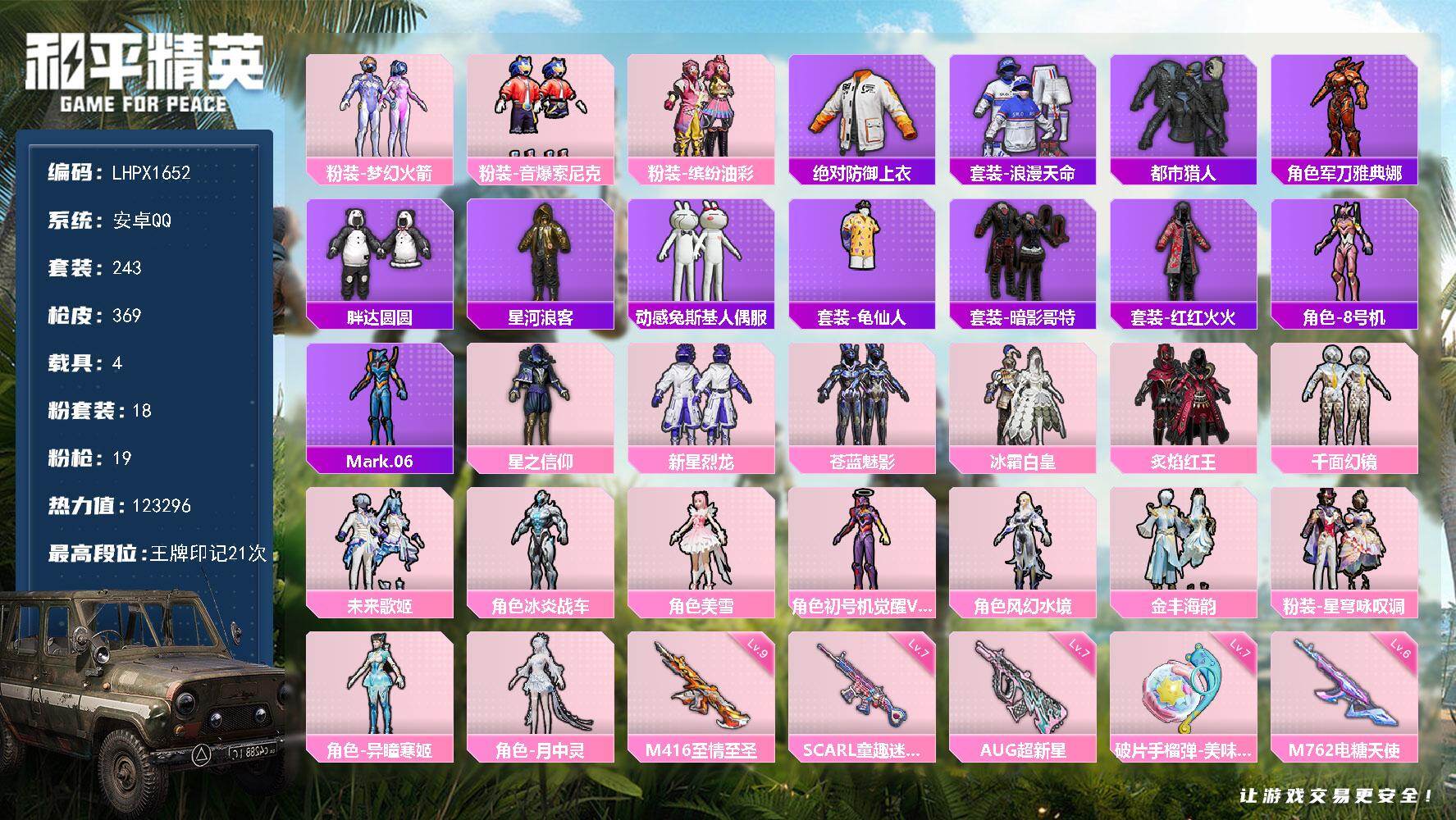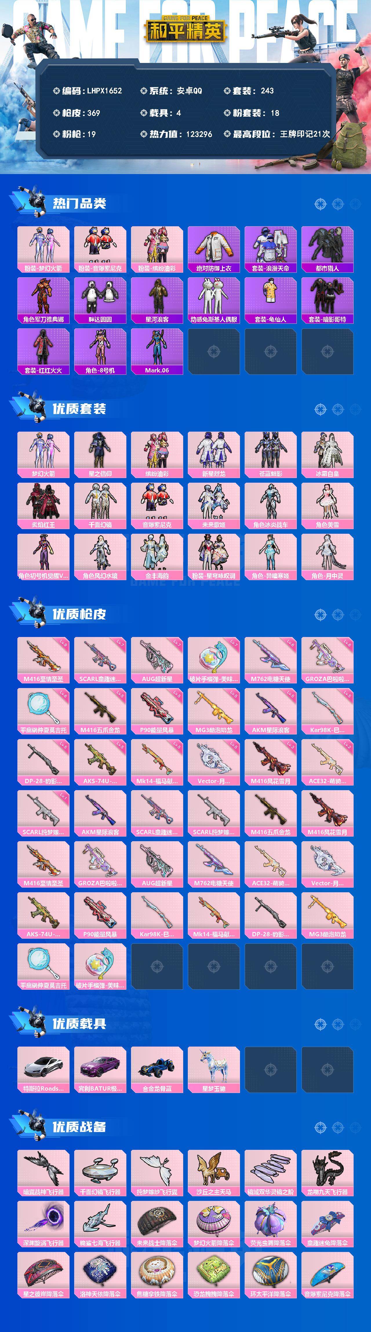 [17767747]【特价出售/店主推荐】 M416-至情至圣(九级)/绝世印记6 安卓 手Q-18粉装-19特效枪-4载具-8粉色飞行器-123296热力值-21王牌印记-243套装-369枪皮【热门品类】:粉装-梦幻火箭,粉装-音爆索尼克,粉装-缤纷油彩,绝对防御上衣,套装-浪漫天命,套装-都市猎人,角色-军刀雅典娜,套装-胖达圆圆,套装-星河浪客,套装-动感兔斯基人偶服,套装-龟仙人,套装-暗影哥特,套装-红红火火,角色-8号机,角色-Mark.06【粉色套装】:粉装-梦幻火箭,粉装-星之信仰,粉装-缤纷油彩,粉装-新星烈龙,粉装-苍蓝魅影,粉装-冰霜白皇,粉装-炙焰红王,粉装-千面幻镜,粉装-音爆索尼克,粉装-未来歌姬,角色-冰炎战车,角色-美雪,角色-初号机 觉醒Ver.,角色-风幻水境,粉装-金丰海韵,粉装-星穹咏叹调,角色-异瞳寒姬,角色-月中灵【粉色枪皮等级】:AKM-星际浪客(五级),SCAR-L-童趣迷兔(七级),SCAR-L-纯梦嫁纱(一级),M416-五爪金龙(五级),M416-风花雪月(三级),M416-至情至圣(九级),GROZA-巴啦啦小魔仙(六级),AUG-超新星(七级),M762-电糖天使(六级),ACE32-萌骑漫游(二级),Vector-月中灵(五级),AKS-74U-森灵之息(五级),P90-能量风暴(五级),Kar98K-巳巳如意(五级),Mk14-福马献瑞(五级),DP-28-豹影疾电(五级),MG3-酷泡奶龙(五级),平底锅-仲夏莫吉托(六级),破片手榴弹-美味星星糖(七级)【粉色载具】:特斯拉Roadster(尊享铂),宾利BATUR(极速紫),合金龙骨(蓝),星梦玉骢【粉色枪皮】:AKM-星际浪客,SCAR-L-童趣迷兔,SCAR-L-纯梦嫁纱,M416-五爪金龙,M416-风花雪月,M416-至情至圣,GROZA-巴啦啦小魔仙,AUG-超新星,M762-电糖天使,ACE32-萌骑漫游,Vector-月中灵,AKS-74U-森灵之息,P90-能量风暴,Kar98K-巳巳如意,Mk14-福马献瑞,DP-28-豹影疾电,MG3-酷泡奶龙,平底锅-仲夏莫吉托,破片手榴弹-美味星星糖【粉色飞行器】:暗翼战神飞行器,千面幻镜飞行器,纯梦嫁纱飞行翼,沙丘之主天马,镜域双华-灵镜之阶,龙翔九天飞行器,深渊漩涡飞行器,脆鲨七海飞行器