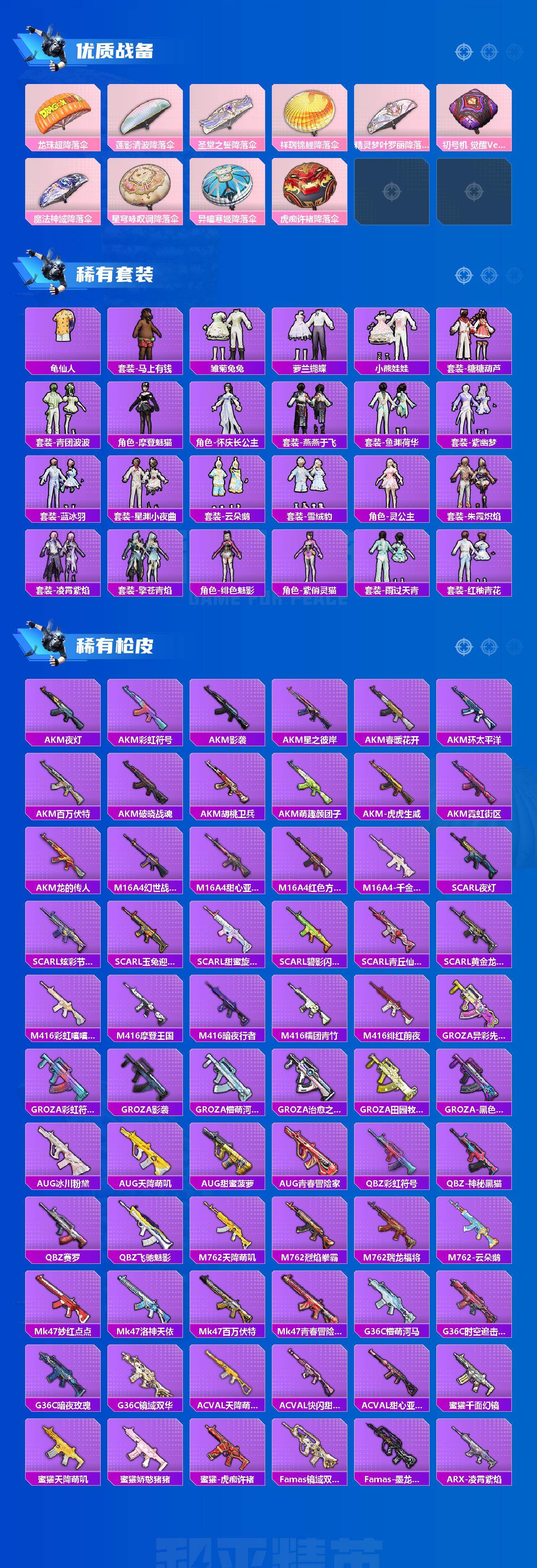 - [16618379]【特价出售/店主推荐】70m总资产-1610k哈伏币-60烽火等级-钻石-23战场等级-列兵 【干员外观】:红狼-蚀金玫瑰,蛊-能天使午夜邮差,骇爪-维什戴尔,威龙-壮志凌云,牧羊人-街头之王,无名-夜鹰,深蓝-不破誓约,红狼-电锯惊魂,露娜-金牌射手 【近战皮肤】:近战-北极星,近战-黑鹰 【传说外观】:M4A1突击步枪-蚀金玫瑰,M7战斗步枪-维京,SG552突击步枪-运动员,AK-12突击步枪-夜鹰,SCAR-H战斗步枪-铁艺苍穹,SCAR-H战斗步枪-启航,G3战斗步枪-骑士,CAR-15突击步枪-阿米娅,腾龙突击步枪-捞点薯条,K437突击步枪-北极星,KC17突击步枪-电锯惊魂,Vector冲锋枪-能天使-午夜邮差,SMG-45冲锋枪-骑士,勇士冲锋枪-能天使-午夜邮差,QCQ171冲锋枪-北极星,725双管霰弹枪-送葬人-无题密令,M250通用机枪-骑士之心,SR-25射手步枪-水墨云图,R93狙击步枪-维什戴尔,AWM狙击步枪-捞点薯条,93R-捞点薯条 【史诗外观】:M4A1突击步枪-特勤执行,AKM突击步枪-林中猎手,QBZ95-1突击步枪-曙光,QBZ95-1突击步枪-ACE,ASh-12战斗步枪-守夜人,ASh-12战斗步枪-无极限,M16A4突击步枪-竞赛选手,AUG突击步枪-蝮蛇,AUG突击步枪-特勤执行,M7战斗步枪-百步穿杨,SG552突击步枪-尖端治疗,SG552突击步枪-深海恐惧,SCAR-H战斗步枪-危险实验,SCAR-H战斗步枪-囚徒,G3战斗步枪-战场英杰,G3战斗步枪-流沙送葬,PTR-32突击步枪-ACE,AS Val突击步枪-尖端治疗,AS Val突击步枪-百步穿杨,腾龙突击步枪-猎鳄行动,K437突击步枪-守护者,MP5冲锋枪-深海恐惧,MP5冲锋枪-战术竞备,MP5冲锋枪-竞技风,Vector冲锋枪-阿萨拉文明,Vector冲锋枪-红色彗星,Vector冲锋枪-猎鳄行动,Vector冲锋枪-百步穿杨,UZI冲锋枪-危险实验,SR-3M紧凑突击步枪-荒野求生,SR-3M紧凑突击步枪-战术竞备,勇士冲锋枪-深海恐惧,勇士冲锋枪-工业狂潮,MP7冲锋枪-守护者,M1014霰弹枪-林中猎手,S12K霰弹枪-曙光,PKM通用机枪-蝮蛇,PKM通用机枪-守夜人,PKM通用机枪-荒野求生,M249轻机枪-维京,M250通用机枪