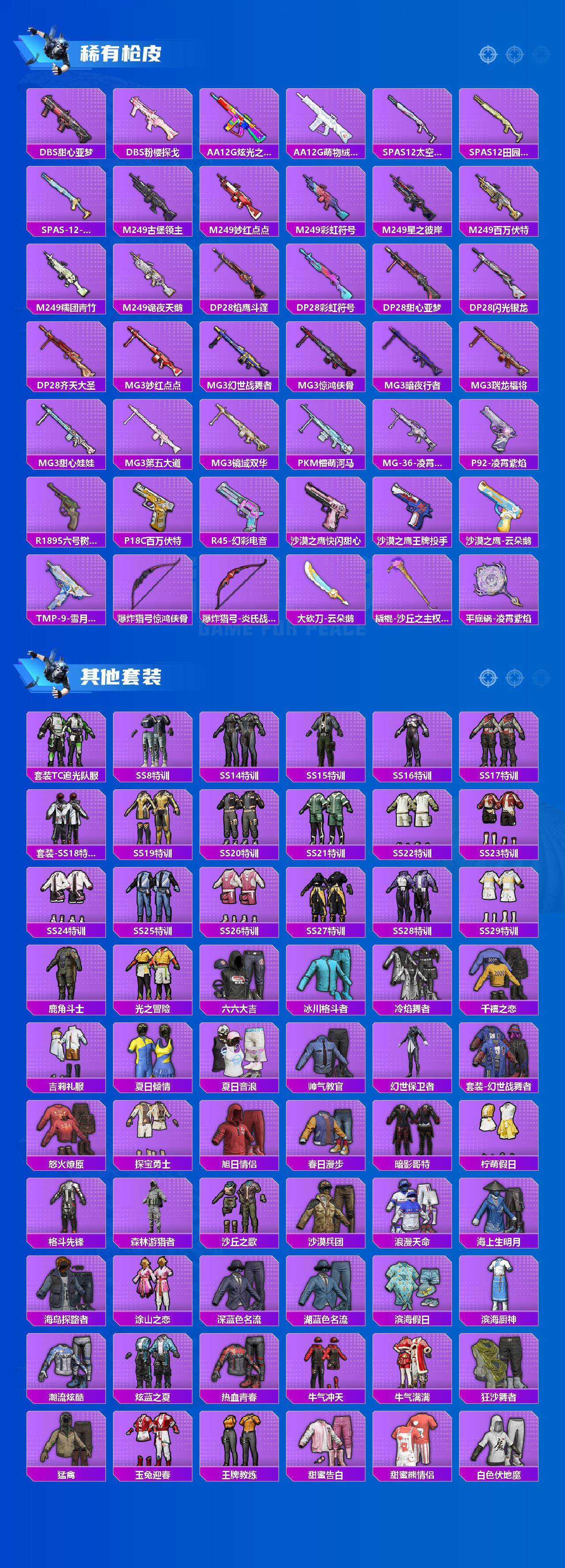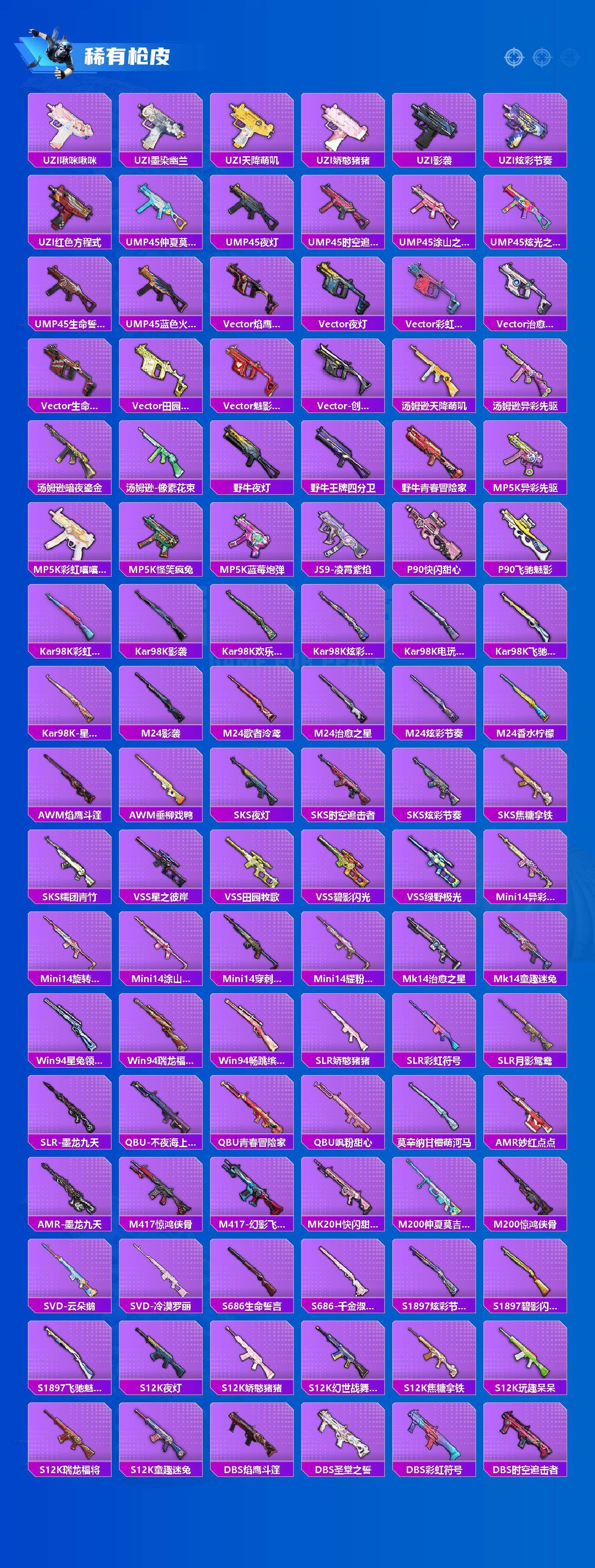 AKM-星际浪客,SCAR-L-童趣迷兔,SCAR-L-纯梦嫁纱,M416-五爪金龙,M416-风花雪月,M416-至情至圣,GROZA-巴啦啦小魔仙,AUG-超新星,M762-电糖天使,P90-能量风暴,Kar98K-巳巳如意,MG3-酷泡奶龙,平底锅-仲夏莫吉托