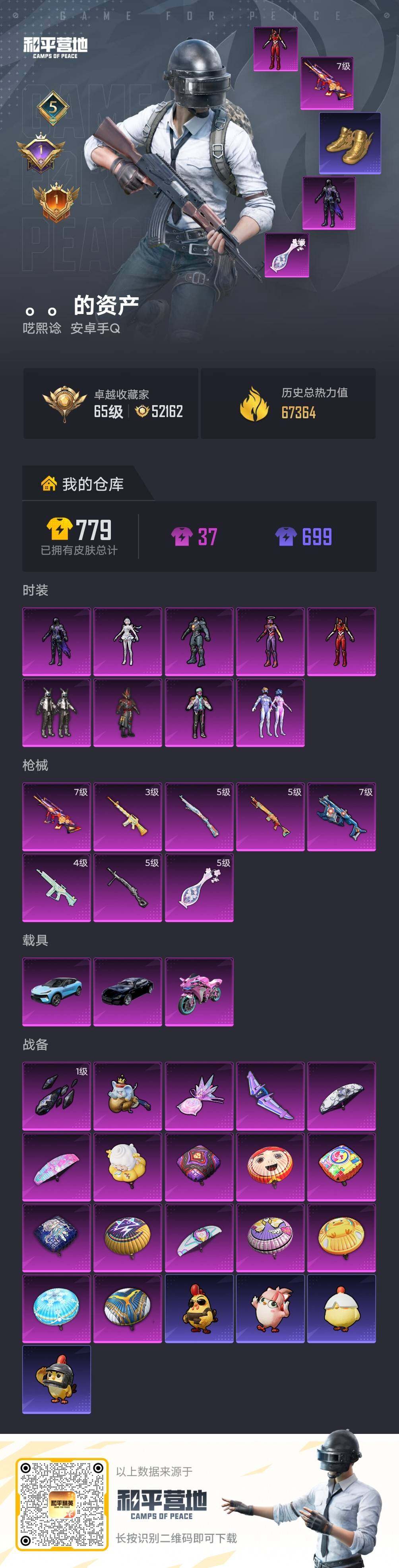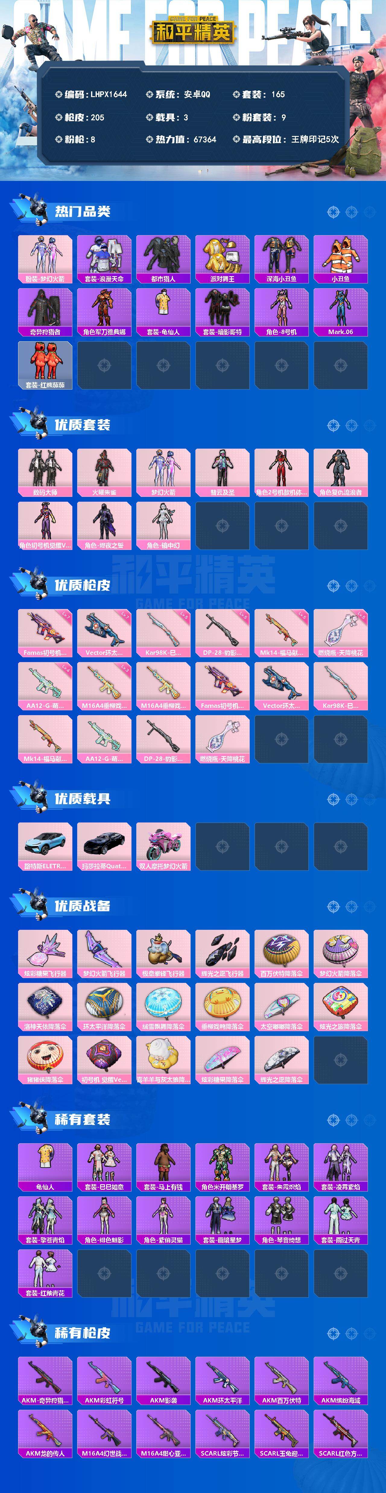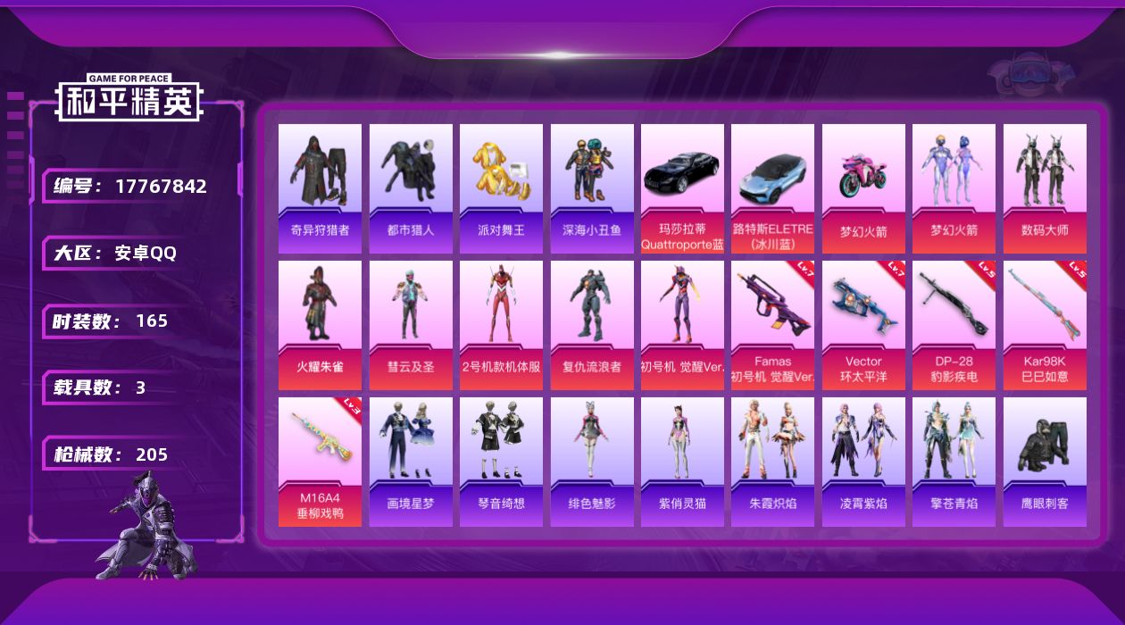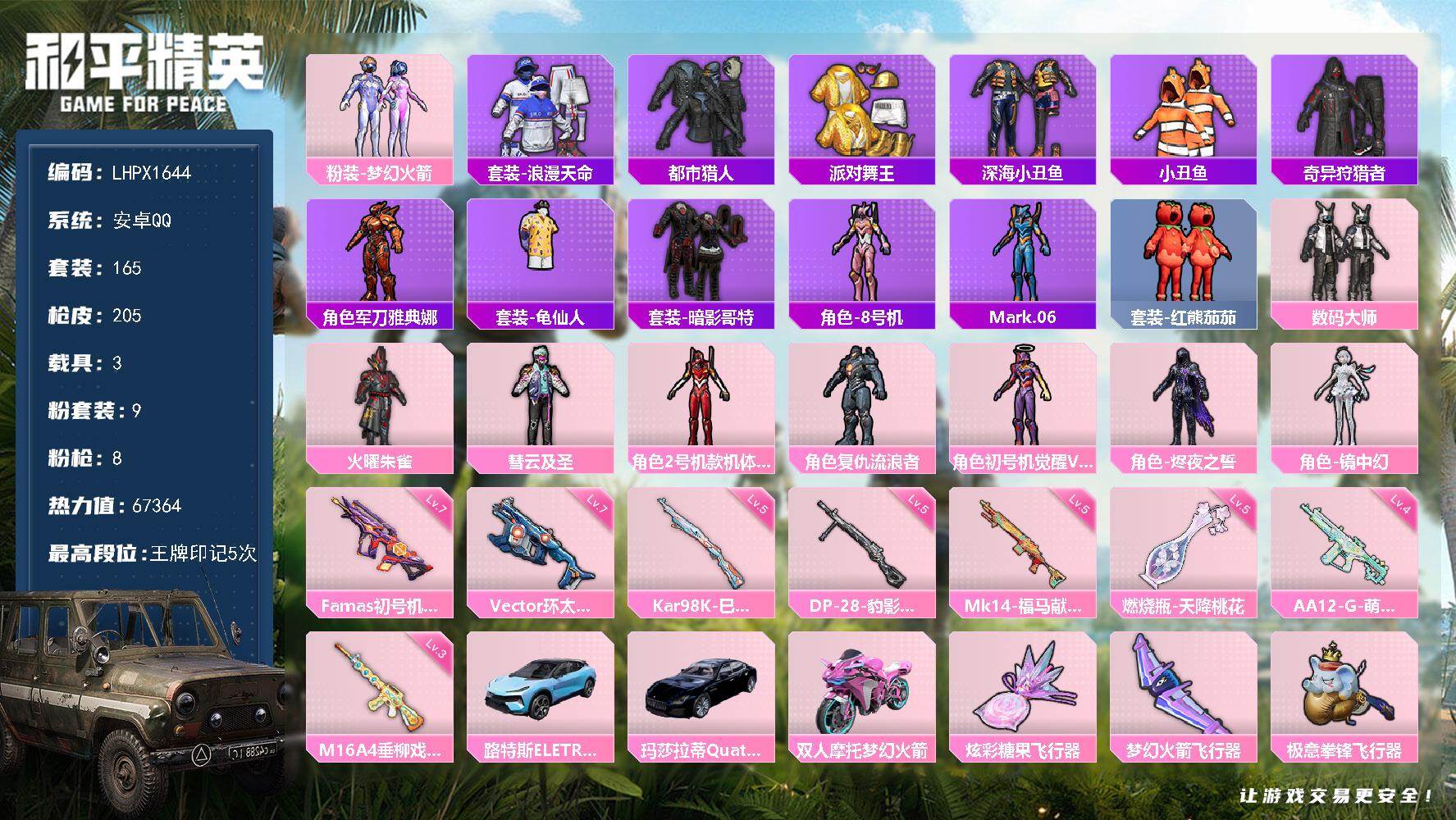 - [14038673]【特价!急出!】安卓 手Q-11粉装-13特效枪-2载具-4粉色飞行器-72361热力值-11王牌印记-142套装-215枪皮 【热门品类】:套装-小丑鱼,套装-龟仙人 【粉色载具】:晶梦灵驹,黑曜夜骑 【粉色套装】:粉装-寒光使者,粉装-莲影清波,角色-烟云彩露,角色-美琪,粉装-金丰海韵,角色-冷漠罗丽,角色-荧海星豚,角色-奇迹舞步 美琪,角色-奇迹舞步 美雪,角色-花灵,角色-羊梦糖心 【粉色枪皮等级】:M416-电玩时刻(五级),GROZA-镜光银凌(五级),AUG-暖羊咩咩(五级),蜜獾-荧海星豚(五级),汤姆逊-热量炸弹(五级),Kar98K-巳巳如意(五级),Mk14-甜梦熊击(五级),莫辛纳甘-未来领航者(四级),AMR-智耀战神(五级),DP-28-千金淑猫(五级),DP-28-豹影疾电(五级),PKM-江南烟雨(五级),MG-36-沧焰双生(五级) 【粉色枪皮】:M416-电玩时刻,GROZA-镜光银凌,AUG-暖羊咩咩,蜜獾-荧海星豚,汤姆逊-热量炸弹,Kar98K-巳巳如意,Mk14-甜梦熊击,莫辛纳甘-未来领航者,AMR-智耀战神,DP-28-千金淑猫,DP-28-豹影疾电,PKM-江南烟雨,MG-36-沧焰双生 【粉色飞行器】:英伦信使飞行器,晶梦幻蝶飞行器,彩虹独角兽飞行器,灵猫魔法师飞行器 【粉色降落伞】:花间之火降落伞,焦糖拿铁降落伞,恐龙拽拽降落伞,仲夏莫吉托降落伞,莲影清波降落伞,蜜语绒猫降落伞,江南烟雨降落伞,精灵梦叶罗丽降落伞,鸢尾晶梦降落伞,创世·救赎降落伞,星梦奇缘降落伞,千金淑猫降落伞,动力核心降落伞,赛博古神降落伞,晶梦幻蝶降落伞,樱桃泡泡降落伞,星月云朵降落伞,雪月幻音降落伞,幻彩电音降落伞,冷漠罗丽降落伞,智趣喵喵降落伞,荧海星豚降落伞,灵猫魔法师降落伞,绯穹魔姬降落伞 【稀有套装】:套装-龟仙人,套装-绒宝小鹅,套装-巳巳如意,套装-雏菊兔兔,套装-萝兰蝴蝶,套装-小熊娃娃,套装-糖糖葫芦,套装-青团波波,套装-棉花软糖,角色-都市丽猫,角色-摩登魅猫,套装-燕燕于飞,套装-鱼渊荷华,套装-辉光之湖,套装-晶灵使者,套装-晶辉守护,套装-白辉玉蕊,套装-雪夜云雾,套装-晨曦轻云,套装-粉恋花,套装-紫幽梦,套装-蓝冰羽,角色-鲛海歌灵,套装-霓虹热舞,套装-彩虹兔,套装-云朵鹅,套装-雪绒豹,套装-蜜露汐语