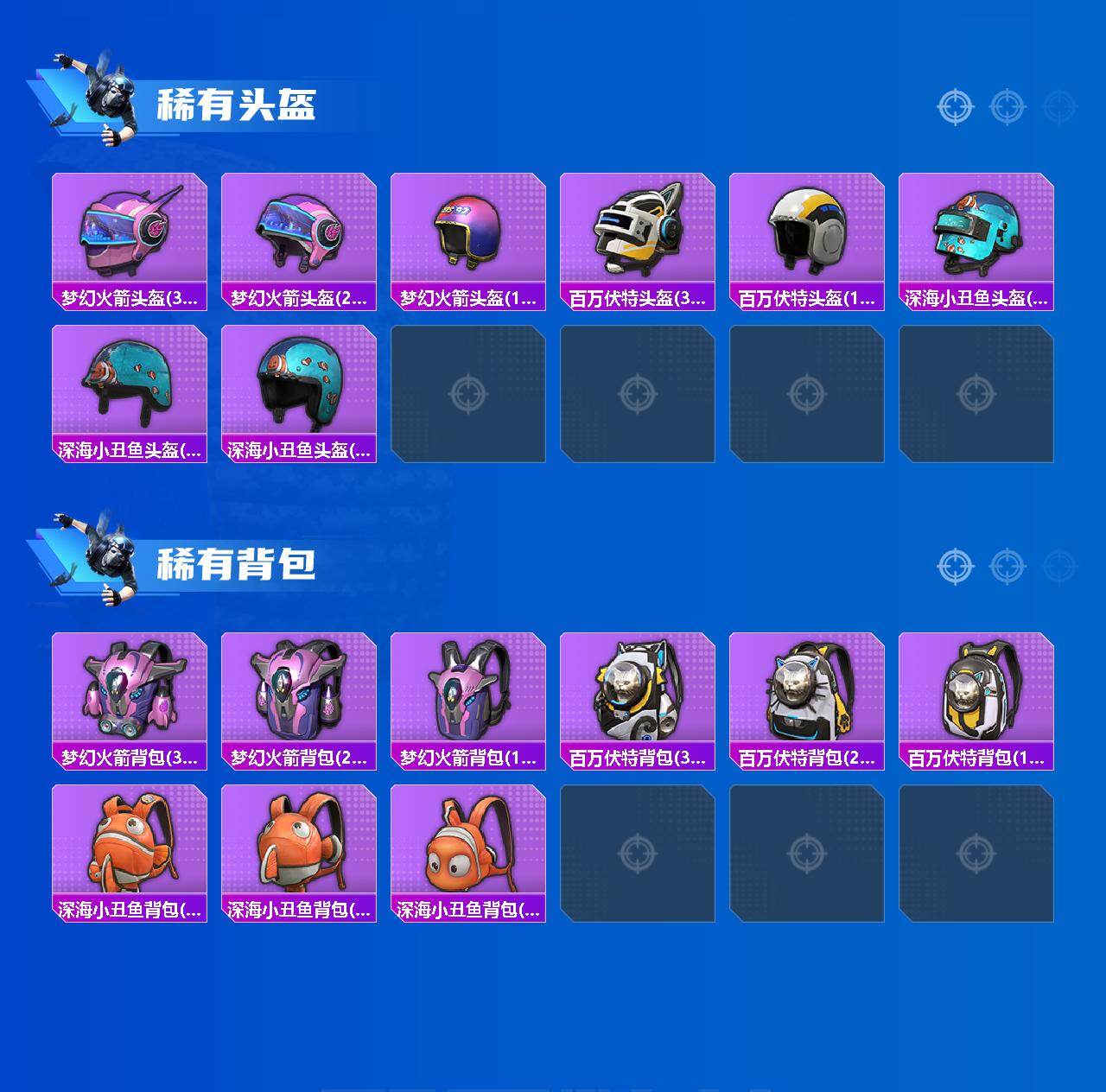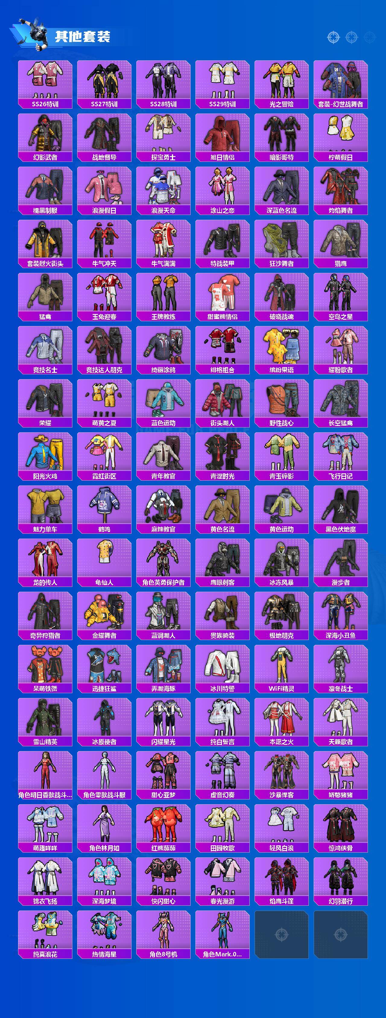套装-梦幻火箭,套装-都市猎人,套装-派对舞王,套装-深海小丑鱼,套装-奇异狩猎者,套装-数码大师,套装-火曜朱雀,套装-彗云及圣,角色-2号机款机体服,角色-复仇流浪者,角色-觉醒初号机,套装-鹰眼刺客,套装-呆萌铁蟹,套装-迅捷狂鲨