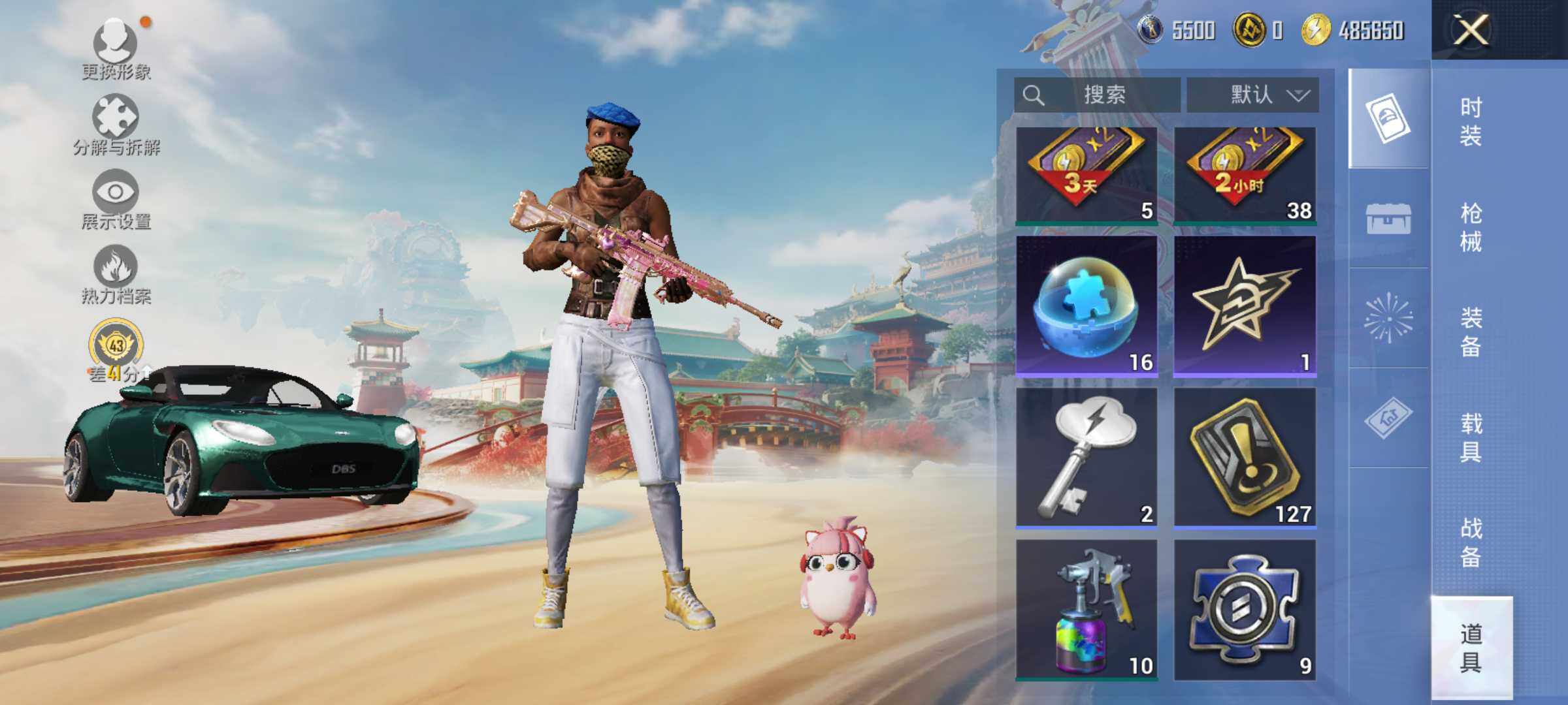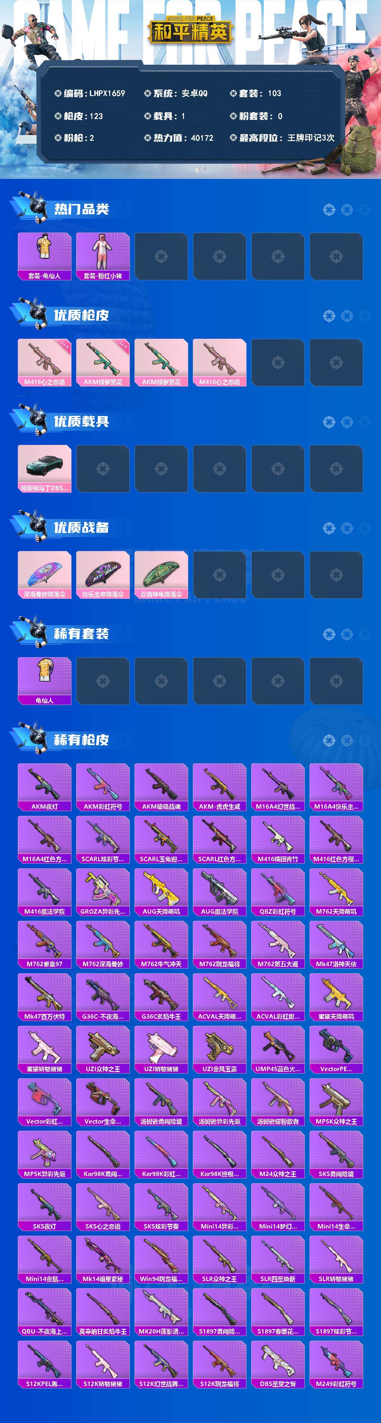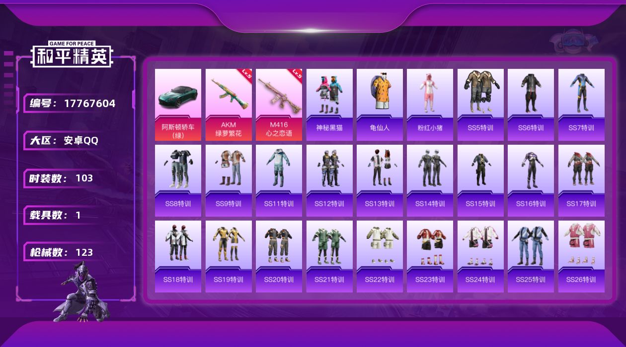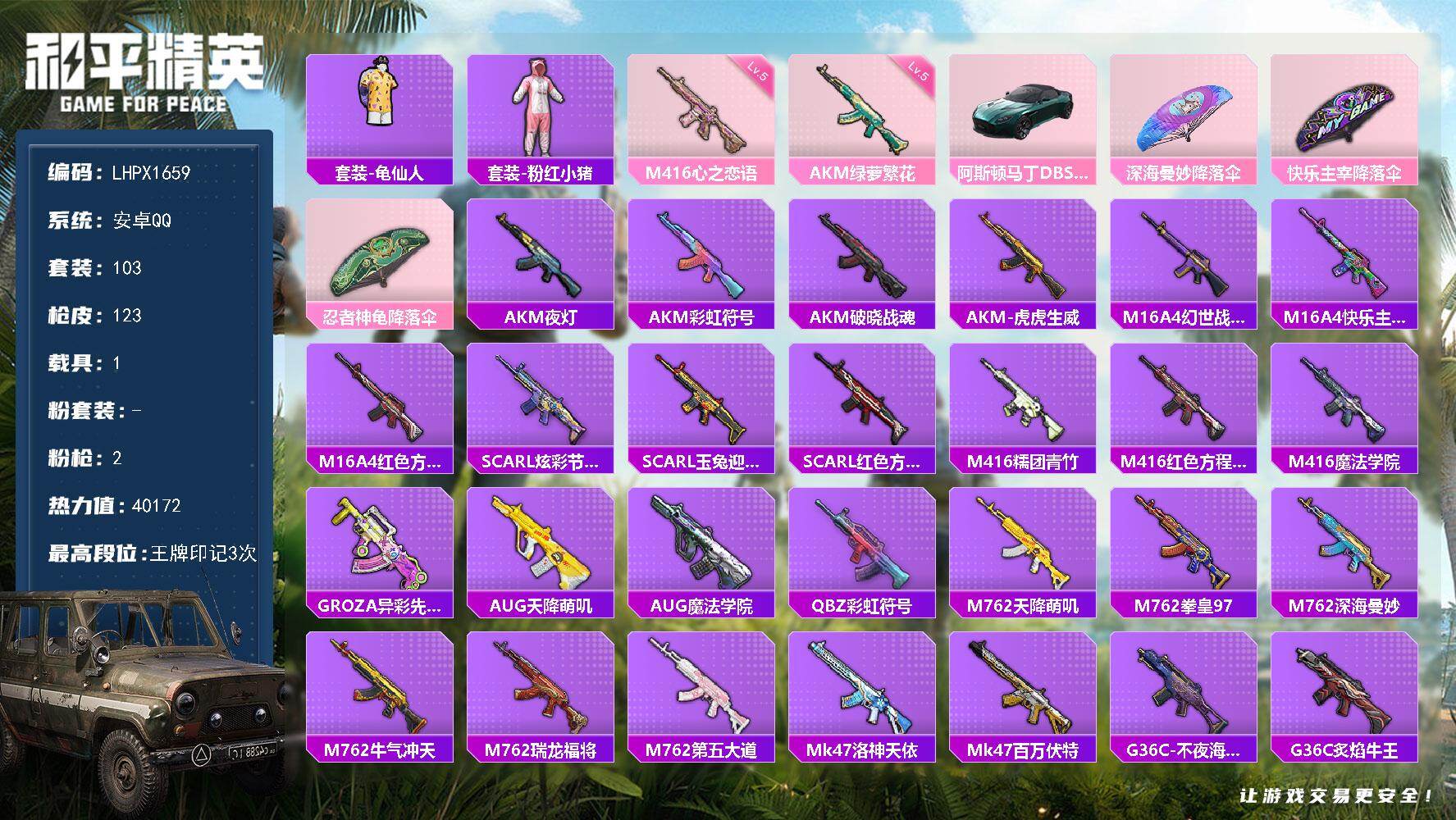 [17767604]【特价出售/店主推荐】安卓 手Q-2特效枪-1载具-40172热力值-3王牌印记-103套装-123枪皮【热门品类】:套装-龟仙人,套装-粉红小猪【粉色枪皮等级】:AKM-绿萝繁花(五级),M416-心之恋语(五级)【粉色载具】:阿斯顿马丁DBS(绿)