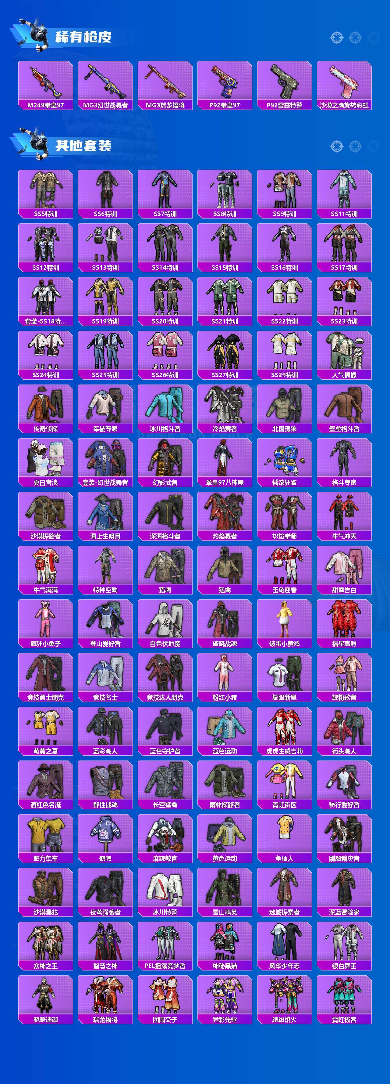 - [16336383]【特价出售/店主推荐】苹果 微信-无敌战神框-33粉装-31特效枪-7载具-5粉色飞行器-156348热力值-21王牌印记-283套装-412枪皮 【热门品类】:粉装-怪诞乔克,粉装-雪国幻梦,粉装-梦幻火箭,粉装-童趣迷兔,粉装-缤纷油彩,套装-浪漫天命,套装-赤蝎幽灵,套装-都市猎人,套装-冥河战士,套装-派对舞王,套装-深海小丑鱼,套装-小丑鱼,套装-奇异狩猎者,套装-胖达圆圆,套装-动感兔斯基人偶服,套装-AG战队服,角色-忠真马岱,套装-潮萌小黄鸭,套装-暗影哥特,套装-浪漫波比,套装-萌熊伴侣,角色-六号稻草人,M416-星际漫游,大砍刀-青龙偃月刀,撬棍-龙胆亮银枪,套装-红熊茄茄 【粉色套装】:粉装-极限特训,粉装-粉色回忆,粉装-怪诞乔克,粉装-甜心巧克力,粉装-宝贝奶油派,粉装-天使彩虹糖,粉装-雪国幻梦,粉装-蝶舞迷情,粉装-梦幻火箭,粉装-金属狂野,粉装-缤纷油彩,粉装-放客神游,粉装-花间之火,粉装-俏皮狐尾,粉装-冰霜白皇,粉装-童趣迷兔,粉装-炙焰红王,粉装-香水柠檬,粉装-馨动时刻,粉装-暗夜玫瑰,角色-闪耀迪迦,粉装-彩虹鹿灵,角色-洛天依,粉装-岚岚物语,粉装-橘柚倾心,粉装-灵感创作师,粉装-炫光之旅,粉装-暖暖奶龙,角色-月影灵韵,角色-樱桃泡泡,角色-冷漠罗丽,角色-荧海星豚,角色-绯穹魔姬 【粉色枪皮等级】:AKM-炫紫旋律(一级),AKM-百合蜜语(七级),AKM-魔法神域(三级),SCAR-L-童趣迷兔(一级),SCAR-L-金蛇镇世(六级),M416-心之恋语(一级),M416-暖熊萌萌(七级),GROZA-焦糖拿铁(四级),AUG-超新星(五级),M762-甜蜜誓约(六级),蜜獾-荧海星豚(一级),蜜獾-异瞳寒姬(五级),UZI-绮梦青鸾(五级),UMP45-相思残雪(四级),Vector-灵感创作师(六级),Vector-绯穹魔姬(一级),汤姆逊-热量炸弹(五级),P90-能量风暴(五级),P90-冷漠罗丽(一级),Kar98K-绿意幻情(三级),Kar98K-巳巳如意(五级),Kar98K-圣域龙灵(三级),AWM-橘柚倾心(四级),Mk14-樱桃泡泡(四级),Mk14-甜梦熊击(五级),AMR-智耀战神(四级),S12K-海渊国主(五级),DP-28-豹影疾电(五级),MG3-洛神天依(四级),平底锅-林间