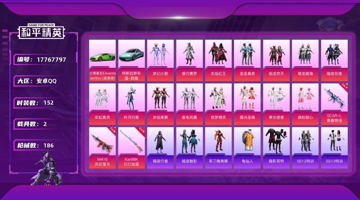 [17767797]安卓 手Q-15粉装-3特效枪-2载具-4粉色飞行器-73633热力值-6王牌印记-152套装-186枪皮 【热门品类】:粉装-梦幻火箭,角色-军刀雅典娜,套装-暗夜行者,套装-龟仙人,套装-暗影哥特 【粉色套装】:粉装-梦幻火箭,粉装-银刃赛罗,粉装-炙焰红王,粉装-显圣真君,粉装-焰龙焚天,粉装-银龙傲海,粉装-暗夜玫瑰,粉装-彩虹鹿灵,粉装-吟月归客,粉装-赤焰黑爵,粉装-紫电风暴,粉装-筑梦精灵,粉装-霞光圣骑,粉装-寒光使者,粉装-飒粉甜心 【粉色枪皮等级】:SCAR-L-青春物语(七级),M416-风花雪月(六级),Kar98K-巳巳如意(五级) 【粉色载具】:特斯拉Roadster(水滴蓝),兰博基尼Aventador SVJ(翡翠绿) 【粉色枪皮】:SCAR-L-青春物语,M416-风花雪月,Kar98K-巳巳如意 【粉色飞行器】:梦幻火箭飞行器,心之恋语飞行翼,林间仙鹿飞行器,天之羽翼飞行器 【粉色降落伞】:春暖花开降落伞,梦幻火箭降落伞,诡面斩降落伞,阿狸红降落伞,银刃赛罗降落伞,烈焰拳霸降落伞,暗夜玫瑰降落伞,天之羽翼降落伞,碧影闪光降落伞,绒雪飘舞降落伞,彩虹甜喵降落伞,旋转彩虹降落伞,冷漠罗丽降落伞 【稀有套装】:套装-龟仙人 【稀有枪皮】:AKM-四圣焕新,AKM-夜灯,AKM-彩虹符号,AKM-春暖花开,AKM-灼热熔岩,AKM-萌趣颜团子,AKM-虎虎生威,AKM-霓虹街区,M16A4-凝视深渊,M16A4-幻世战舞者,M16A4-甜心亚梦,SCAR-L-暗夜玫瑰,SCAR-L-炫彩节奏,SCAR-L-玉兔迎春,M416-暗夜行者,M416-梨园星光,M416-糯团青竹,M416-绯红前夜,M416-蓝色火焰,GROZA-异彩先驱,GROZA-彩虹符号,GROZA-懵萌河马,GROZA-林间仙鹿,GROZA-治愈之星,GROZA-田园牧歌,GROZA-蓝莓炮弹,GROZA-马卡龙,AUG-灵符少年,AUG-耀粉歌者,AUG-青春冒险家,QBZ-原初圣火,QBZ-彩虹符号,QBZ-潮汐统领,QBZ-飞驰魅影,M762-天降萌叽,M762-牛气冲天,M762-瑞龙福将,M762-绯红前夜,M762-镭射皇者,M762-风花雪月,Mk47-天之羽翼,Mk47-妙红点点,Mk47-青春冒险家,G36C-懵萌河马,G36C-时空追击者,G36
