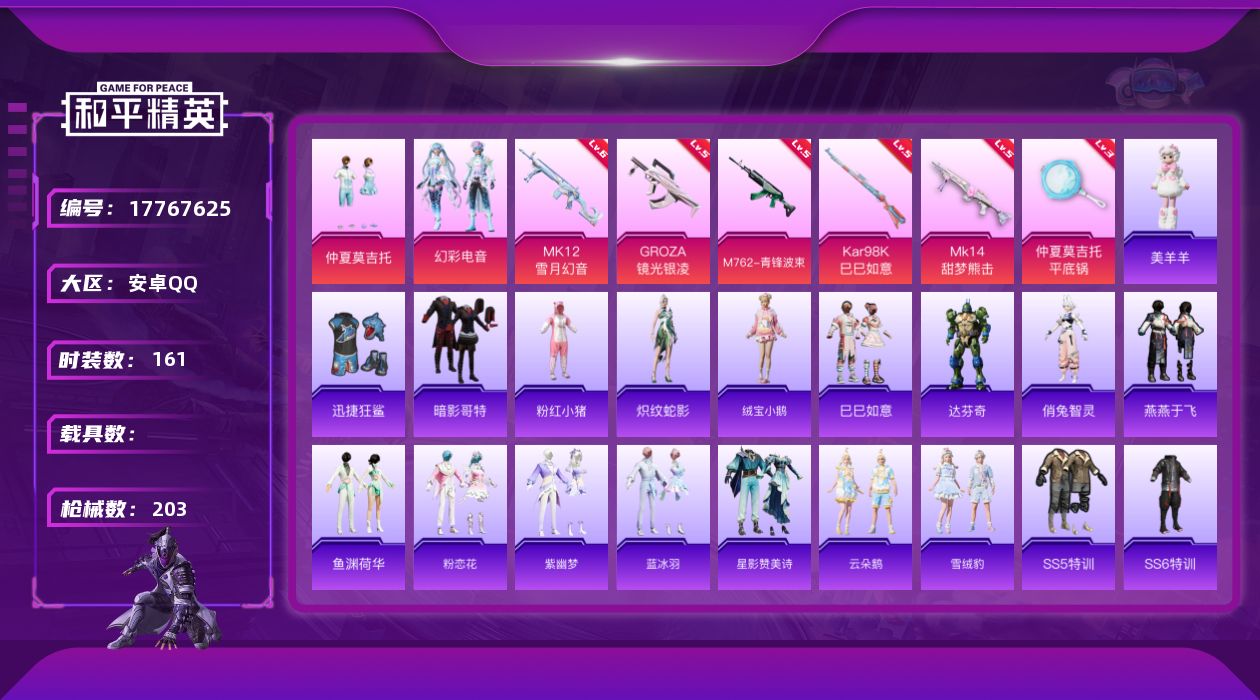 [17767625]安卓 手Q-2粉装-6特效枪-0载具-4粉色飞行器-59638热力值-5王牌印记-161套装-203枪皮