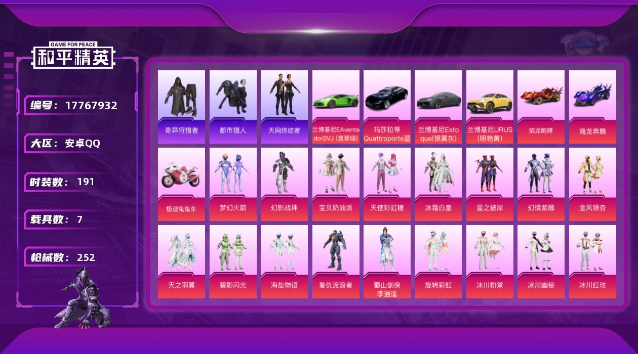 [17767932]安卓 手Q-18粉装-8特效枪-7载具-6粉色飞行器-89929热力值-7王牌印记-191套装-252枪皮