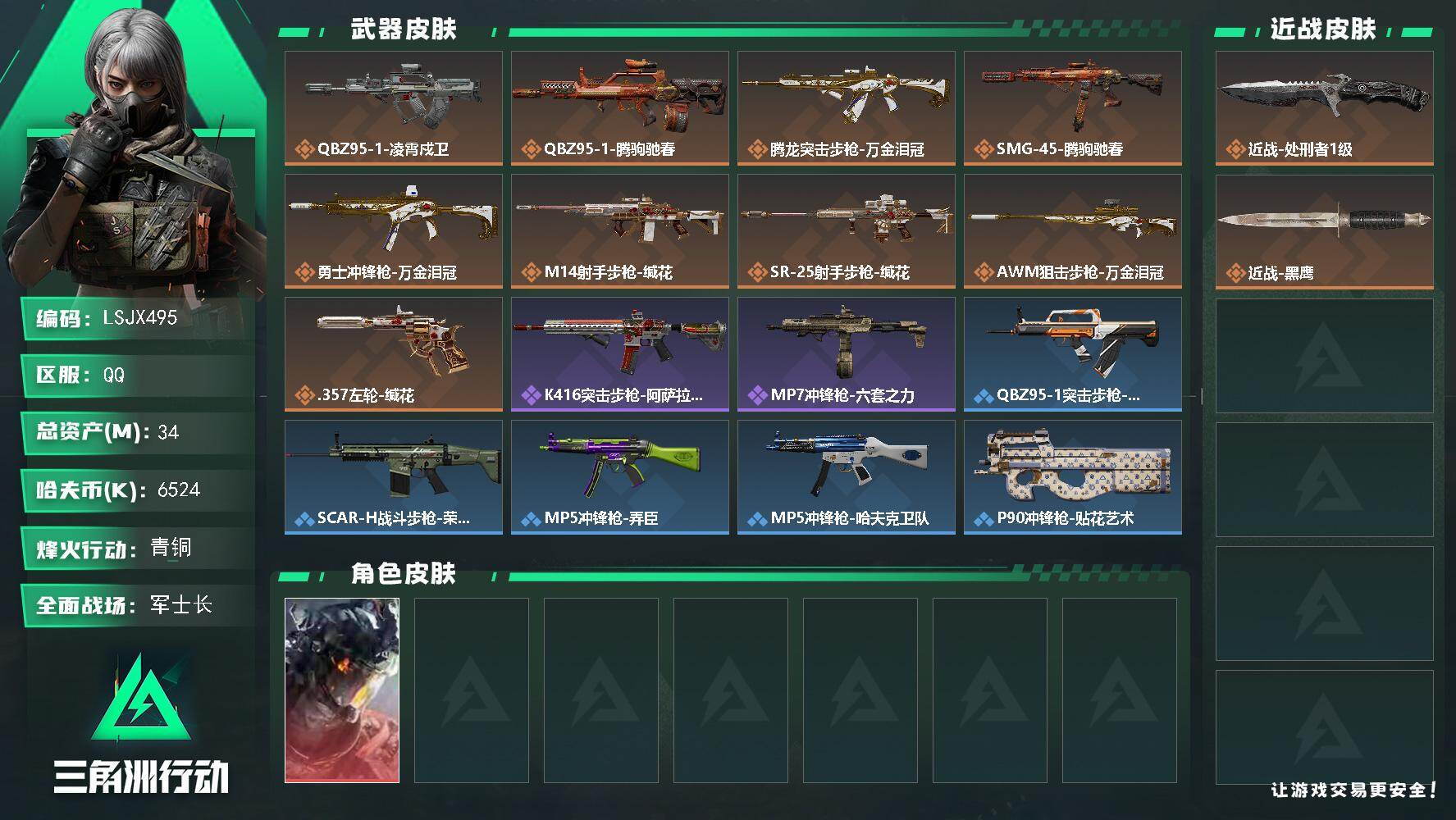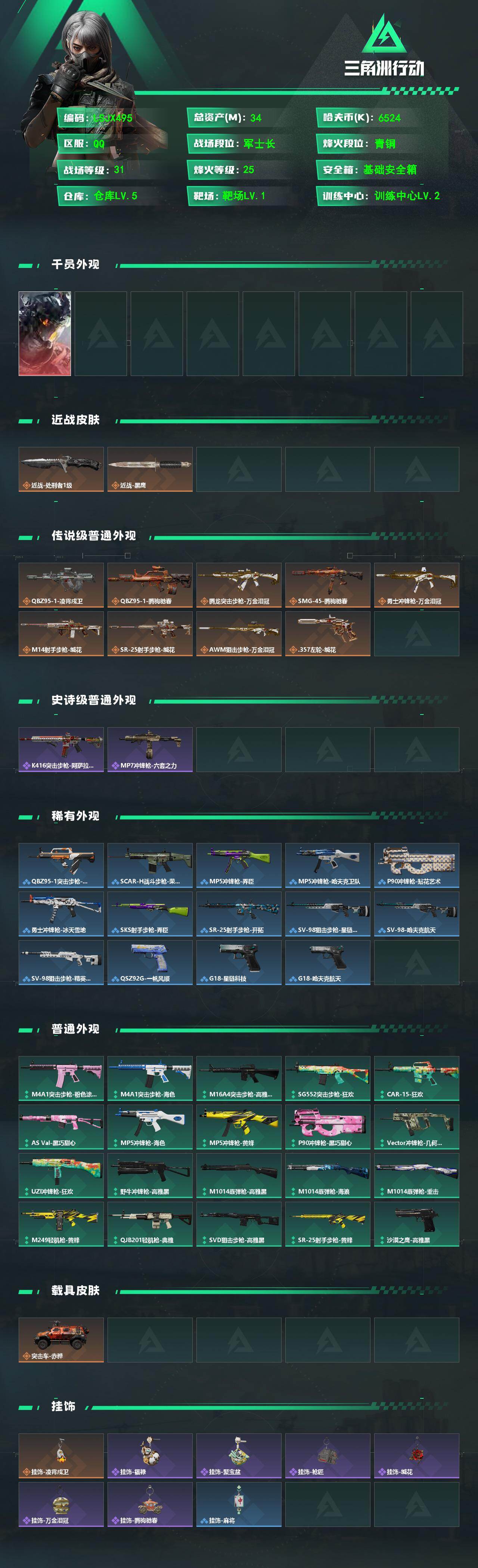[17767887]【特价出售/店主推荐】 34m总资产-6524k哈夫币-25烽火等级-青铜-31战场等级-军士长 【干员外观】:威龙-凌霄戍卫 【近战皮肤】:近战-处刑者1级,近战-黑鹰 【传说外观】:QBZ95-1突击步枪-凌霄戍卫,QBZ95-1突击步枪-腾驹驰春,腾龙突击步枪-万金泪冠,SMG-45冲锋枪-腾驹驰春,勇士冲锋枪-万金泪冠,M14射手步枪-缄花,SR-25射手步枪-缄花,AWM狙击步枪-万金泪冠,.357左轮-缄花 【史诗外观】:K416突击步枪-阿萨拉特攻,MP7冲锋枪-六套之力 【稀有外观】:QBZ95-1突击步枪-前沿科技,SCAR-H战斗步枪-荣耀列队,MP5冲锋枪-弄臣,MP5冲锋枪-哈夫克卫队,P90冲锋枪-贴花艺术,勇士冲锋枪-冰天雪地,SKS射手步枪-弄臣,SR-25射手步枪-开拓,SV-98狙击步枪-星链科技,SV-98狙击步枪-哈夫克航天,SV-98狙击步枪-精英联盟,QSZ92G-一帆风顺,G18-星链科技,G18-哈夫克航天 【普通外观】:M4A1突击步枪-粉色涂装,M4A1突击步枪-海色,M16A4突击步枪-高雅黑,SG552突击步枪-狂欢,CAR-15突击步枪-狂欢,AS Val突击步枪-黑巧甜心,MP5冲锋枪-海色,MP5冲锋枪-黄蜂,P90冲锋枪-黑巧甜心,Vector冲锋枪-几何迷彩,UZI冲锋枪-狂欢,野牛冲锋枪-高雅黑,M1014霰弹枪-高雅黑,M1014霰弹枪-海浪,M1014霰弹枪-重击,M249轻机枪-黄蜂,QJB201轻机枪-典雅,SVD狙击步枪-高雅黑,SR-25射手步枪-黄蜂,沙漠之鹰-高雅黑 【载具外观】:突击车-赤骅 【挂饰】:挂饰-凌霄戍卫,挂饰-福禄,挂饰-聚宝盆*3,挂饰-枪匠,挂饰-缄花,挂饰-万金泪冠,挂饰-腾驹驰春,挂饰-麻将*10