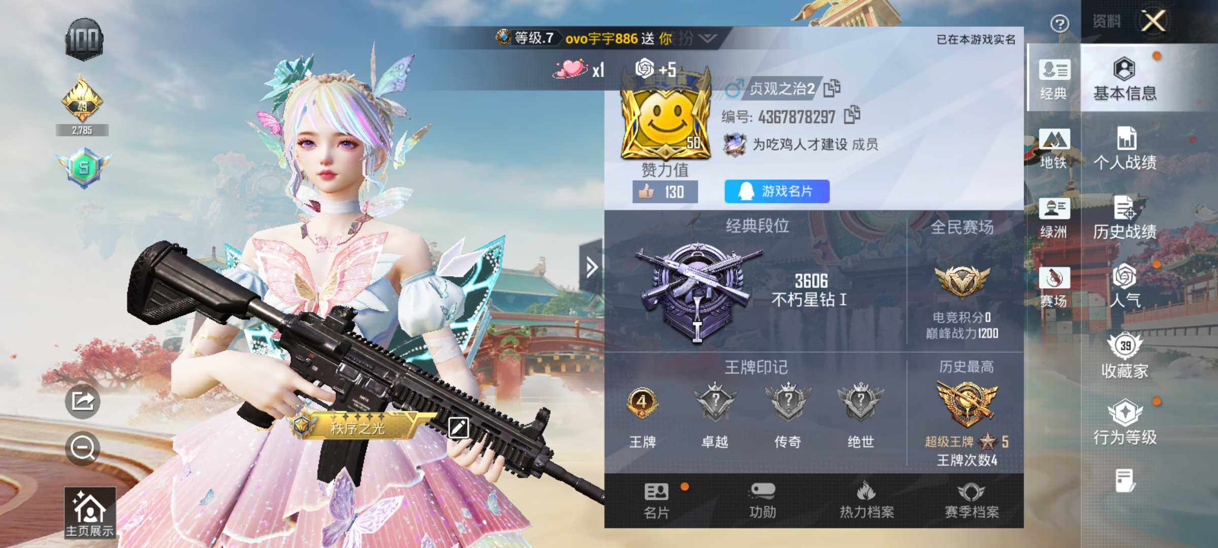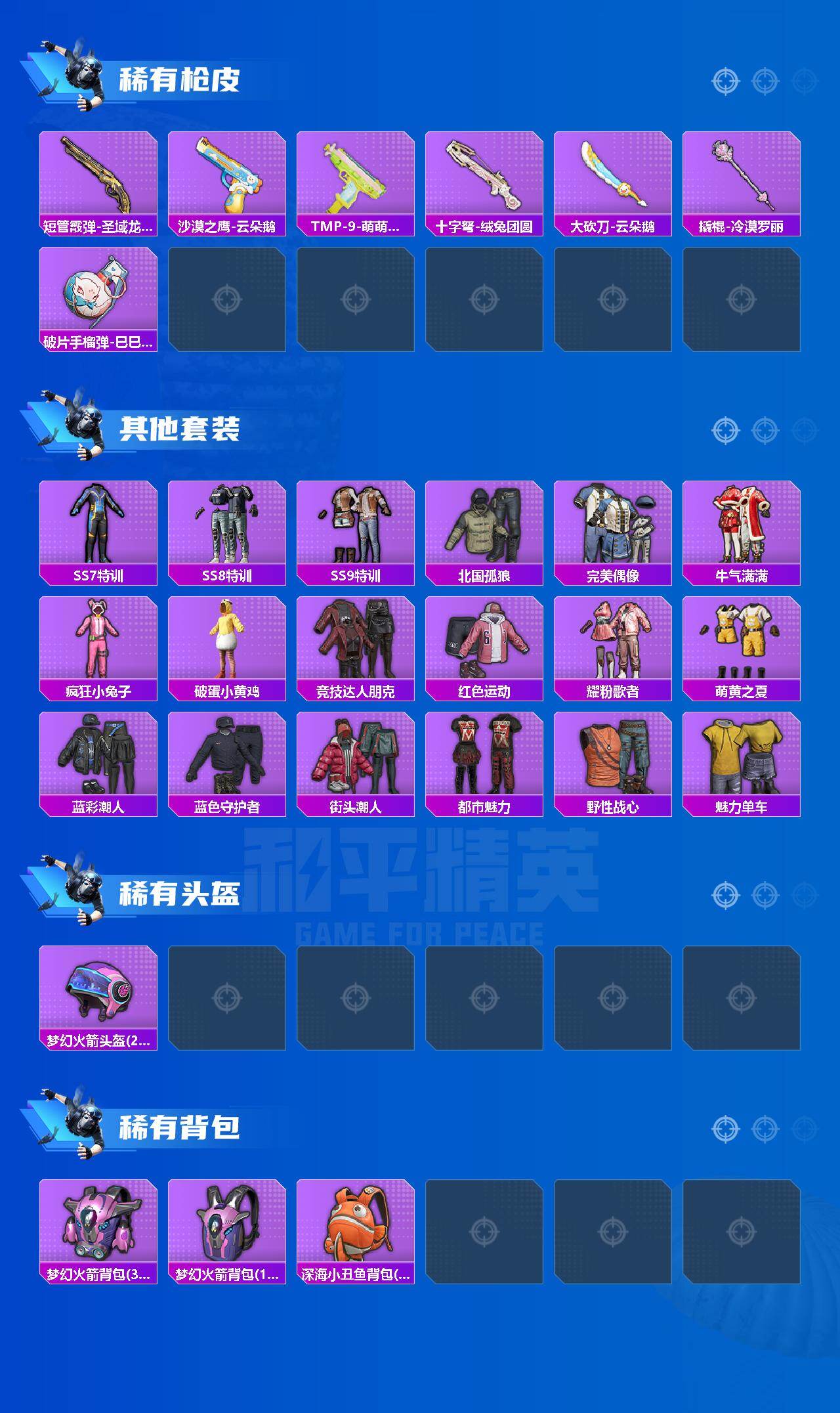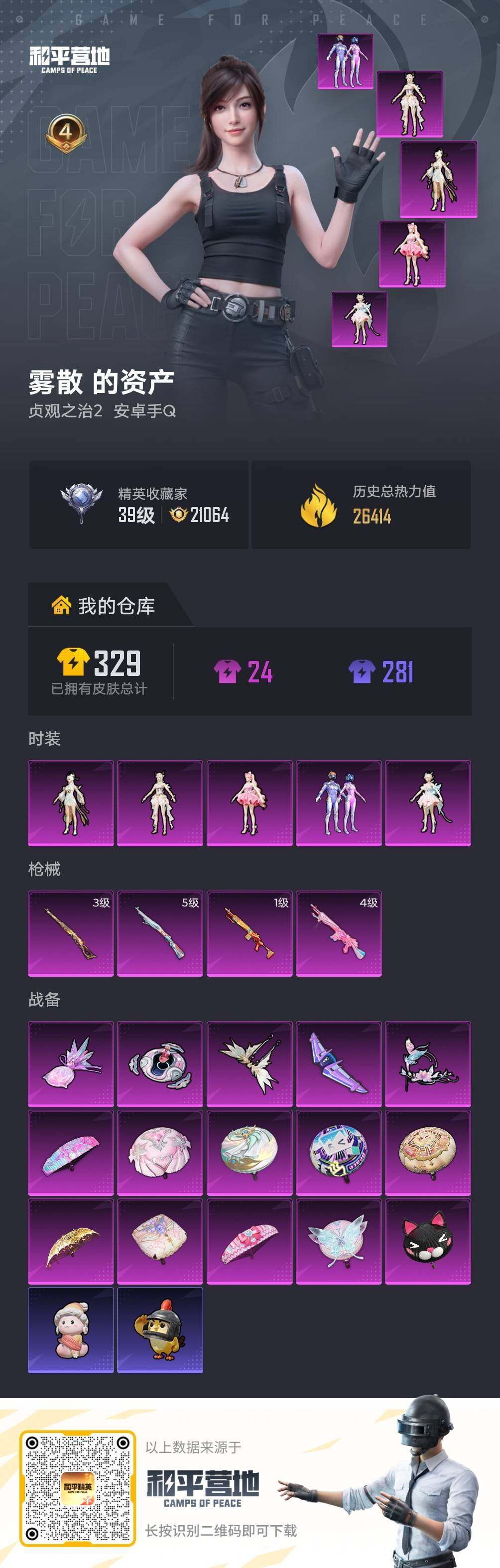 - [15190481]素材身法号 安卓 手Q-10粉装-5特效枪-5载具-4粉色飞行器-6.4w热力值-4王牌印记-119套装-179枪皮【热门品类】:粉装-梦幻火箭,套装-动感兔斯基人偶服,套装-暗影哥特,角色-Mark.06【粉色载具】:特斯拉Roadster(沁心粉),玛莎拉蒂Ghibli(粉),玛莎拉蒂Ghibli(蓝),灵鼠银迹,空客H135-蔚蓝之翼【粉色套装】:粉装-宝贝奶油派,粉装-天使彩虹糖,粉装-梦幻火箭,粉装-翡翠骑士,粉装-绚金战神,粉装-馨动时刻,粉装-烈焰拳霸,粉装-暗夜玫瑰,粉装-吟月归客,粉装-金丰海韵【粉色枪皮等级】:M416-五爪金龙(七级),UMP45-宇宙意志(三级),AKS-74U-星穹咏叹调(七级),Kar98K-巳巳如意(五级),DP-28-豹影疾电(五级)【粉色飞行器】:梦幻火箭飞行器,夏日绵绵冰飞行器,深渊漩涡飞行器