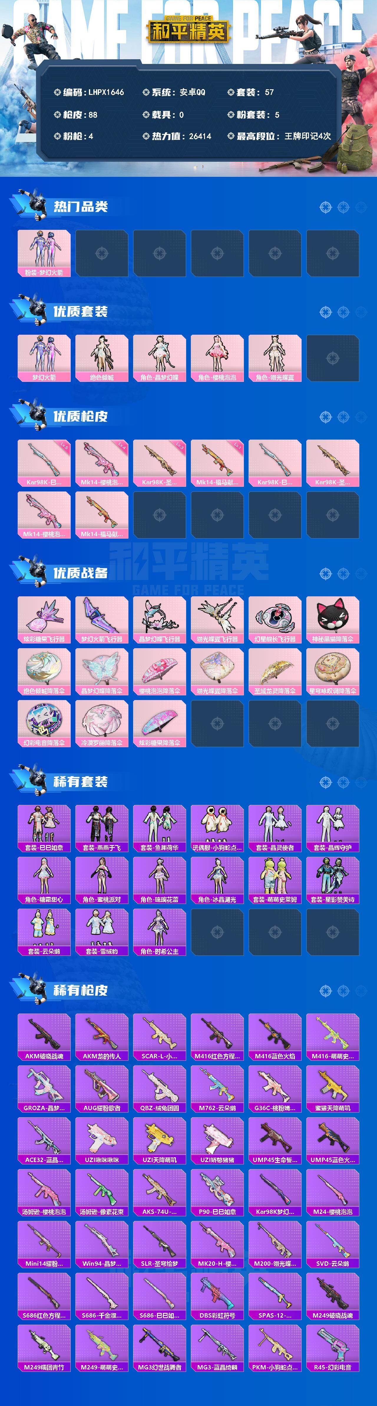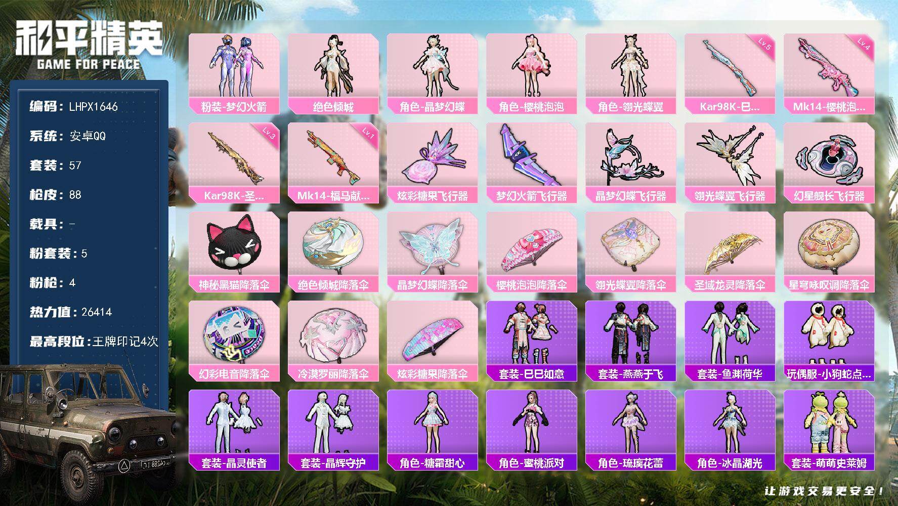 [17767824]【特价出售/店主推荐】安卓 手Q-5粉装-4特效枪-5粉色飞行器-26414热力值-4王牌印记-57套装-88枪皮【热门品类】:粉装-梦幻火箭【粉色套装】:粉装-梦幻火箭,角色-绝色倾城,角色-晶梦幻蝶,角色-樱桃泡泡,角色-翎光蝶翼【粉色枪皮等级】:Kar98K-巳巳如意(五级),Kar98K-圣域龙灵(三级),Mk14-樱桃泡泡(四级),Mk14-福马献瑞(一级)【粉色枪皮】:Kar98K-巳巳如意,Kar98K-圣域龙灵,Mk14-樱桃泡泡,Mk14-福马献瑞【粉色飞行器】:炫彩糖果飞行器,梦幻火箭飞行器,晶梦幻蝶飞行器,翎光蝶翼飞行器,幻星舰长飞行器