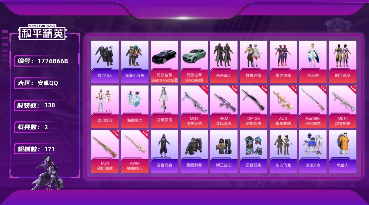 [17768668]安卓 手Q-8粉装-8特效枪-2载具-1粉色飞行器-57659热力值-9王牌印记-138套装-171枪皮 【热门品类】:套装-浪漫天命,套装-都市猎人,套装-深海小丑鱼,套装-暗夜行者,套装-AG战队服,套装-龟仙人,套装-暗影哥特 【粉色套装】:粉装-未来战士,粉装-蝶舞迷情,粉装-星之彼岸,角色-洛天依,粉装-朗月武圣,粉装-冰川红玫,粉装-海螺星光,角色-冷漠罗丽 【粉色枪皮等级】:AKM-星际浪客(六级),AUG-暖羊咩咩(五级),Kar98K-巳巳如意(五级),M24-翩跹演武(四级),AWM-橘柚倾心(四级),Mk14-甜梦熊击(五级),DP-28-豹影疾电(五级),MG3-洛神天依(七级) 【粉色载具】:玛莎拉蒂Quattroporte(夜幕蓝),玛莎拉蒂Grecale(薄荷绿) 【粉色枪皮】:AKM-星际浪客,AUG-暖羊咩咩,Kar98K-巳巳如意,M24-翩跹演武,AWM-橘柚倾心,Mk14-甜梦熊击,DP-28-豹影疾电,MG3-洛神天依 【粉色飞行器】:春暖花开飞行器 【粉色降落伞】:百万伏特降落伞,未来战士降落伞,春暖花开降落伞,星之彼岸降落伞,洛神天依降落伞,橘柚倾心降落伞,旋转彩虹降落伞,星际浪客降落伞,海螺星光降落伞,第五大道降落伞,江南烟雨降落伞,临安公主降落伞,星穹咏叹调降落伞,冷漠罗丽降落伞,炫彩糖果降落伞 【稀有套装】:套装-龟仙人,套装-巳巳如意,套装-燕燕于飞,套装-鱼渊荷华,套装-旋风灵鼠,套装-极速光影,套装-彩虹兔,套装-云朵鹅,套装-雪绒豹 【稀有枪皮】:AKM-星之彼岸,AKM-春暖花开,AKM-百万伏特,AKM-破晓战魂,AKM-缤纷海域,M16A4-红色方程式,M16A4-蓝色火焰,SCAR-L-夜灯,SCAR-L-玉兔迎春,SCAR-L-致命红樱,M416-暗夜行者,M416-糯团青竹,M416-红色方程式,M416-绯红前夜,M416-黄金狮王,GROZA-影袭,GROZA-春暖花开,GROZA-田园牧歌,AUG-天降萌叽,AUG-海螺星光,QBZ-洛神天依,M762-彩虹符号,M762-橘柚倾心,M762-云朵鹅,Mk47-洛神天依,AC-VAL-天降萌叽,AC-VAL-快闪甜心,AC-VAL-魅影蝠王,蜜獾-天降萌叽,蜜獾-娇憨猪猪,UZI-天降萌叽,UZI-娇憨猪猪,UZI-影袭,UMP45-夜灯