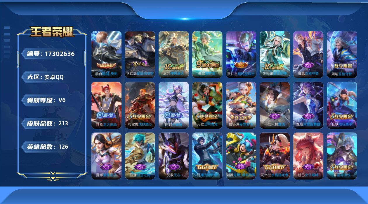 [17302636]可二次【特价出售/店主推荐/3141星币可兑换星元皮肤/】:安卓Q-V6-最强王者段位-126英雄-213皮肤-1典藏皮肤-1星元-3传说-54史诗