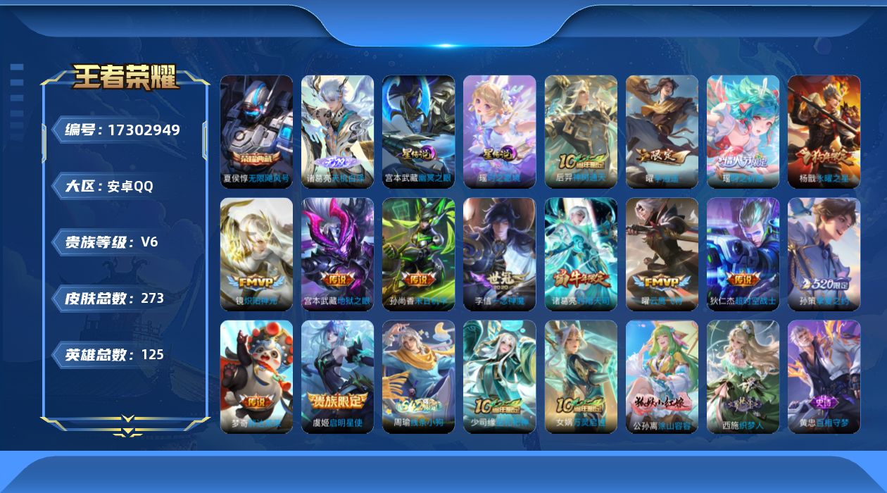 [17302949]【特价出售/店主推荐 对抗路31段 游走25段 1市标】安卓Q-V6-尊贵铂金II段位-125英雄-273皮肤-1典藏皮肤-1无双-2星传说-14传说-83史诗 【荣耀典藏】:夏侯惇无限飓风号 【无双皮肤】:诸葛亮天机白泽 【传说皮肤】:后羿神树通天,孙策挚爱之约,瑶时之祈愿,曜李逍遥 ,诸葛亮时雨天司,镜炽阳神光,虞姬启明星使,曜云鹰飞将,李信一念神魔,梦奇胖达荣荣,杨戬永曜之星,孙尚香末日机甲,宫本武藏地狱之眼,狄仁杰超时空战士 【限定皮肤】:白起狰,姜子牙天穹之誓,狄仁杰阴阳师,虞姬凯尔特女王,赵云皇家上将,墨子神迹守卫,孙尚香蔷薇恋人,庄周蜃楼王,庄周高山流水,高渐离玩趣恶龙,孙膑妖精王,白起夜都怪侠,芈月重明,芈月幻夜卜梦,吕布猎兽之王,吕布御风骁将,元歌云间偶戏,夏侯惇朔风刀,夏侯惇匿光决锋者,曹操烛龙,典韦穷奇,典韦岱宗,狄仁杰魔术师,狄仁杰万华元夜,达摩沙漠行僧,项羽海滩派对,项羽霸王别姬,老夫子圣诞老人,老夫子醍醐杖,老夫子航海奇遇记,关羽冰锋战神,程咬金演武夺筹,露娜一生所爱,韩信逐梦之影,韩信飞衡,王昭君午后时光,兰陵王金庭之子,花木兰青春决赛季,花木兰瑞麟志,亚瑟潮玩骑士王,孙悟空大圣娶亲,牛魔御旌,后羿圣弓游侠,李元芳云中旅人,虞姬启明星使,钟馗驱傩正仪,杨戬永曜之星,干将莫邪真爱魔法,雅典娜单词大作战,蔡文姬繁星吟游,太乙真人饕餮,鬼谷子原初探秘者,鬼谷子五谷丰年,诸葛亮时雨天司,黄忠火炮绅士,苏烈千军破阵,百里玄策原初追逐者,弈星混沌棋,梦奇顽趣,公孙离蜜橘之夏,公孙离玉兔公主,沈梦溪大漠名商,明世隐疑决卦,明世隐吟游魔法,裴擒虎李小龙,裴擒虎擒涛扼浪,狂铁御狮,狂铁电玩高手,米莱狄御霄,瑶时之祈愿,云中君纤云弄巧,云中君时之祈愿,孙策挚爱之约,上官婉儿梁祝,上官婉儿天狼绘梦者,嫦娥如梦令,曜李逍遥 ,蒙犽狂想玩偶喵,鲁班大师探海日志,镜匿光追影者,桑启海盐诗旅,阿古朵江河有灵,张良古海寻踪,蒙恬荣光圣徽,鬼谷子天穹祈灯,沈梦溪龙舞盛年,刘邦剑破天穹,程咬金群星魔术团,周瑜熔金海岸 【年限皮肤】:杨戬永曜之星,花木兰瑞麟志,典韦岱宗,韩信飞衡,诸葛亮时雨天司,吕布御风骁将 【赛季限定】:庄周蜃楼王,孙膑妖精王,虞姬凯尔特女王,白起狰,太乙真人饕餮,曹操烛龙,芈月重明,典韦穷奇,狂铁御狮,米莱狄御霄,牛魔御旌,夏侯惇朔风刀,弈星混沌棋,
