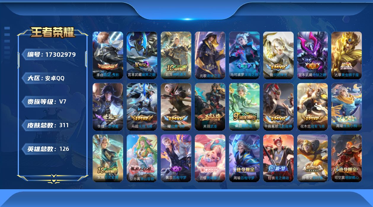 - PX_2052350-安卓V 【可二次】 英雄数量:122 皮肤数量:188 贵族等级:贵族V8 传说数量:0 无双限定1 荣耀典藏2 传说品质17 史诗品质52离恨烟 鸣剑曳影 弑枪猎影 乞巧织情 仲夏夜之梦 一念神魔 云鹰飞将 无双飞将 零号赤焰 山海炽霜斩 齐天大圣 久胜战神 遇见神鼓 绛天战甲 启明星使 时之奇旅鲁班七号 鹤归松栖云缨 鸣野蒿 霜月吟 逐花归海 至尊宝 天才门将 功夫厨神