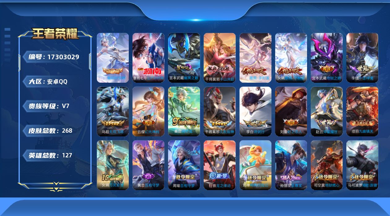 [17303029]【特价急出/详情看图】安卓Q-V7-永恒钻石II段位-127英雄-268皮肤-1典藏皮肤-1珍品传说-1星元-12传说-74史诗