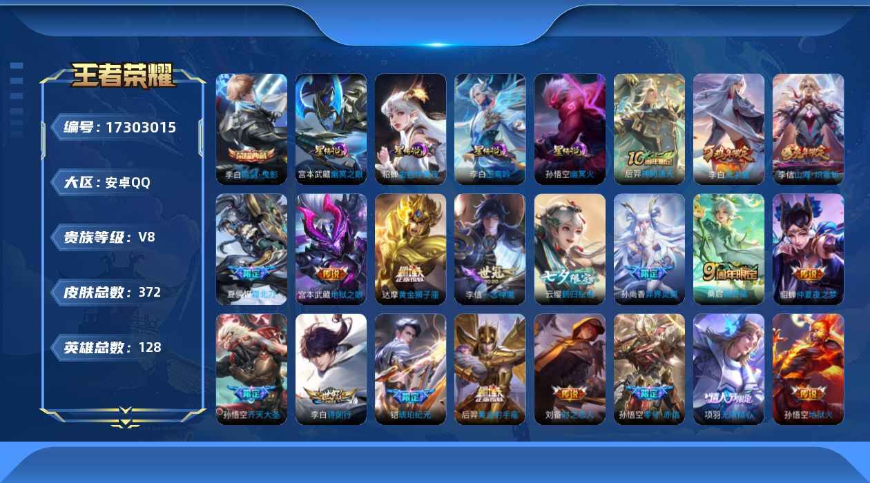 [17303015]【特价出售/店主推荐】安卓Q-V8-永恒钻石I段位-128英雄-372皮肤-1典藏皮肤-5星传说-21传说-115史诗 【英雄全皮】:阿轲全皮,钟馗全皮,李信全皮,空空儿全皮,影全皮 【荣耀典藏】:李白鸣剑曳影 【传说皮肤】:后羿神树通天,桑启鸣野蒿,夏侯惇霜北刀,铠琥珀纪元,云缨鹤归松栖,项羽无限倾心,孙悟空齐天大圣,李信山海炽霜斩,李白诗剑行,孙尚香异界灵契,铠绛天战甲,虞姬启明星使,孙悟空零号赤焰,李信一念神魔,刘备时之恋人,达摩黄金狮子座,后羿黄金射手座,貂蝉仲夏夜之梦,李白凤求凰,宫本武藏地狱之眼,孙悟空地狱火 【限定皮肤】:白起狰,夏侯惇霜北刀,蔡文姬夏日便利店,大乔绒语心约,虞姬夏日便利店,姜子牙天穹之誓,狄仁杰阴阳师,虞姬凯尔特女王,赵云皇家上将,赵云引擎之心,赵云龙胆,赵云百木心枪,墨子神迹守卫,嬴政白昼王子,孙尚香蔷薇恋人,孙尚香异界灵契,鲁班七号狮舞东方,庄周高山流水,高渐离玩趣恶龙,阿轲迷踪丽影,钟无艳超时空战士,扁鹊炼金王,白起夜都怪侠,芈月重明,芈月白晶晶,吕布猎兽之王,周瑜赤莲之焰,元歌无心,夏侯惇朔风刀,甄姬女儿国国王,甄姬游园惊梦,甄姬落雪兰心,曹操烛龙,典韦穷奇,典韦蓝屏警告,典韦岱宗,马可波罗暗影游猎,狄仁杰魔术师,狄仁杰万华元夜,达摩沙漠行僧,项羽海滩派对,项羽无限倾心,老夫子醍醐杖,老夫子航海奇遇记,关羽冰锋战神,程咬金演武夺筹,刘邦夺宝奇兵,韩信逐梦之影,韩信飞衡,韩信傲雪梅枪,兰陵王驯魔猎人,兰陵王金庭之子,花木兰默契交锋,孙悟空美猴王,孙悟空至尊宝,孙悟空大圣娶亲,孙悟空零号赤焰,孙悟空孙行者,孙悟空齐天大圣,牛魔御旌,后羿如梦令,后羿圣弓游侠,李元芳银河之约,李元芳云中旅人,虞姬启明星使,钟馗神迹守卫,钟馗驱傩正仪,杨玉环遇见飞天,女娲朔望之晖,干将莫邪真爱魔法,蔡文姬繁星吟游,太乙真人饕餮,鬼谷子原初探秘者,鬼谷子五谷丰年,铠青龙志,苏烈千军破阵,百里守约朱雀志,弈星混沌棋,沈梦溪星空之诺,沈梦溪大漠名商,明世隐疑决卦,明世隐吟游魔法,裴擒虎李小龙,裴擒虎擒涛扼浪,狂铁御狮,狂铁电玩高手,米莱狄御霄,云中君纤云弄巧,李信山海炽霜斩,伽罗天狼溯光者,盾山御銮,猪八戒西部大镖客,上官婉儿梁祝,嫦娥拒霜思,嫦娥暖冬兔眠,西施玲珑珍味,鲁班大师探海日志,镜匿光追影者,桑启海盐诗旅,戈娅驭风魔法,艾琳流音漫舞,云缨鹤归松栖