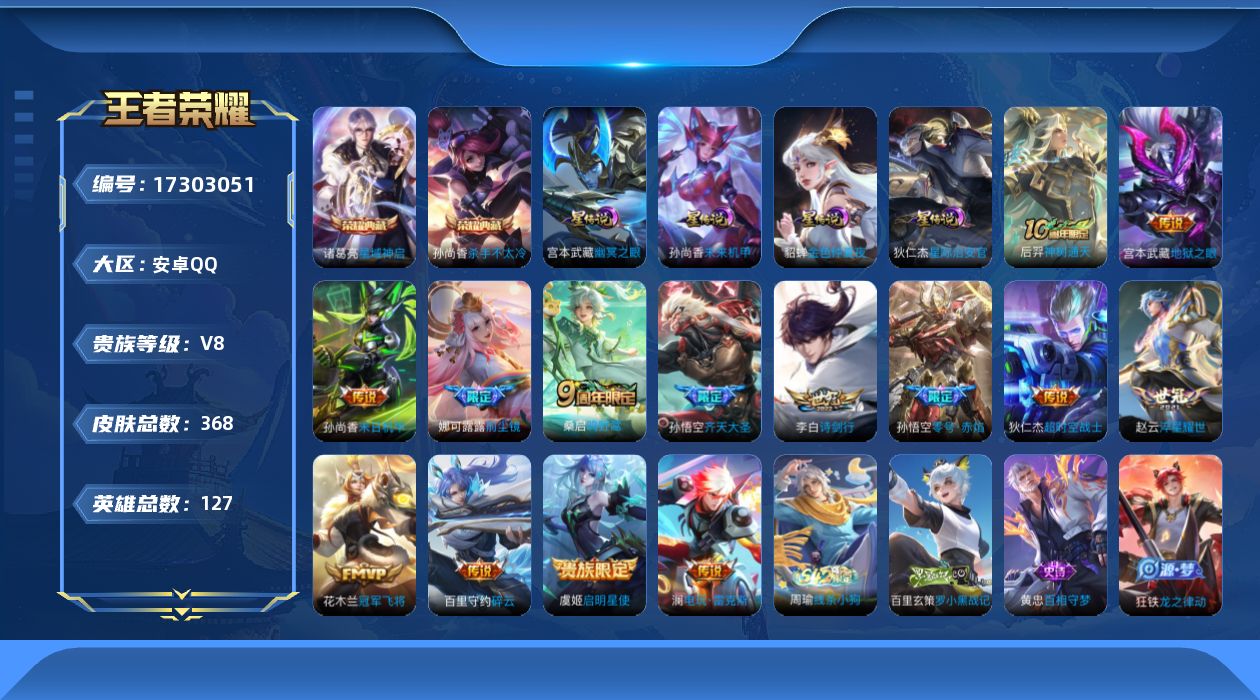 [17303051]【特价出售/店主推荐】金标后羿、金标云缨、对抗路41段、打野39段、12个银标,安卓Q-V8-至尊星耀V段位-127英雄-368皮肤-2典藏皮肤-4星传说-14传说-103史诗 【英雄全皮】:孙权全皮,狂铁全皮,影全皮 【荣耀典藏】:孙尚香杀手不太冷,诸葛亮星域神启 【传说皮肤】:后羿神树通天,桑启鸣野蒿,澜电玩雷克斯,孙悟空齐天大圣,李白诗剑行,百里守约碎云,娜可露露前尘镜,赵云淬星耀世,虞姬启明星使,孙悟空零号赤焰,花木兰冠军飞将,孙尚香末日机甲,宫本武藏地狱之眼,狄仁杰超时空战士 【限定皮肤】:姜子牙天穹之誓,狄仁杰阴阳师,赵云皇家上将,墨子神迹守卫,嬴政优雅恋人,嬴政白昼王子,鲁班七号狮舞东方,庄周高山流水,阿轲迷踪丽影,钟无艳超时空战士,扁鹊奇幻香踪,白起夜都怪侠,芈月重明,芈月幻夜卜梦,吕布猎兽之王,周瑜赤莲之焰,元歌云间偶戏,元歌无心,夏侯惇朔风刀,甄姬落雪兰心,曹操烛龙,典韦穷奇,典韦蓝屏警告,马可波罗暗影游猎,马可波罗山海玄木吟,狄仁杰魔术师,狄仁杰万华元夜,达摩星际陆战队,达摩沙漠行僧,项羽海滩派对,老夫子醍醐杖,老夫子航海奇遇记,关羽冰锋战神,程咬金演武夺筹,刘邦夺宝奇兵,韩信傲雪梅枪,王昭君午后时光,兰陵王驯魔猎人,兰陵王金庭之子,娜可露露前尘镜,亚瑟潮玩骑士王,孙悟空至尊宝,孙悟空零号赤焰,孙悟空孙行者,孙悟空齐天大圣,牛魔御旌,后羿圣弓游侠,李元芳银河之约,李元芳云中旅人,虞姬启明星使,钟馗神迹守卫,钟馗驱傩正仪,杨戬潮玩骑兵,女娲朔望之晖,干将莫邪胡桃夹子,干将莫邪真爱魔法,雅典娜单词大作战,雅典娜黎明之约,蔡文姬繁星吟游,太乙真人饕餮,鬼谷子原初探秘者,鬼谷子五谷丰年,黄忠烈魂,黄忠火炮绅士,苏烈千军破阵,百里玄策原初追逐者,百里守约朱雀志,弈星混沌棋,梦奇顽趣,沈梦溪星空之诺,沈梦溪大漠名商,明世隐疑决卦,明世隐吟游魔法,裴擒虎李小龙,裴擒虎擒涛扼浪,狂铁御狮,狂铁电玩高手,米莱狄御霄,米莱狄胡桃异想国,云中君纤云弄巧,盾山御銮,猪八戒西部大镖客,上官婉儿梁祝,嫦娥拒霜思,嫦娥暖冬兔眠,蒙犽狂想玩偶喵,鲁班大师探海日志,桑启海盐诗旅,暃星界游侠,张良古海寻踪,蒙恬荣光圣徽,鬼谷子天穹祈灯,沈梦溪龙舞盛年,刘邦剑破天穹,周瑜熔金海岸 【年限皮肤】:百里守约朱雀志,马可波罗山海玄木吟 【赛季限定】:太乙真人饕餮,曹操烛龙,芈月重明,典