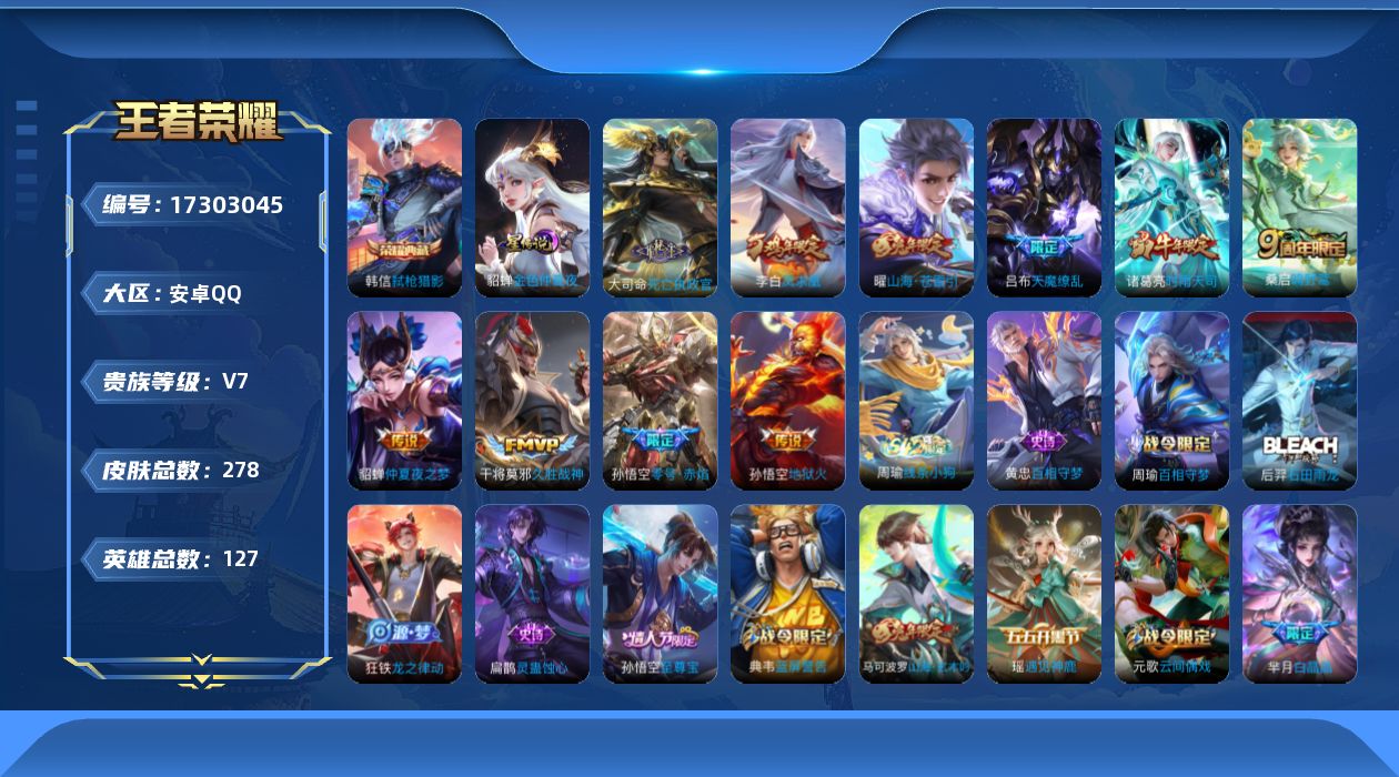 [17303045]【特价出售/店主推荐】安卓Q-V7-永恒钻石IV段位-127英雄-278皮肤-1典藏皮肤-1星传说-10传说-77史诗