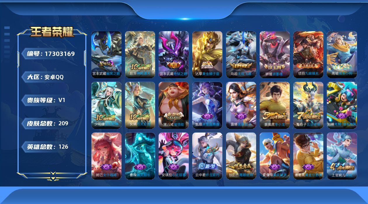 [17303169]【特价急出/详情看图】安卓Q-V1-最强王者段位-126英雄-209皮肤-1星元-4传说-46史诗【传说皮肤】:后羿神树通天,马超无双飞将,达摩黄金狮子座,宫本武藏地狱之眼【限定皮肤】:狄仁杰阴阳师,庄周高山流水,高渐离玩趣恶龙,芈月幻夜卜梦,夏侯惇朔风刀,甄姬游园惊梦,狄仁杰万华元夜,达摩沙漠行僧,项羽海滩派对,老夫子醍醐杖,程咬金演武夺筹,兰陵王金庭之子,牛魔御旌,李元芳云中旅人,钟馗驱傩正仪,干将莫邪胡桃夹子,雅典娜单词大作战,鬼谷子原初探秘者,鬼谷子五谷丰年,黄忠火炮绅士,苏烈千军破阵,百里玄策原初追逐者,弈星混沌棋,沈梦溪大漠名商,明世隐疑决卦,裴擒虎李小龙,裴擒虎擒涛扼浪,狂铁御狮,米莱狄御霄,云中君纤云弄巧,盾山御銮,猪八戒猪悟能,上官婉儿梁祝,蒙犽狂想玩偶喵,鲁班大师探海日志,桑启海盐诗旅,阿古朵江河有灵,张良古海寻踪,蒙恬荣光圣徽,鬼谷子天穹祈灯,沈梦溪龙舞盛年,刘邦剑破天穹