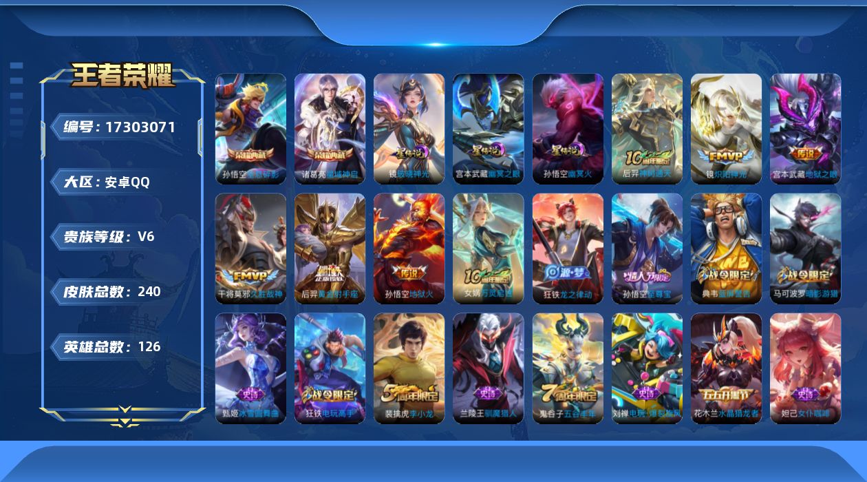 [17303071]可二次【特价出售/店主推荐安卓】安卓Q-V6-永恒钻石III段位-126英雄-240皮肤-2典藏皮肤-3星传说-6传说-48史诗