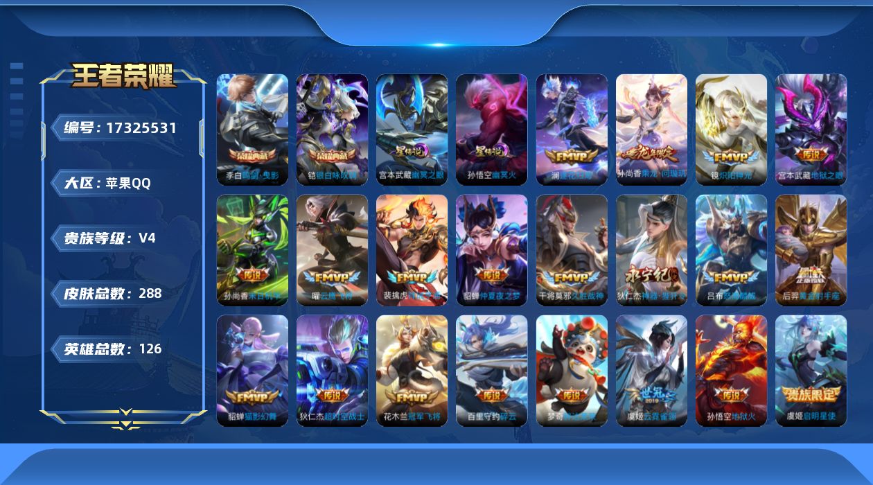 [17325531]【特价出售/店主推荐,发育路25段,中路20段,9市标】苹果Q-V4-永恒钻石I段位-126英雄-288皮肤-2典藏皮肤-2星传说-20传说-78史诗 【英雄全皮】:影全皮 【荣耀典藏】:李白鸣剑曳影,铠银白咏叹调 【传说皮肤】:裴擒虎祥瑞亨通,孙尚香乘龙问璇玑,澜逐花归海,吕布怒海麟威,狄仁杰神器狴犴令,百里守约碎云,镜炽阳神光,虞姬启明星使,曜云鹰飞将,貂蝉猫影幻舞,干将莫邪久胜战神,虞姬云霓雀翎,花木兰冠军飞将,梦奇胖达荣荣,后羿黄金射手座,貂蝉仲夏夜之梦,孙尚香末日机甲,宫本武藏地狱之眼,孙悟空地狱火,狄仁杰超时空战士 【限定皮肤】:白起狰,狄仁杰阴阳师,赵云皇家上将,孙尚香蔷薇恋人,钟无艳王者之锤,扁鹊奇幻香踪,芈月重明,元歌无心,夏侯惇朔风刀,曹操烛龙,典韦穷奇,马可波罗暗影游猎,狄仁杰魔术师,狄仁杰万华元夜,狄仁杰神器狴犴令,项羽海滩派对,老夫子醍醐杖,程咬金演武夺筹,韩信飞衡,韩信傲雪梅枪,孙悟空至尊宝,牛魔御旌,后羿辉光之辰,刘备百相守梦,李元芳云中旅人,虞姬启明星使,钟馗驱傩正仪,杨戬潮玩骑兵,干将莫邪冰霜恋舞曲,太乙真人饕餮,鬼谷子原初探秘者,鬼谷子五谷丰年,黄忠烈魂,百里守约朱雀志,弈星混沌棋,明世隐疑决卦,裴擒虎李小龙,裴擒虎擒涛扼浪,狂铁御狮,米莱狄御霄,云中君纤云弄巧,盾山御銮,猪八戒西部大镖客,上官婉儿梁祝,嫦娥暖冬兔眠,鲁班大师探海日志,桑启海盐诗旅,暃星界游侠,张良古海寻踪,蒙犽百解令,蒙恬荣光圣徽,高渐离燃音魔法,妲己灵卜魔法,鬼谷子天穹祈灯,孙尚香乘龙问璇玑,沈梦溪龙舞盛年,刘邦剑破天穹,周瑜熔金海岸 【年限皮肤】:后羿辉光之辰,百里守约朱雀志,韩信飞衡,孙尚香乘龙问璇玑 【赛季限定】:白起狰,太乙真人饕餮,曹操烛龙,芈月重明,典韦穷奇,狂铁御狮,米莱狄御霄,牛魔御旌,盾山御銮,夏侯惇朔风刀,弈星混沌棋,明世隐疑决卦,老夫子醍醐杖,鬼谷子原初探秘者,狄仁杰万华元夜,程咬金演武夺筹,钟馗驱傩正仪,李元芳云中旅人,桑启海盐诗旅,裴擒虎擒涛扼浪,鲁班大师探海日志,张良古海寻踪,鬼谷子天穹祈灯,刘邦剑破天穹,太乙真人谧流熔炉,钟馗虚灵犬护,蒙恬荣光圣徽,项羽九幽镇关 【战令限定】:马可波罗暗影游猎,猪八戒西部大镖客,暃星界游侠,嫦娥暖冬兔眠,扁鹊奇幻香踪,杨戬潮玩骑兵,高渐离燃音魔法,妲己灵卜魔法,周瑜线条小狗 【史诗皮肤】:鲁班七