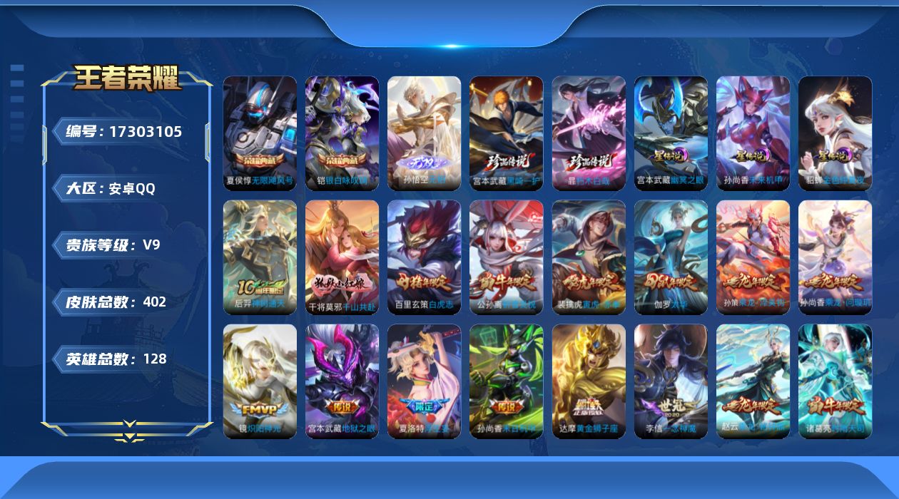 [17303105]【特价出售/店主推荐】安卓Q-V9-尊贵铂金IV段位-128英雄-402皮肤-2典藏皮肤-1无双-2珍品传说-3星传说-40传说-127史诗