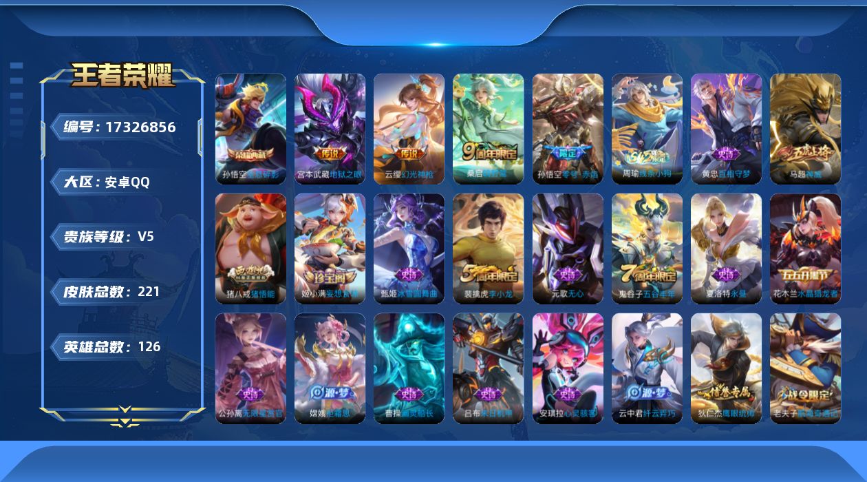 [17326856]安卓Q-V5-至尊星耀V段位-126英雄-221皮肤-1典藏皮肤-4传说-48史诗【荣耀典藏】:孙悟空全息碎影【传说皮肤】:云缨幻光神枪,桑启鸣野蒿,孙悟空零号赤焰,宫本武藏地狱之眼【限定皮肤】:姜子牙天穹之誓,狄仁杰阴阳师,赵云皇家上将,墨子神迹守卫,孙尚香蔷薇恋人,庄周高山流水,高渐离死亡摇滚,钟无艳超时空战士,元歌无心,甄姬落雪兰心,狄仁杰万华元夜,达摩沙漠行僧,项羽海滩派对,老夫子航海奇遇记,程咬金演武夺筹,兰陵王金庭之子,孙悟空零号赤焰,后羿圣弓游侠,李元芳云中旅人,钟馗驱傩正仪,干将莫邪胡桃夹子,干将莫邪真爱魔法,雅典娜单词大作战,太乙真人华丽摇滚,鬼谷子原初探秘者,鬼谷子五谷丰年,苏烈千军破阵,百里玄策原初追逐者,梦奇顽趣,沈梦溪大漠名商,裴擒虎李小龙,裴擒虎擒涛扼浪,云中君纤云弄巧,猪八戒猪悟能,上官婉儿梁祝,嫦娥拒霜思,蒙犽狂想玩偶喵,鲁班大师探海日志,桑启海盐诗旅,阿古朵江河有灵,张良古海寻踪,鬼谷子天穹祈灯,姬小满妄想食味,沈梦溪龙舞盛年,刘邦剑破天穹,程咬金群星魔术团,镜青焰无极,项羽苍威无极,周瑜熔金海岸