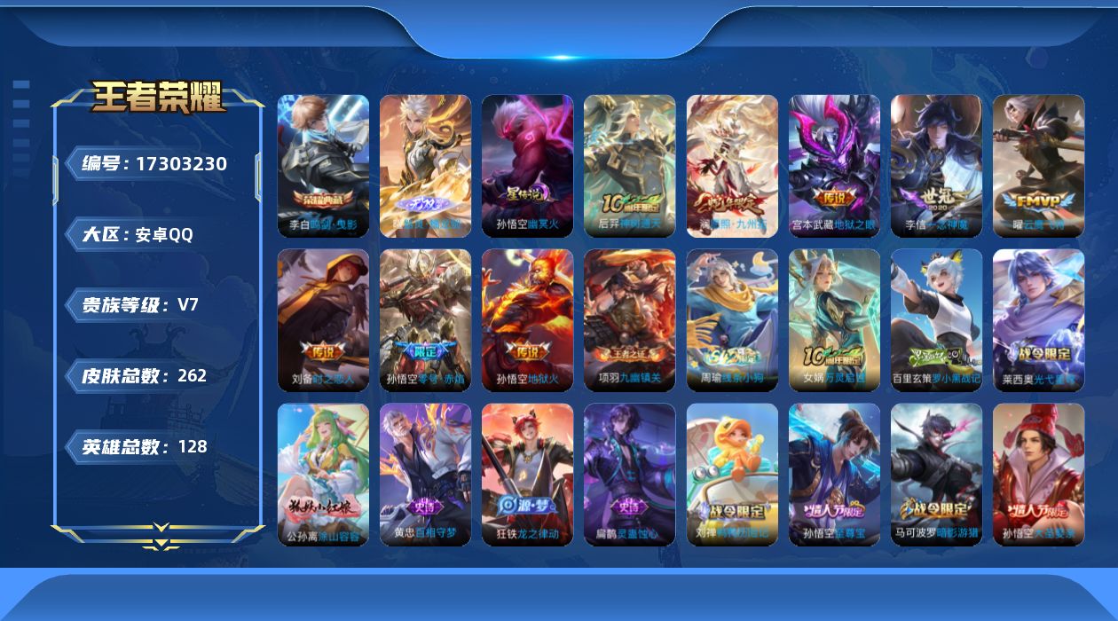 [17303230]【特价出售/店主推荐】打野31段,安卓Q-V7-最强王者段位-128英雄-262皮肤-1典藏皮肤-1无双-2星传说-8传说-74史诗