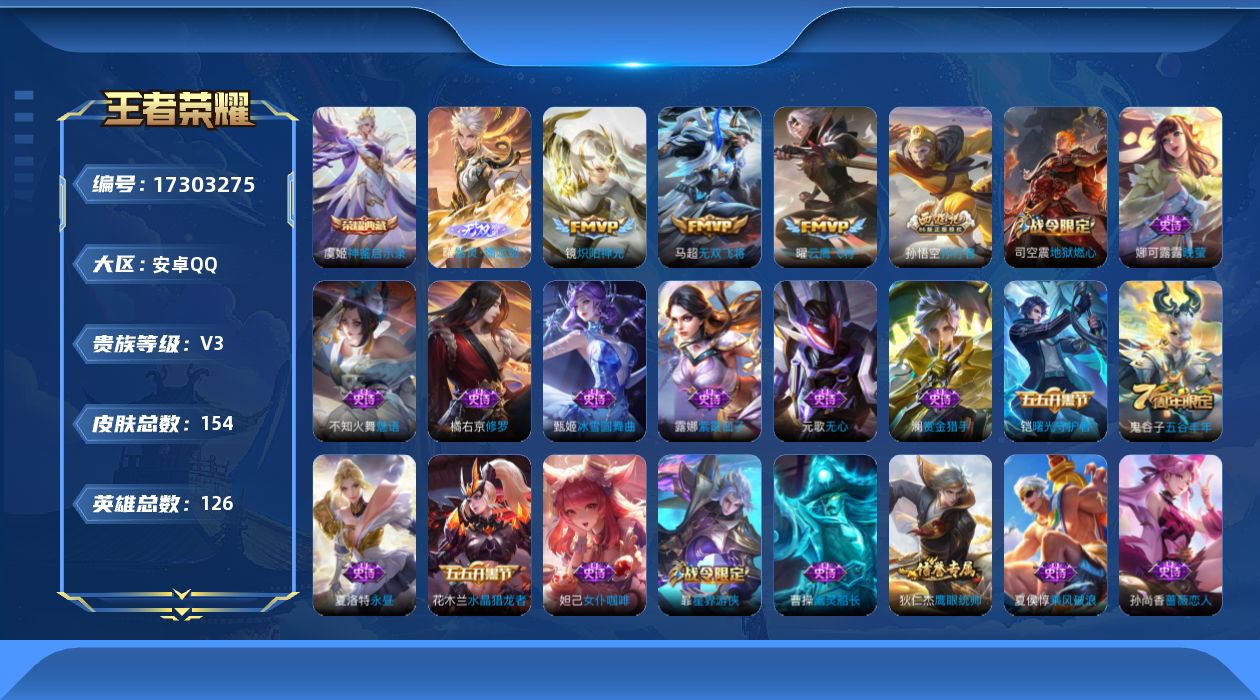 [17303275]【特价出售/店主推荐 对抗路26段 】安卓Q-V3-至尊星耀IV段位-126英雄-154皮肤-1典藏皮肤-1无双-3传说-47史诗