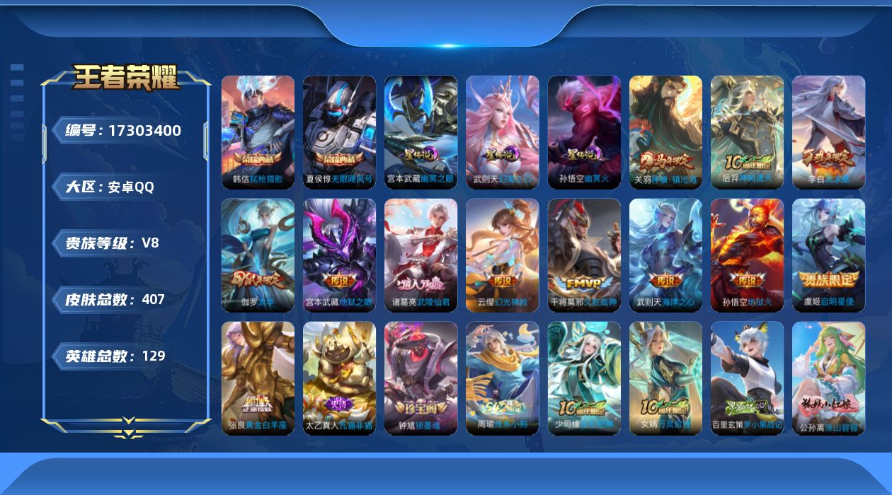 [17303400]【特价出售/店主推荐/2市标/6716星币】:安卓Q-V8-荣耀黄金I段位-129英雄-407皮肤-2典藏皮肤-1典藏英雄-3星元-12传说-114史诗
