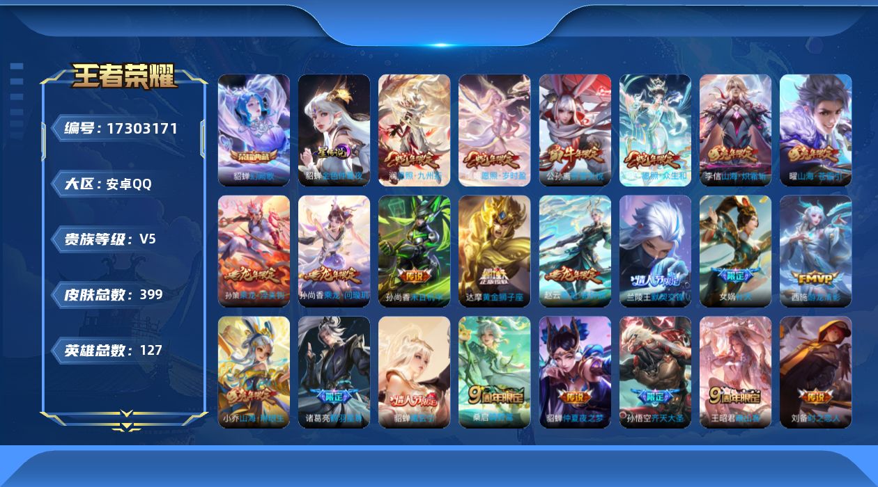 [17303171]【店主推荐捡漏号!可直接换绑】安卓Q-V5-至尊星耀V段位-127英雄-399皮肤-1典藏皮肤-1星传说-35传说-140史诗 【英雄全皮】:上官婉儿全皮,敖隐全皮,金蝉全皮,赵怀真全皮,影全皮 【荣耀典藏】:貂蝉幻阙歌 【传说皮肤】:妲己愿照众生和,澜愿照九州拓,虞姬愿照岁时盈,王昭君映山客,桑启鸣野蒿,貂蝉曦玄引,孙尚香乘龙问璇玑,孙策乘龙淬吴钩,赵云乘龙铭钟鼎,上官婉儿妄想奇谈,马可波罗妄想实况,东皇太一灼幽烈阳,诸葛亮鹤羽星尊,干将莫邪画中仙,虞姬无限倾心,项羽无限倾心,伽罗炽翼辉光,孙悟空齐天大圣,小乔山海琳琅生,曜山海苍雷引,李信山海炽霜斩,女娲补天,王昭君乞巧织情,西施游龙清影,小乔音你心动,兰陵王默契交锋,公孙离祈雪灵祝,铠绛天战甲,虞姬启明星使,刘备时之恋人,张良黄金白羊座,达摩黄金狮子座,貂蝉仲夏夜之梦,孙尚香末日机甲,狄仁杰超时空战士 【限定皮肤】:蒙犽顽岩魄,蔡文姬夏日便利店,虞姬夏日便利店,姜子牙天穹之誓,狄仁杰阴阳师,小乔山海琳琅生,赵云皇家上将,赵云引擎之心,赵云龙胆,墨子降魔,妲己时之彼端,嬴政白昼王子,孙尚香蔷薇恋人,庄周玄嵩,高渐离玩趣恶龙,阿轲迷踪丽影,钟无艳超时空战士,孙膑天狼运算者,扁鹊奇幻香踪,芈月白晶晶,元歌云间偶戏,元歌无心,甄姬幽恒,甄姬游园惊梦,甄姬落雪兰心,典韦蓝屏警告,马可波罗山海玄木吟,马可波罗妄想实况,狄仁杰魔术师,项羽海滩派对,项羽无限倾心,关羽冰锋战神,貂蝉逐梦之音,安琪拉魔法小厨娘,韩信飞衡,王昭君午后时光,兰陵王默契交锋,兰陵王金庭之子,花木兰默契交锋,亚瑟潮玩骑士王,孙悟空美猴王,孙悟空齐天大圣,后羿辉光之辰,张飞虎魄,李元芳匿光侦查者,李元芳云中旅人,虞姬启明星使,虞姬无限倾心,杨玉环寅虎心曲,杨戬潮玩骑兵,女娲补天,干将莫邪画中仙,鬼谷子五谷丰年,诸葛亮鹤羽星尊,大乔白鹤梁神女,黄忠烈魂,百里守约朱雀志,公孙离祈雪灵祝,公孙离玉兔公主,沈梦溪大漠名商,沈梦溪匿光破解者,裴擒虎擒涛扼浪,瑶山海碧波行,云中君纤云弄巧,李信山海炽霜斩,伽罗炽翼辉光,盾山梦圆繁星,猪八戒西部大镖客,上官婉儿梁祝,上官婉儿天狼绘梦者,上官婉儿神器万象笔,上官婉儿妄想奇谈,嫦娥如梦令,嫦娥拒霜思,嫦娥暖冬兔眠,曜山海苍雷引,西施玲珑珍味,西施至美乘鲤谣,鲁班大师探海日志,盘古冰霜神祇,桑启海盐诗旅,金蝉唐三藏,暃星界游